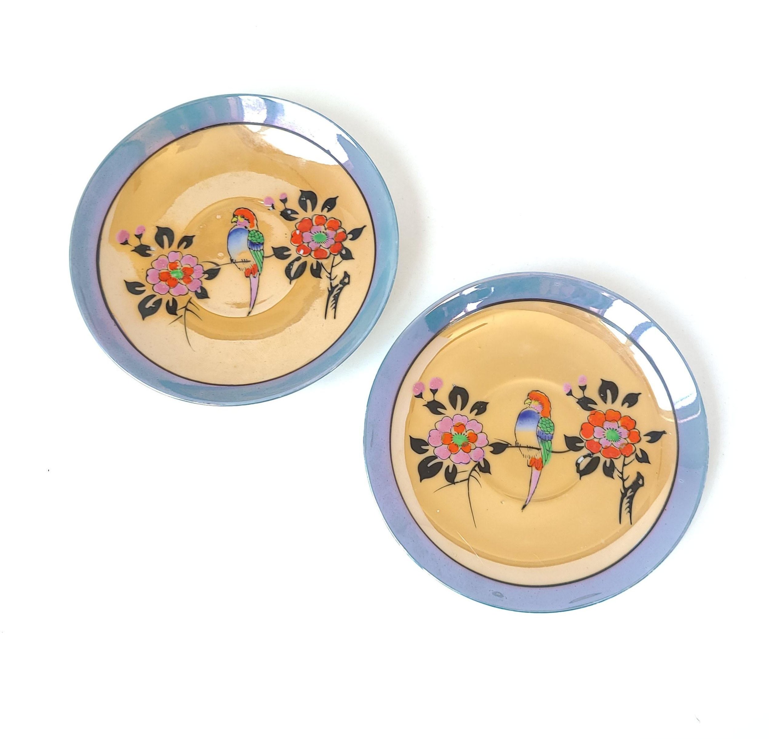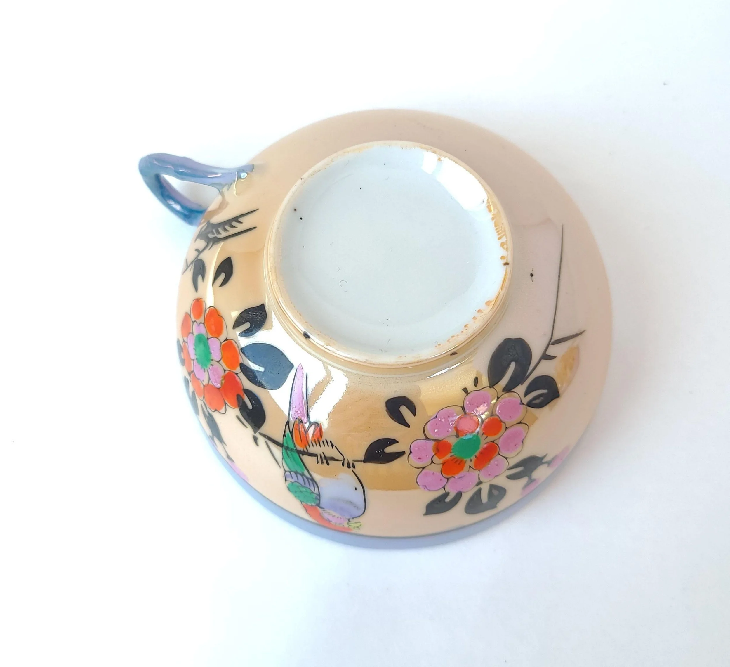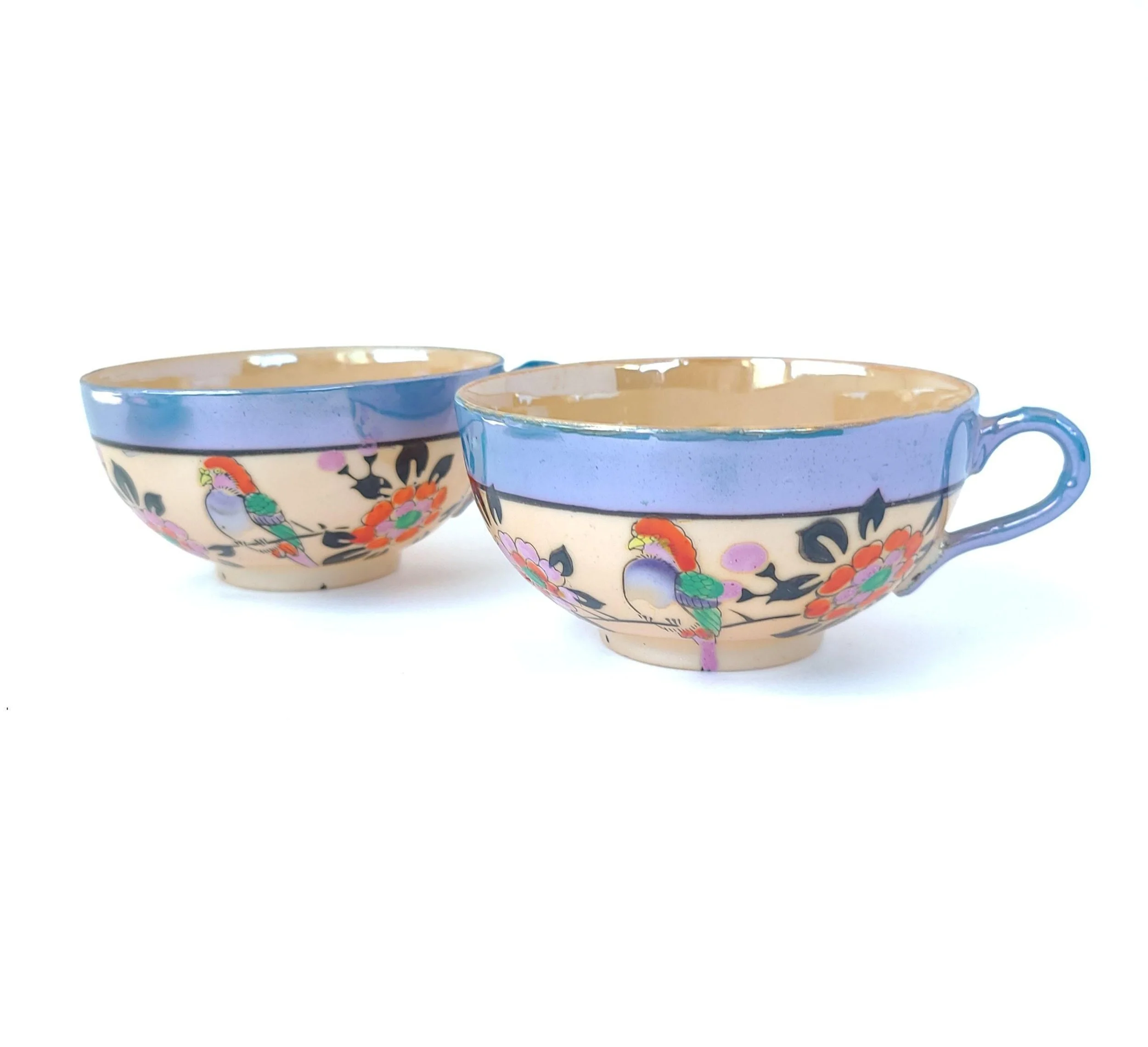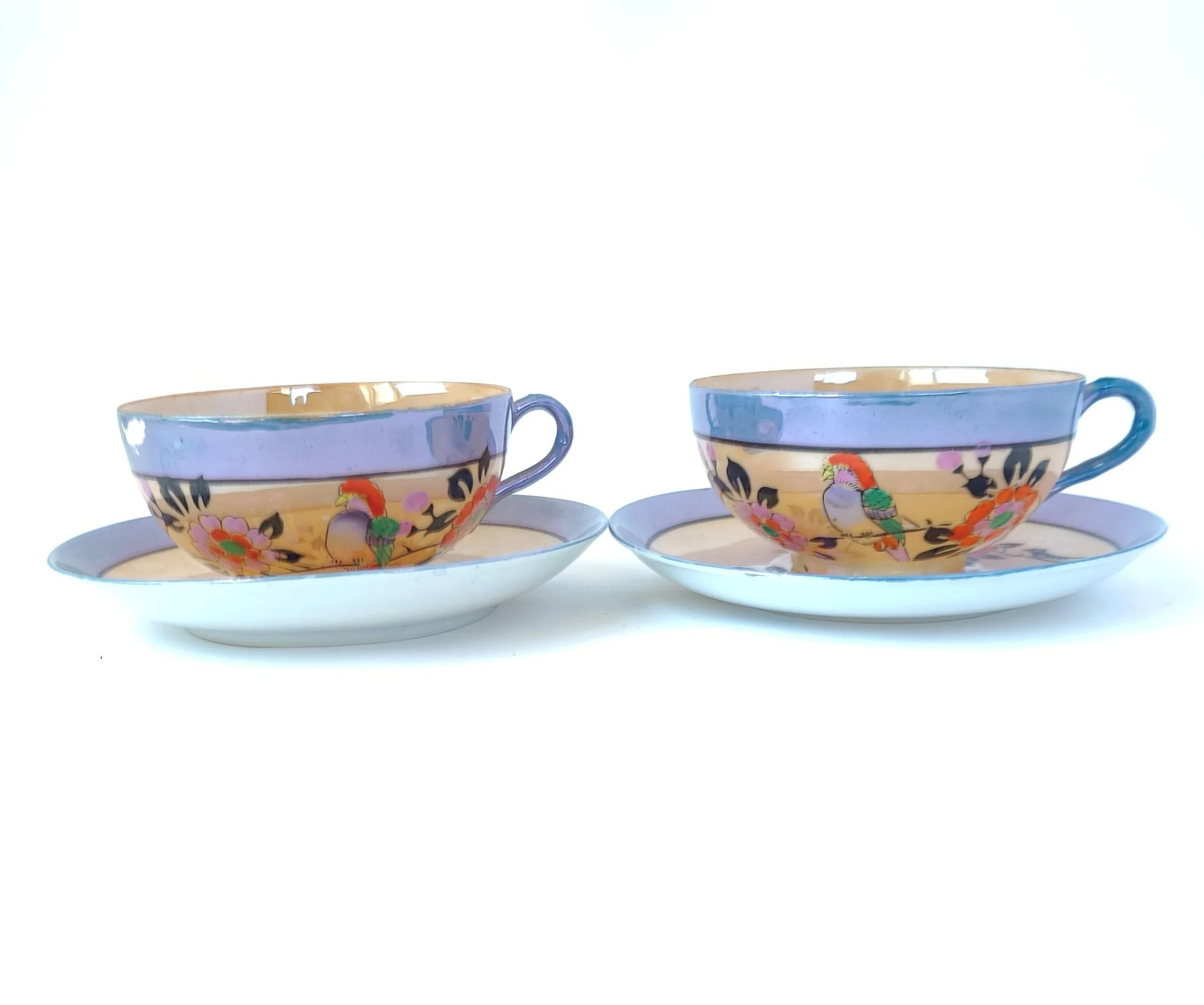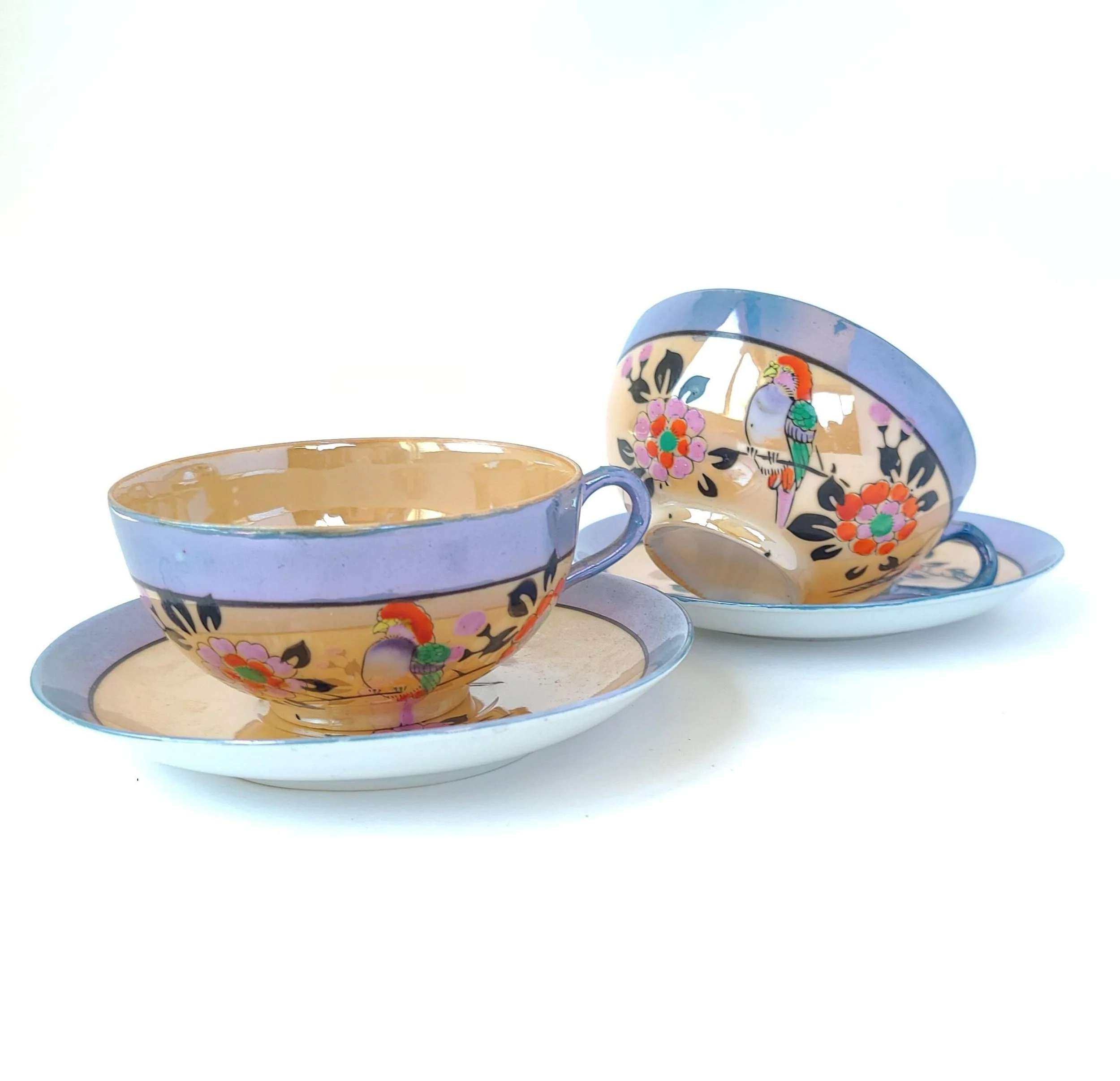 Lusterware Teacup Set: Parrot & Flower Design - Made in Japan