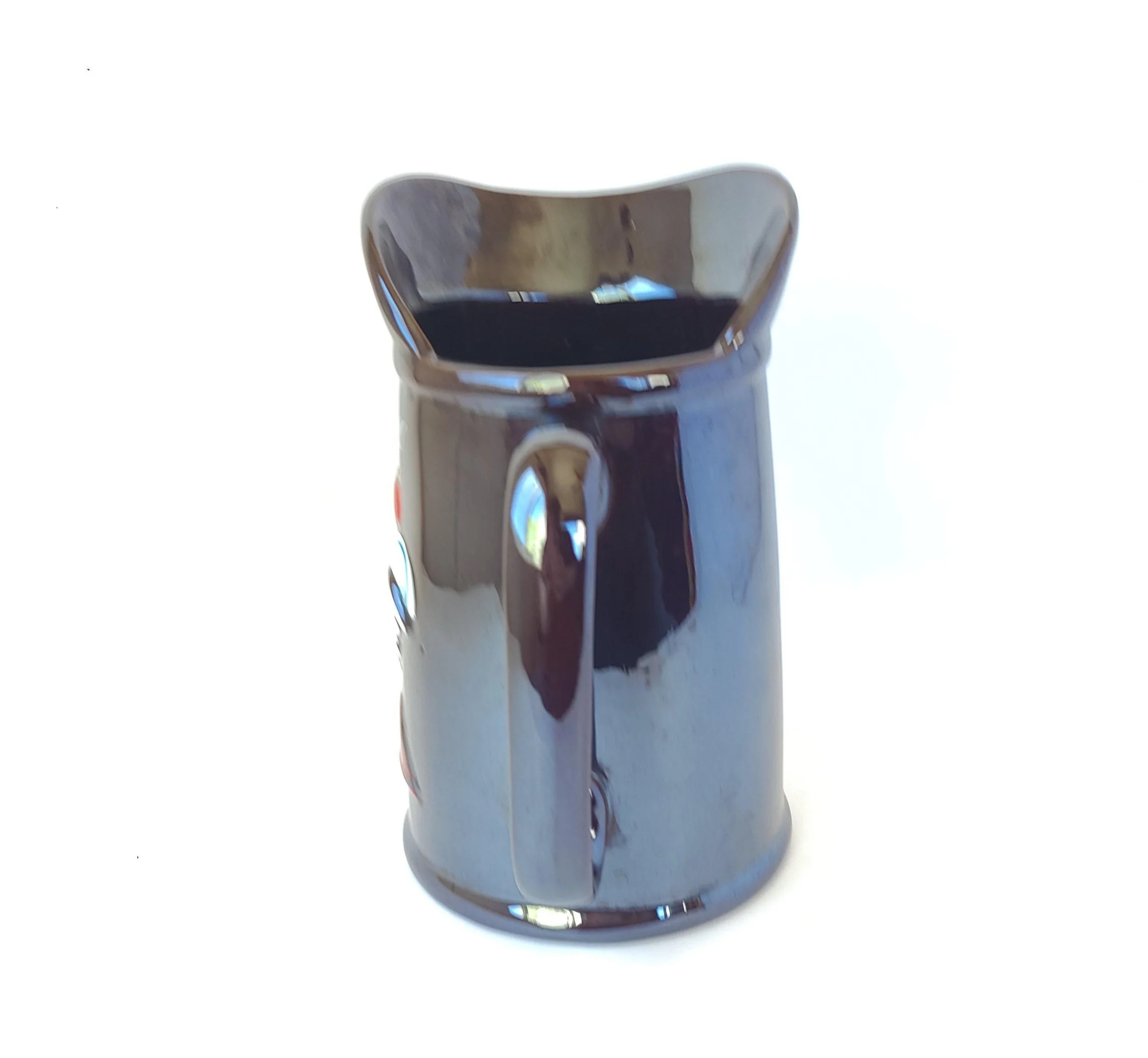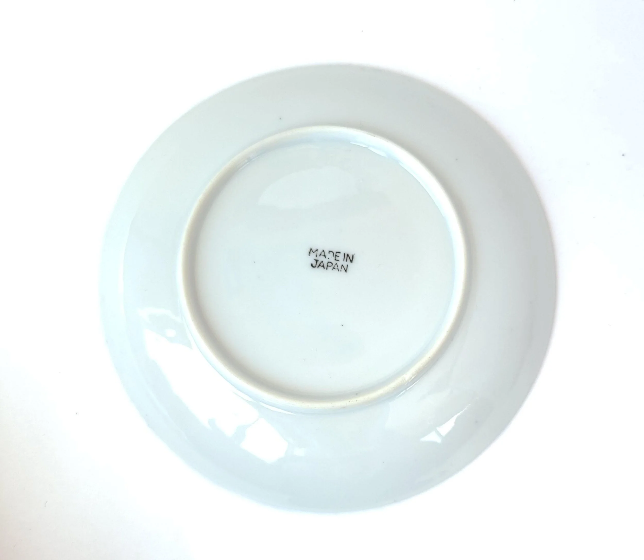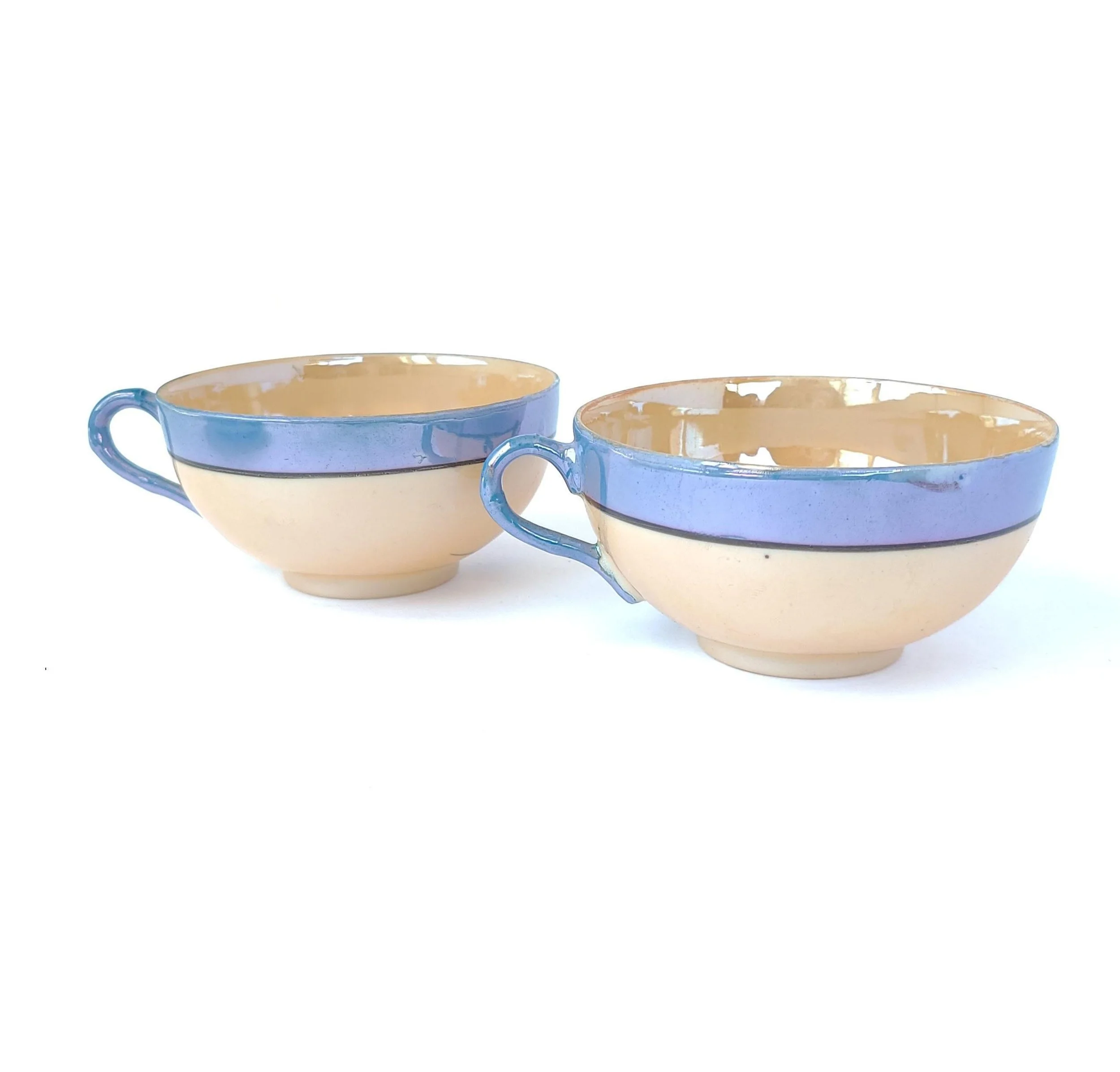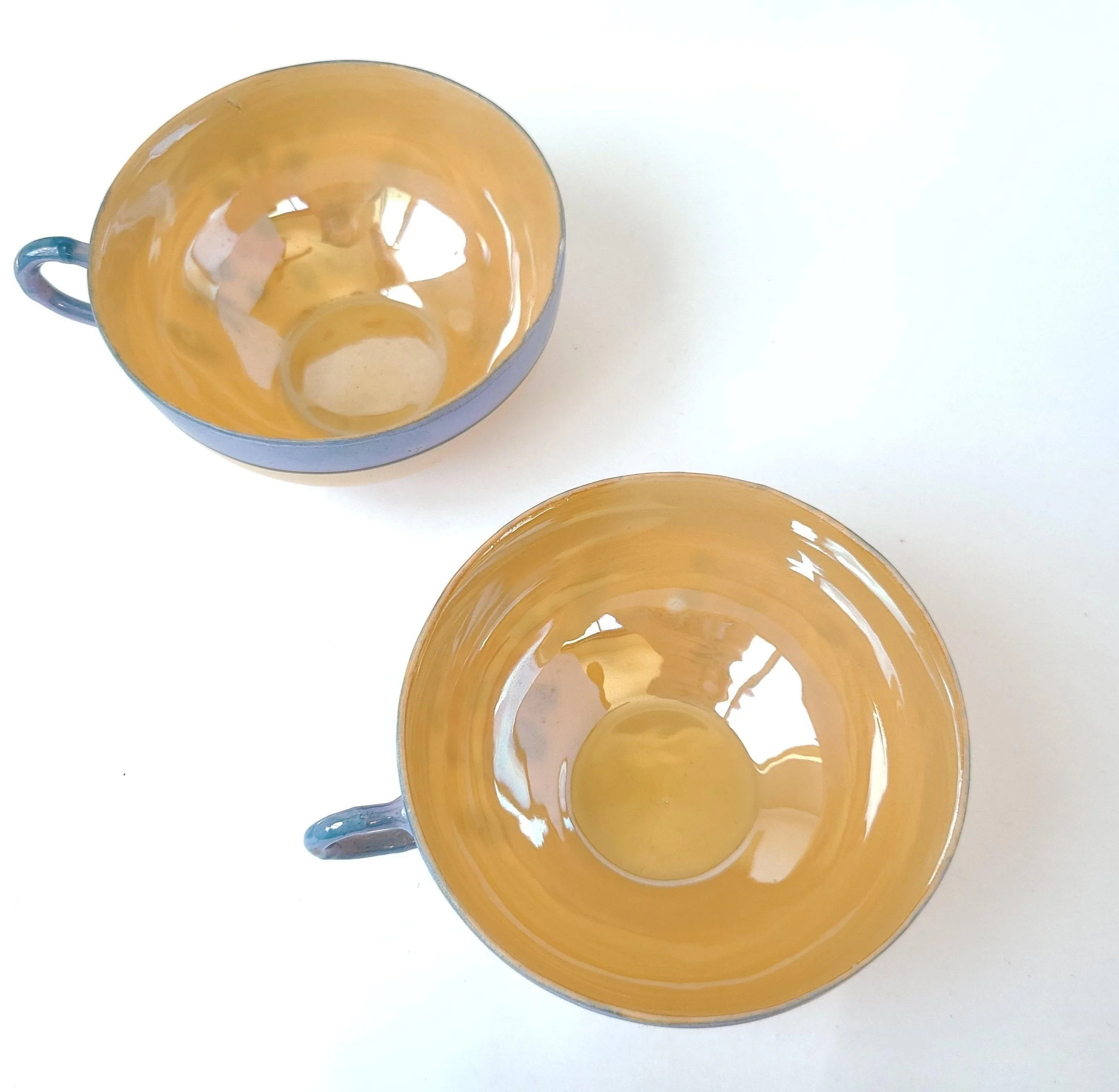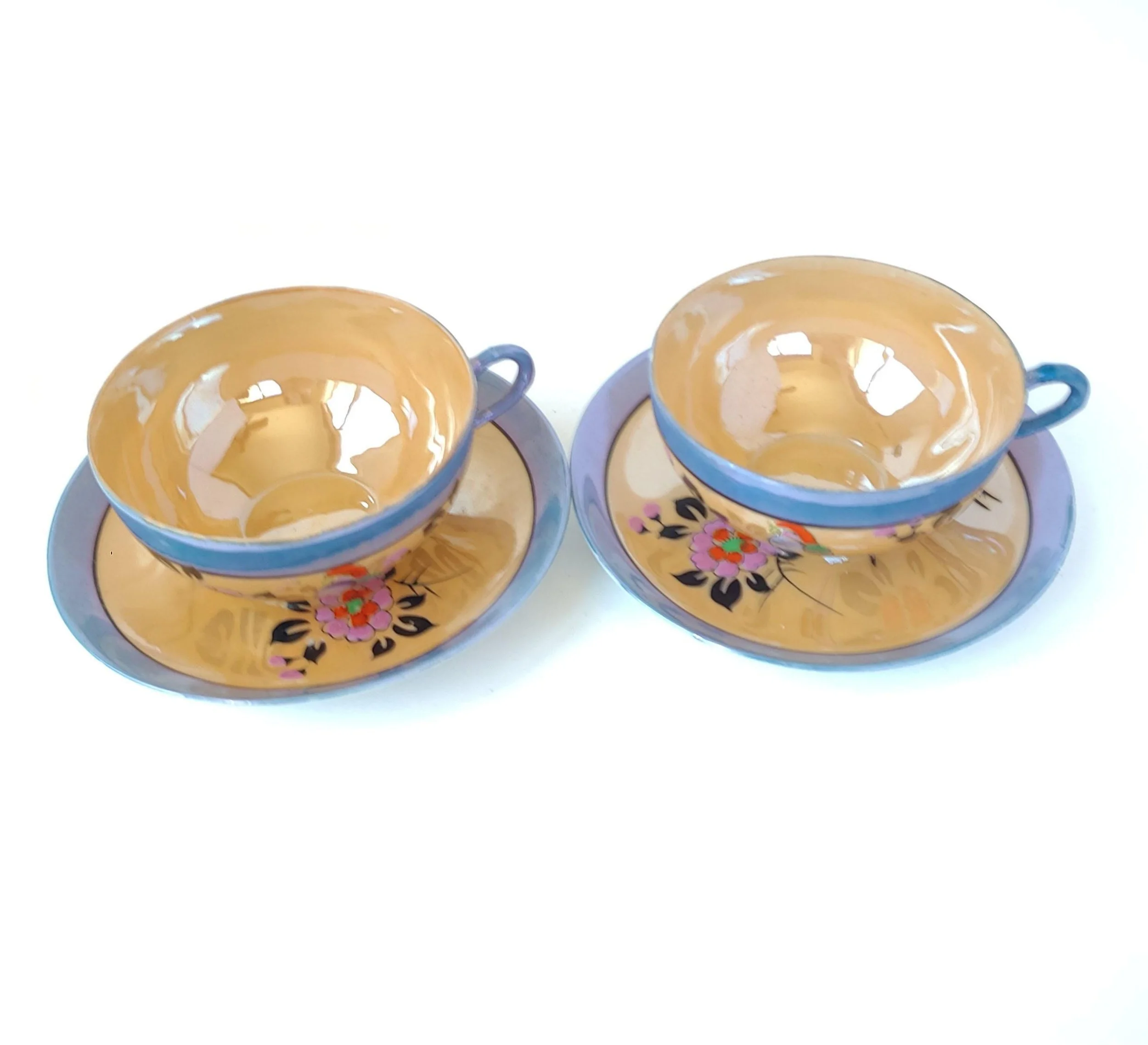 These gorgeous vintage teacups and saucers are made from thin, lightweight china with a pearly lusterware glaze in blue and orange. They have been hand painted with a vibrant flower and parrot design in rich shades of pink, green and orange with black details. All pieces are in good used condition with one small superficial chip to the inside of one cup, but no major chips or cracks. There are some light scratches and a few small spots of discoloration and color loss, but the pieces have excellent overall color quality.