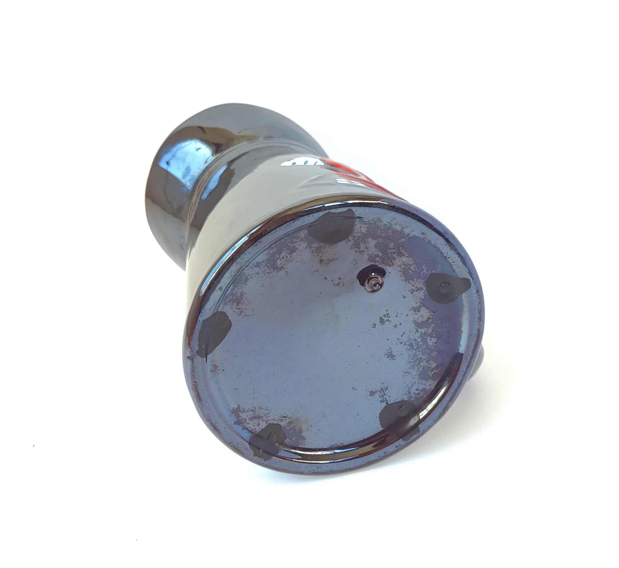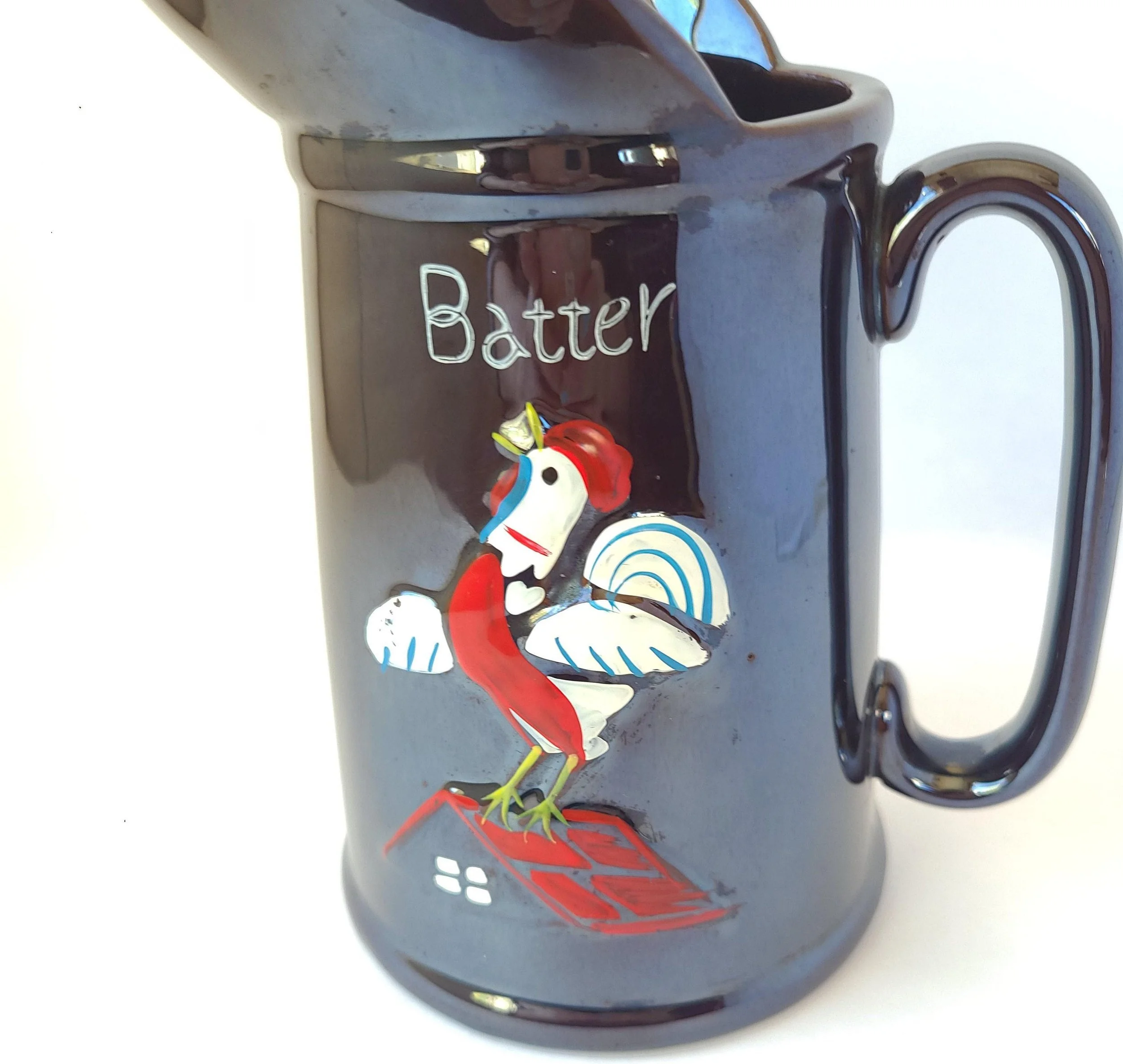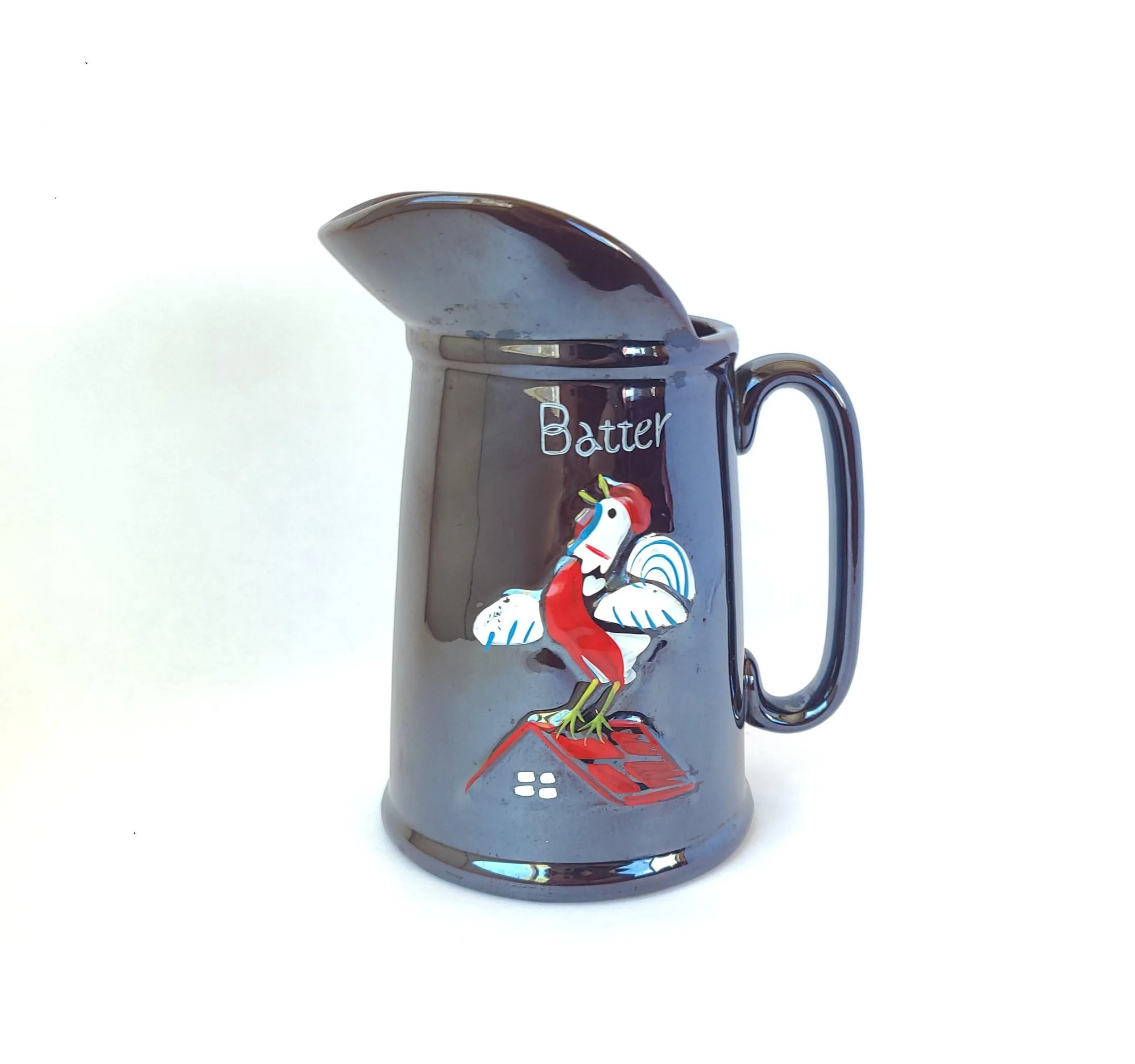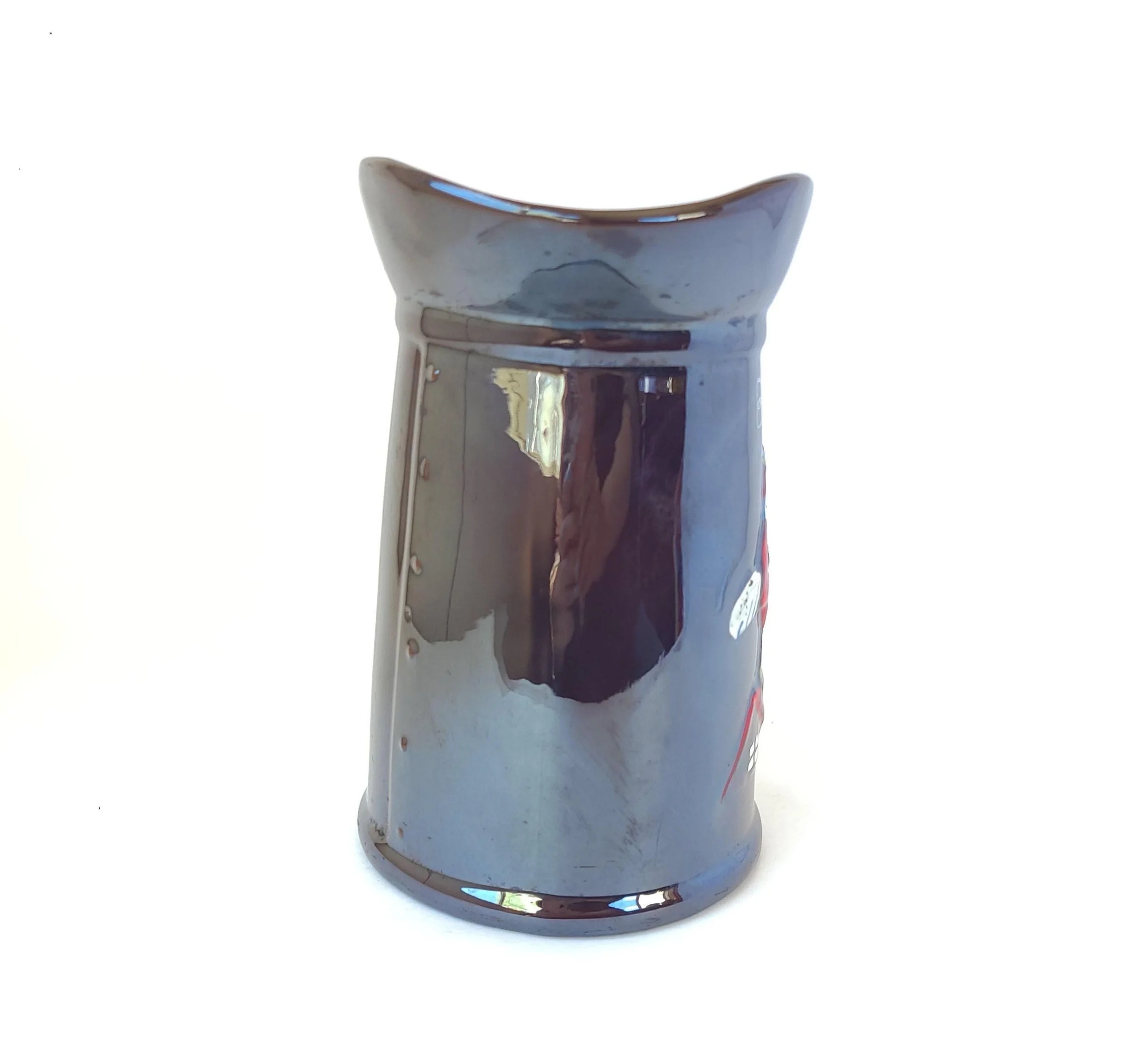 These gorgeous vintage teacups and saucers are made from thin, lightweight china with a pearly lusterware glaze in blue and orange. They have been hand painted with a vibrant flower and parrot design in rich shades of pink, green and orange with black details. All pieces are in good used condition with one small superficial chip to the inside of one cup, but no major chips or cracks. There are some light scratches and a few small spots of discoloration and color loss, but the pieces have excellent overall color quality.