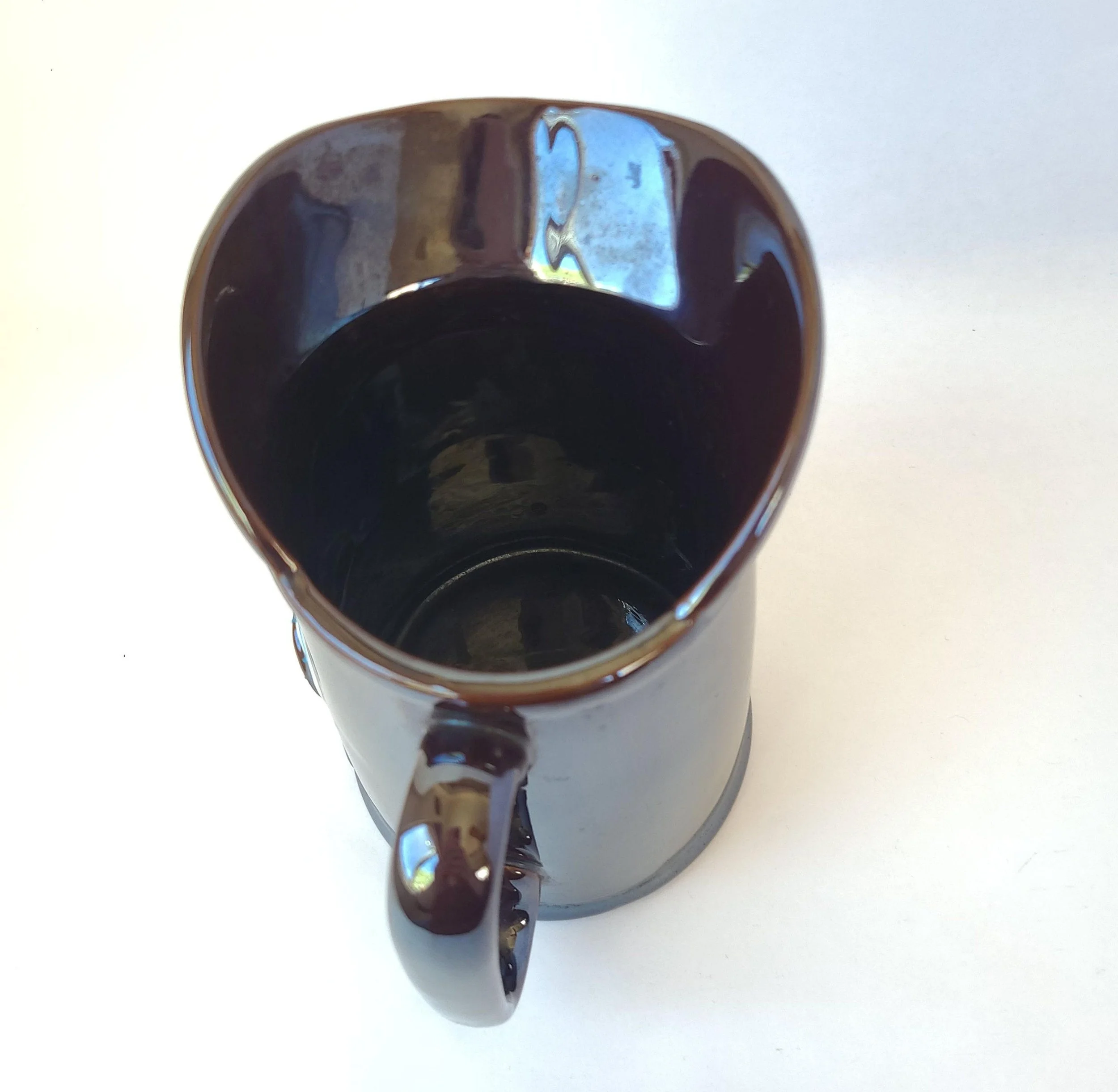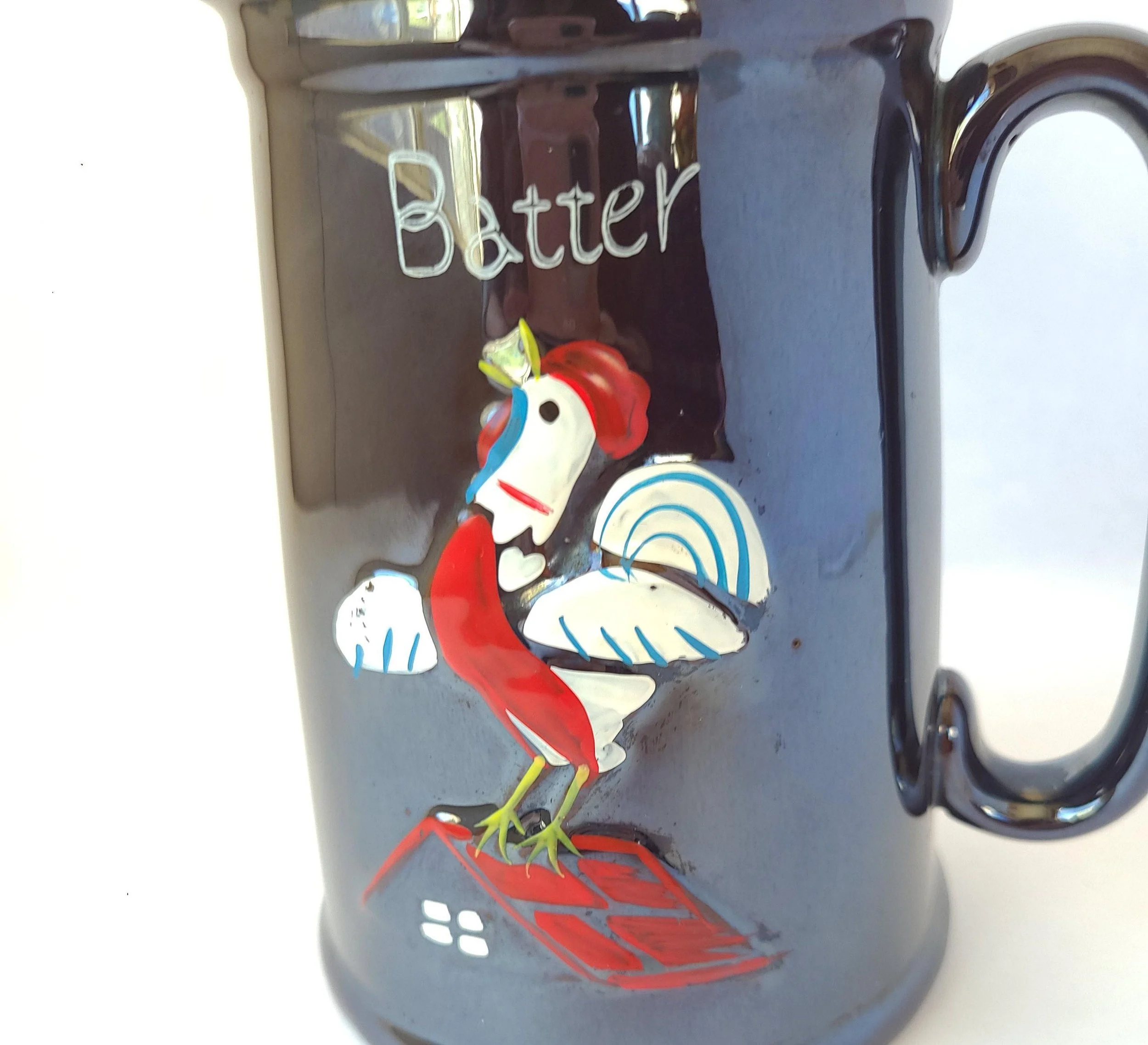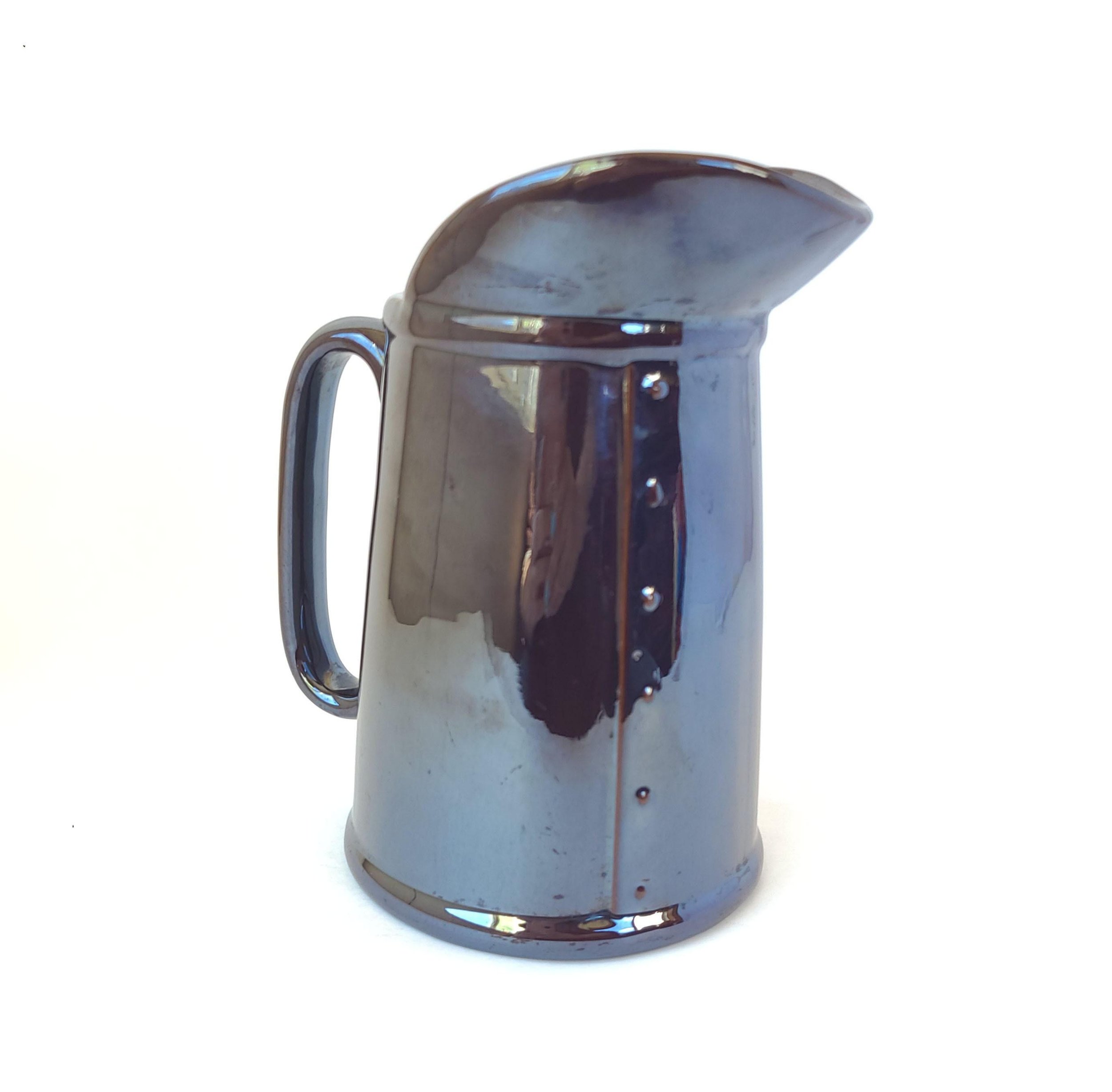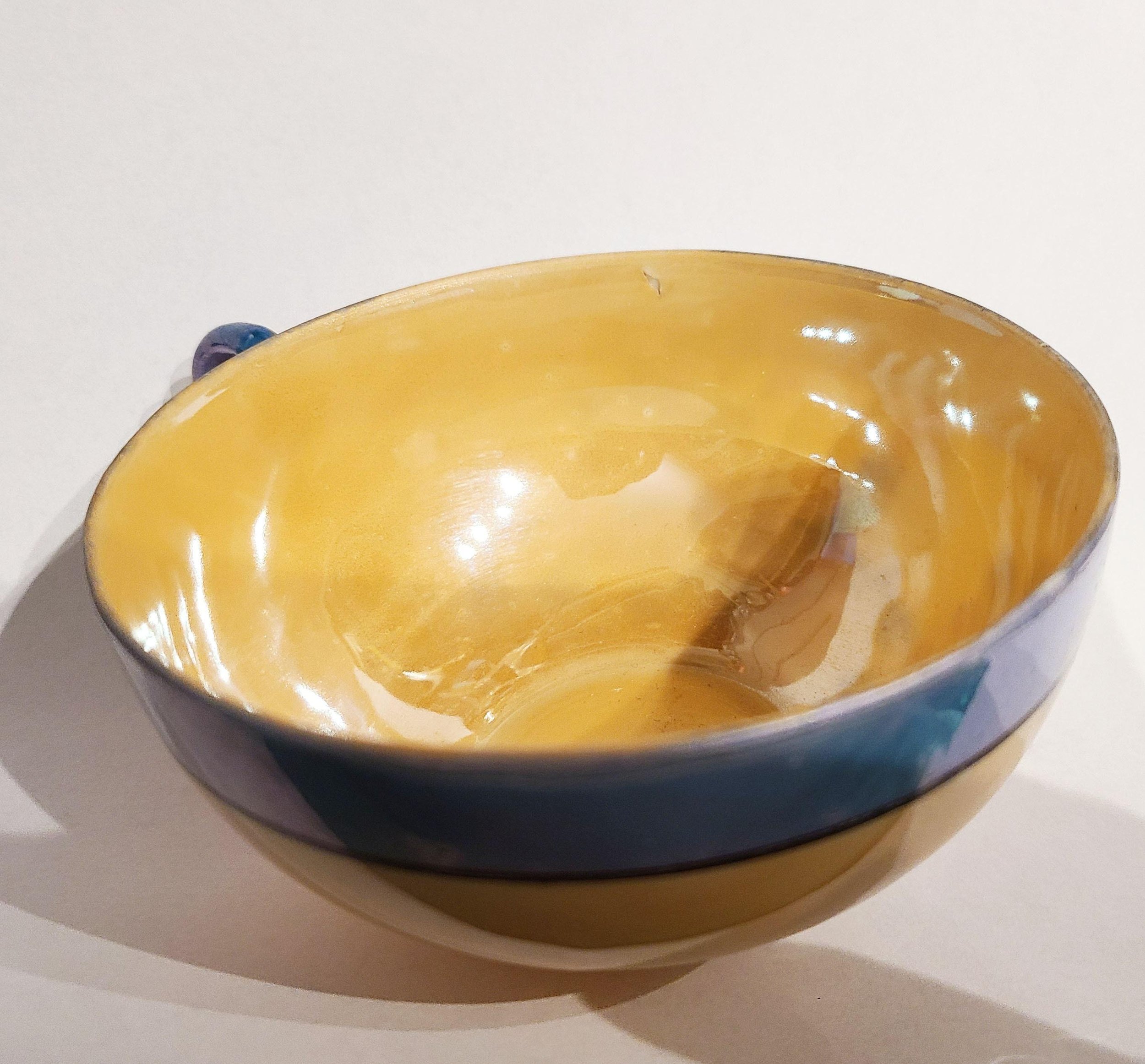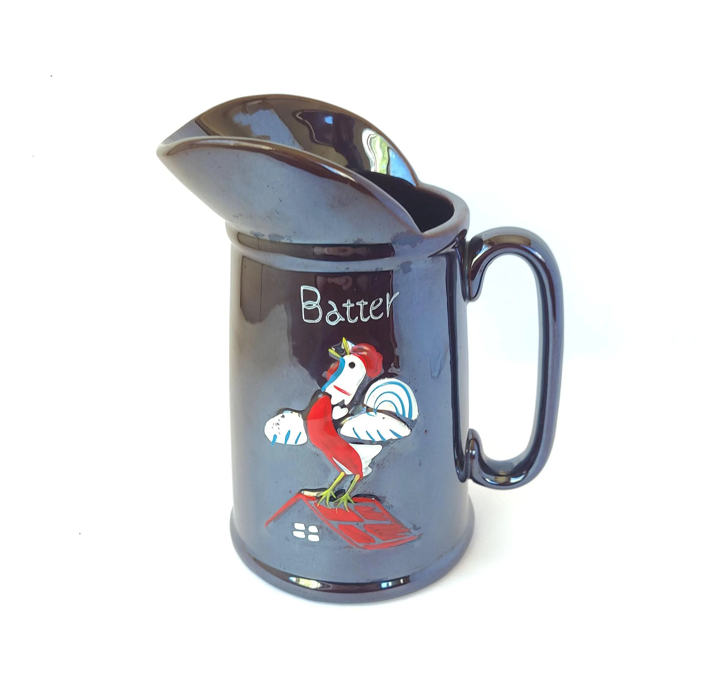 These gorgeous vintage teacups and saucers are made from thin, lightweight china with a pearly lusterware glaze in blue and orange. They have been hand painted with a vibrant flower and parrot design in rich shades of pink, green and orange with black details. All pieces are in good used condition with one small superficial chip to the inside of one cup, but no major chips or cracks. There are some light scratches and a few small spots of discoloration and color loss, but the pieces have excellent overall color quality.