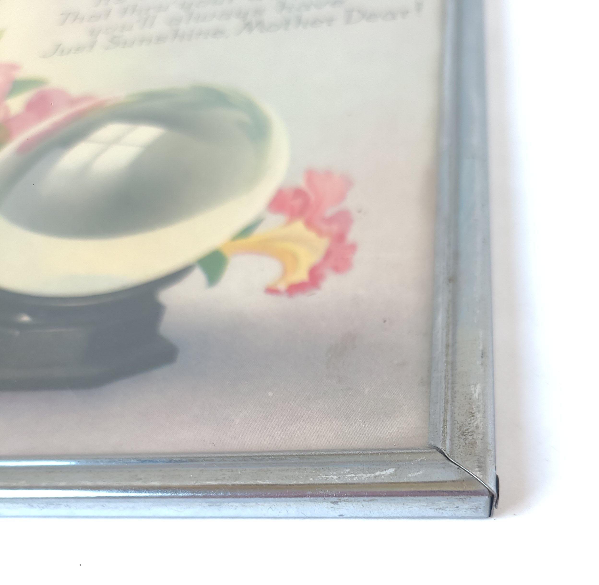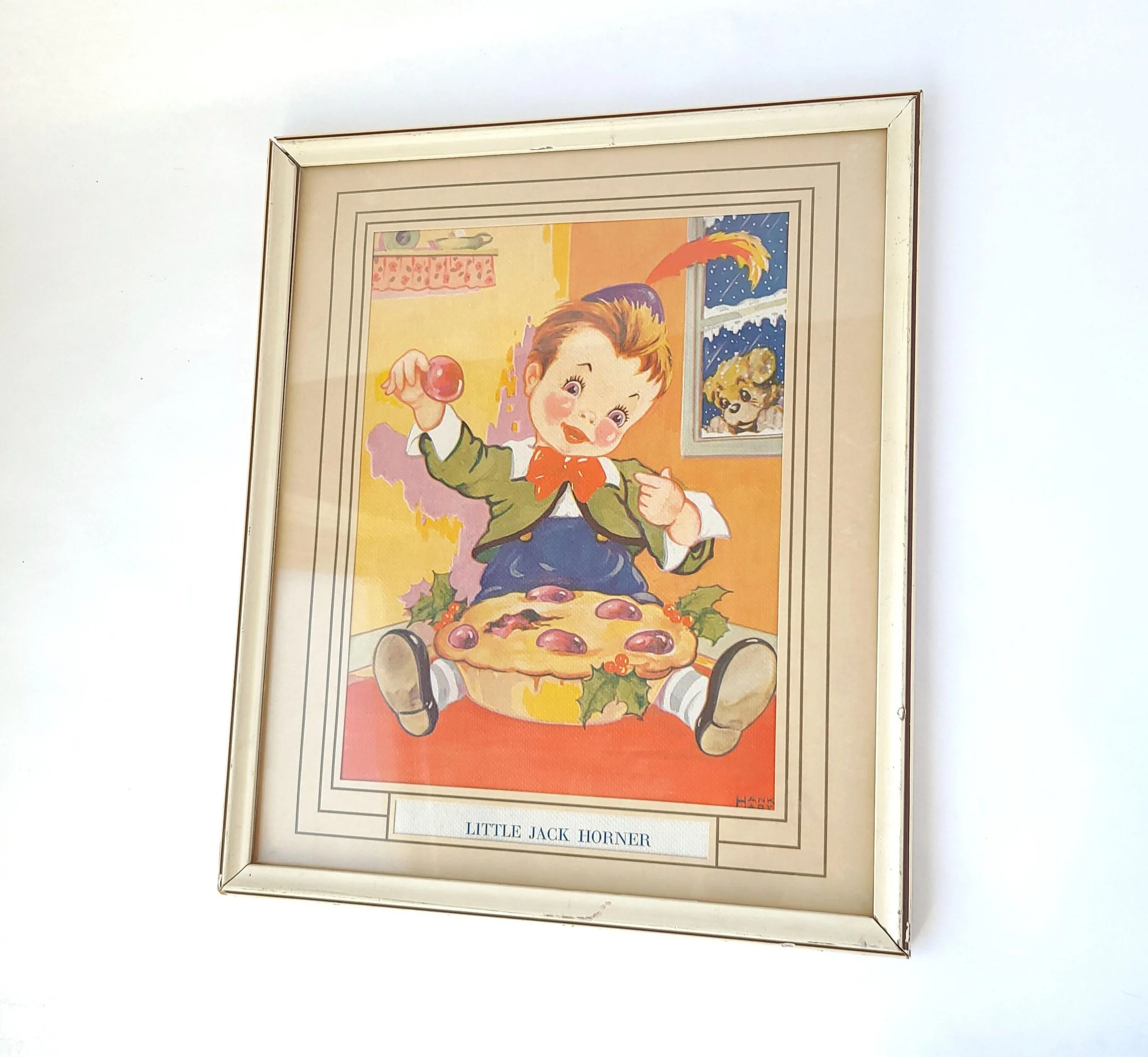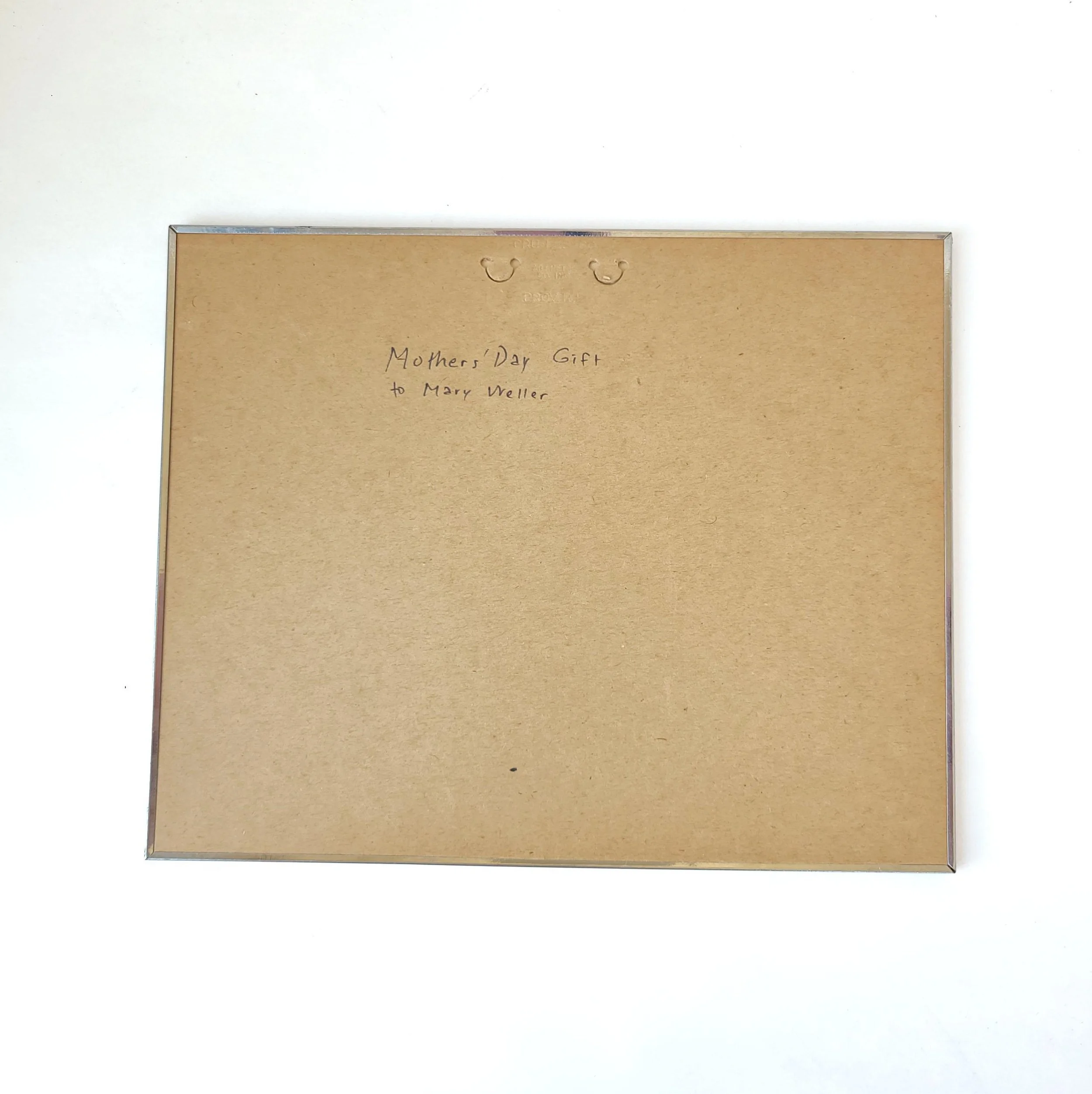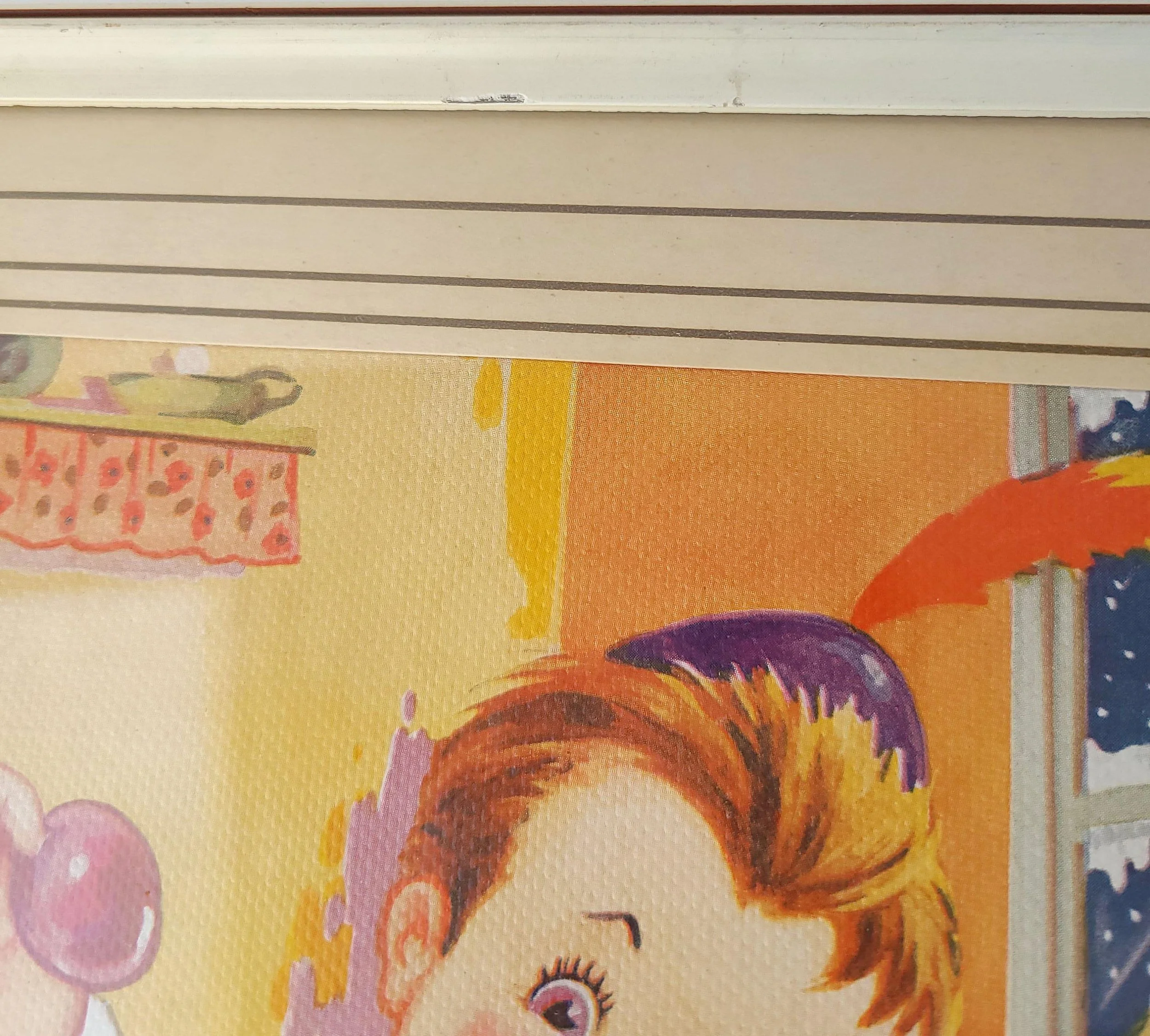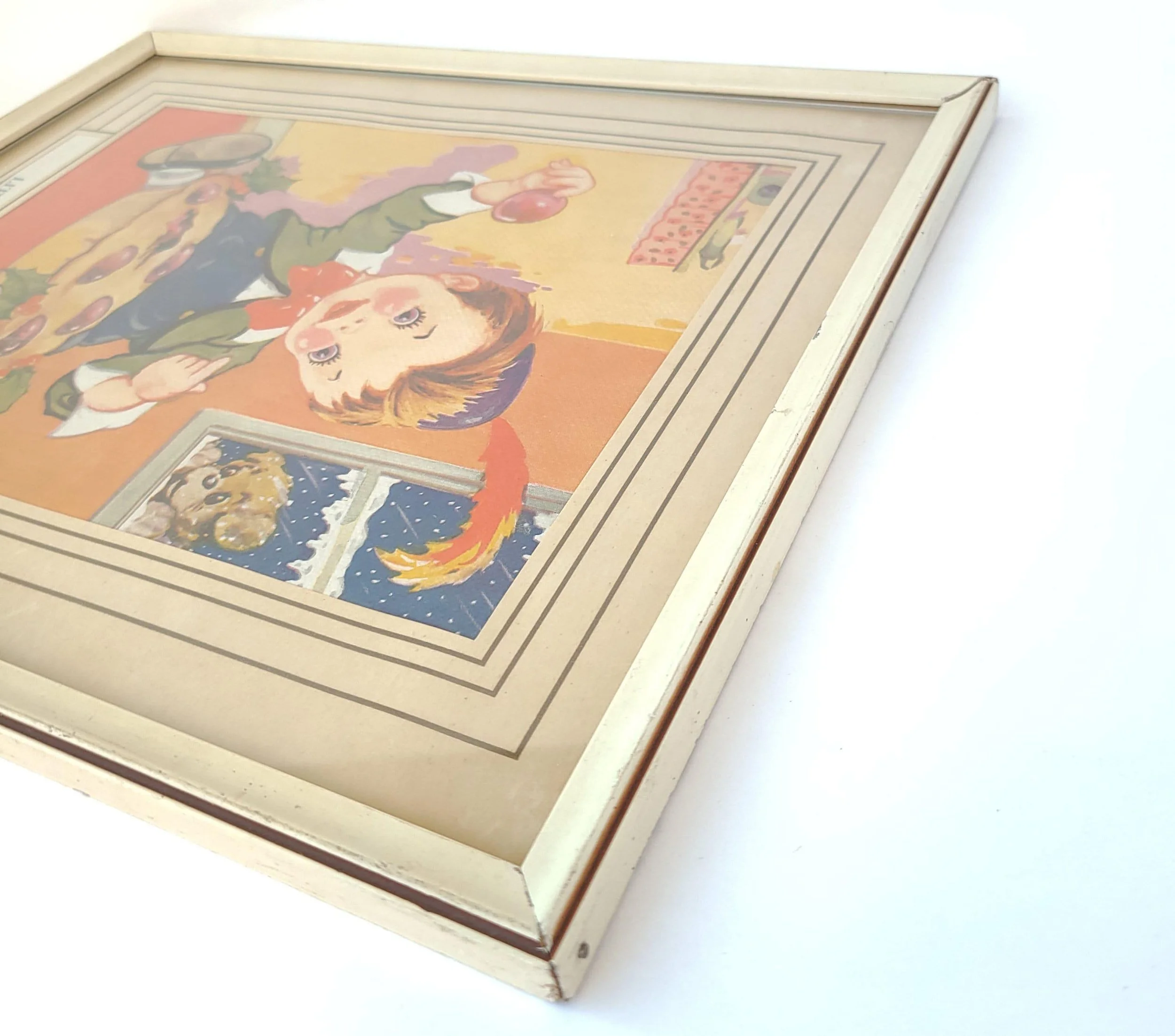 This darling vintage 1950's printed illustration by Penn Prints is matted, framed, and ready to hang on your wall for that perfect touch of vintage charm. The print itself is in good condition with no stains or tears and excellent color quality. The wood frame the piece is set in does have some paint loss, light scratches and scuffs with discoloration.