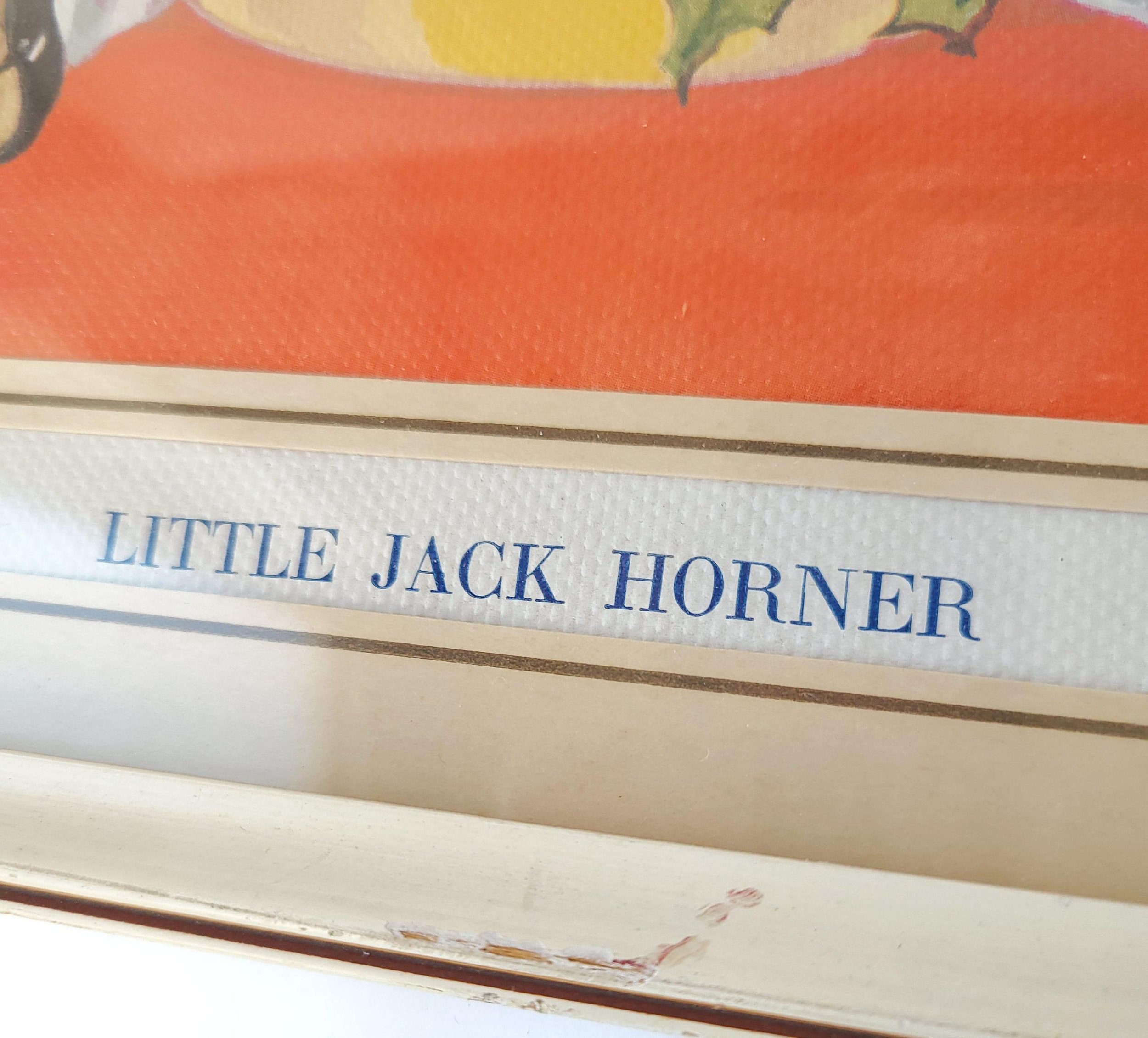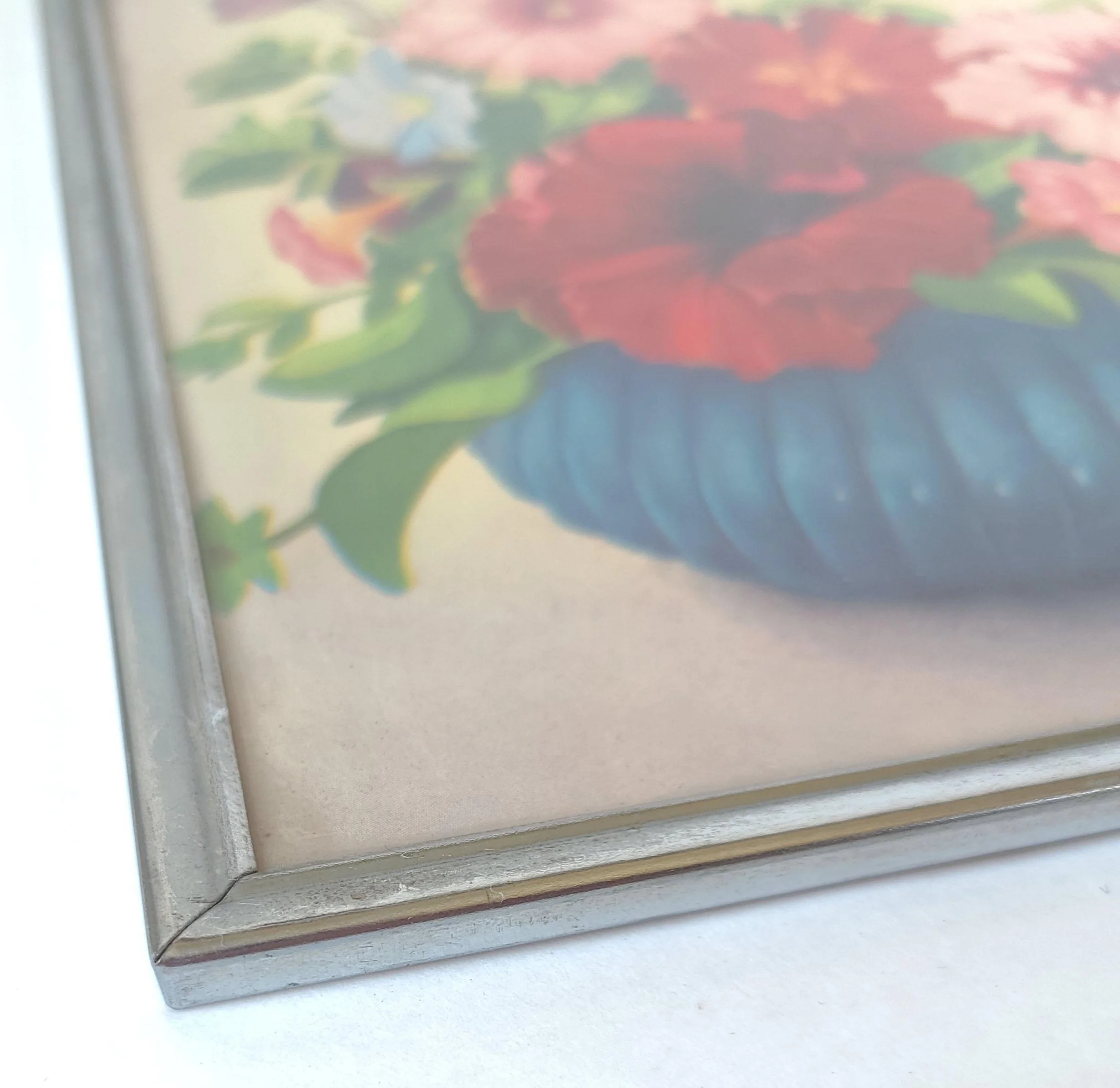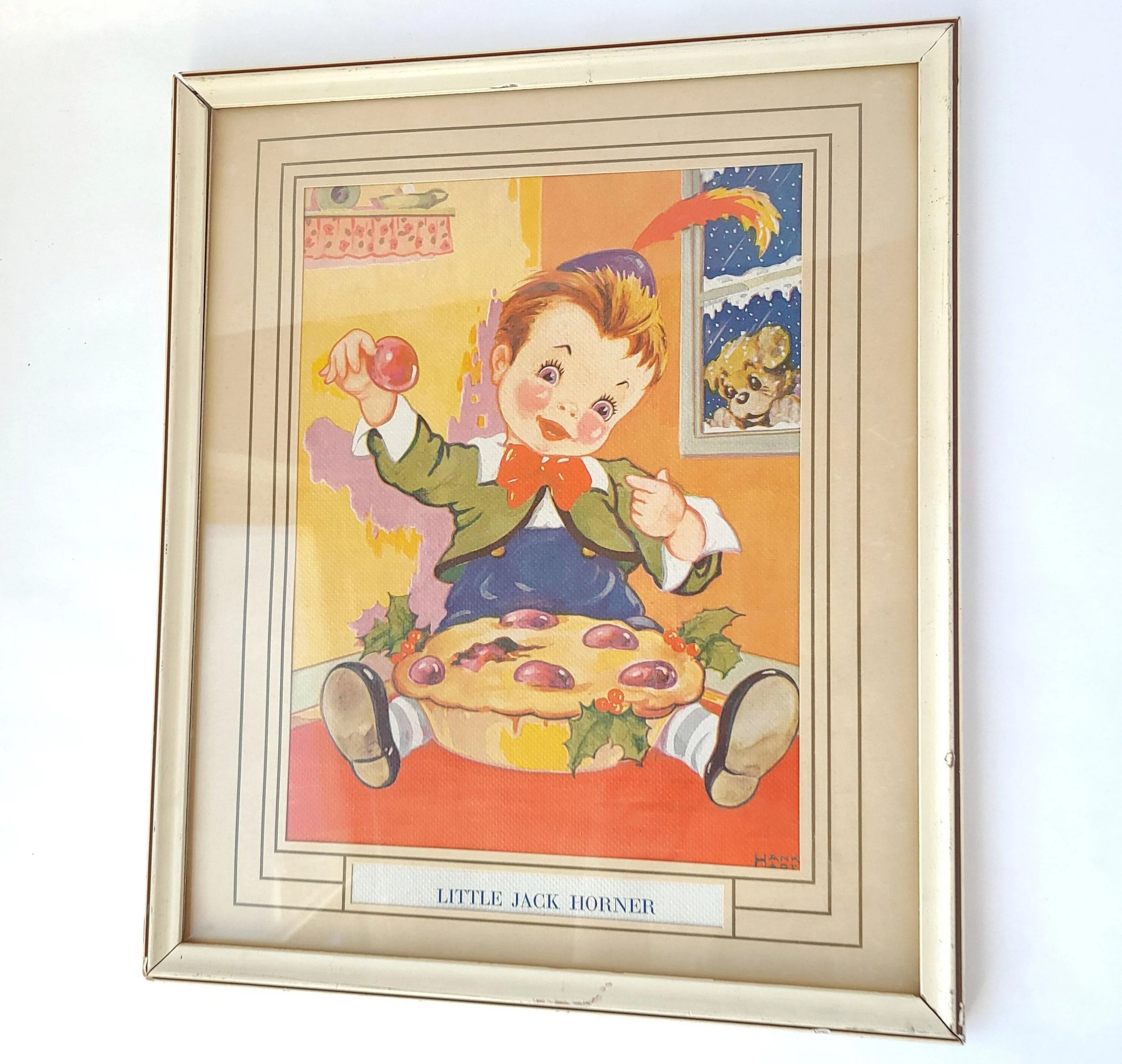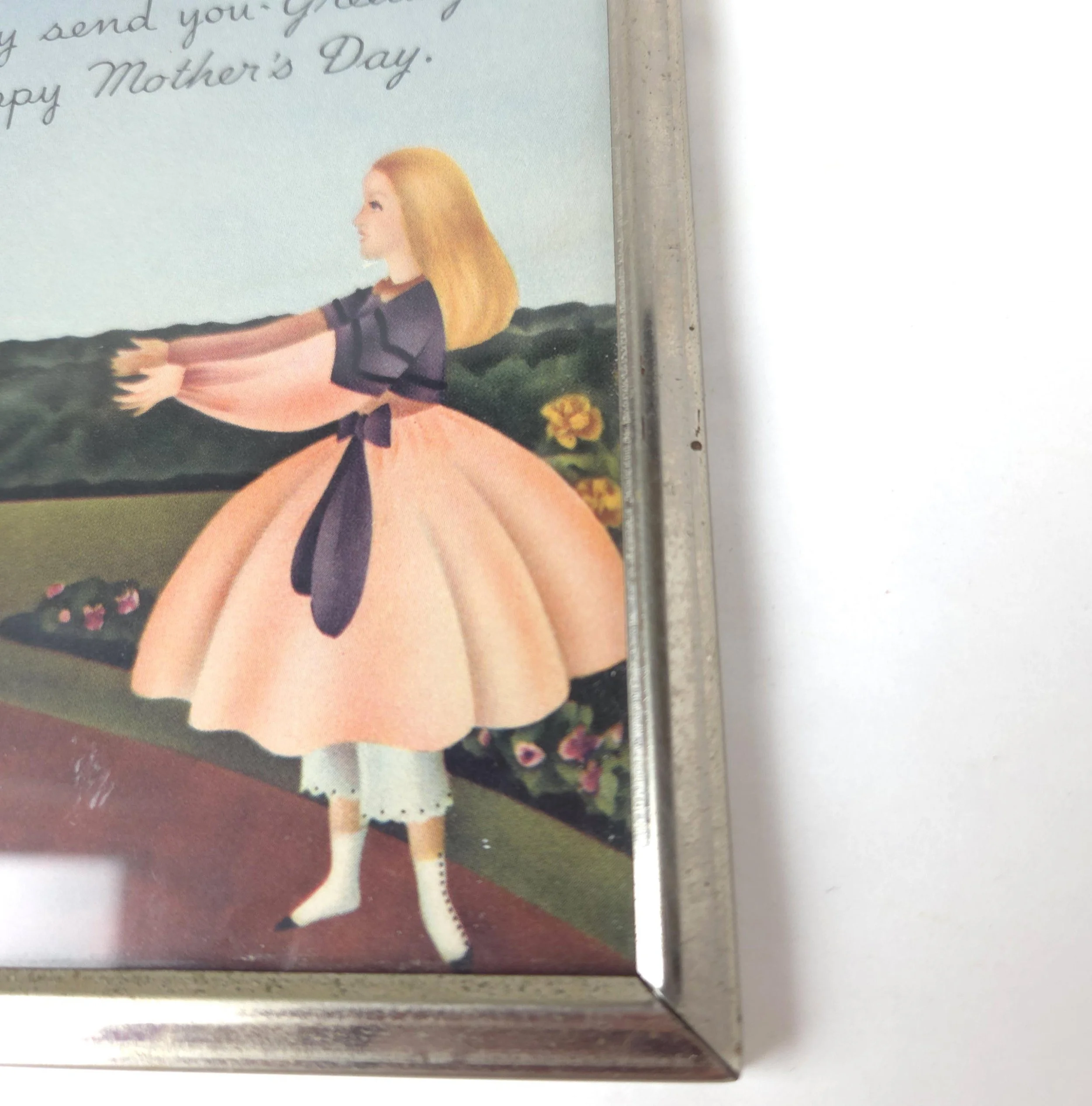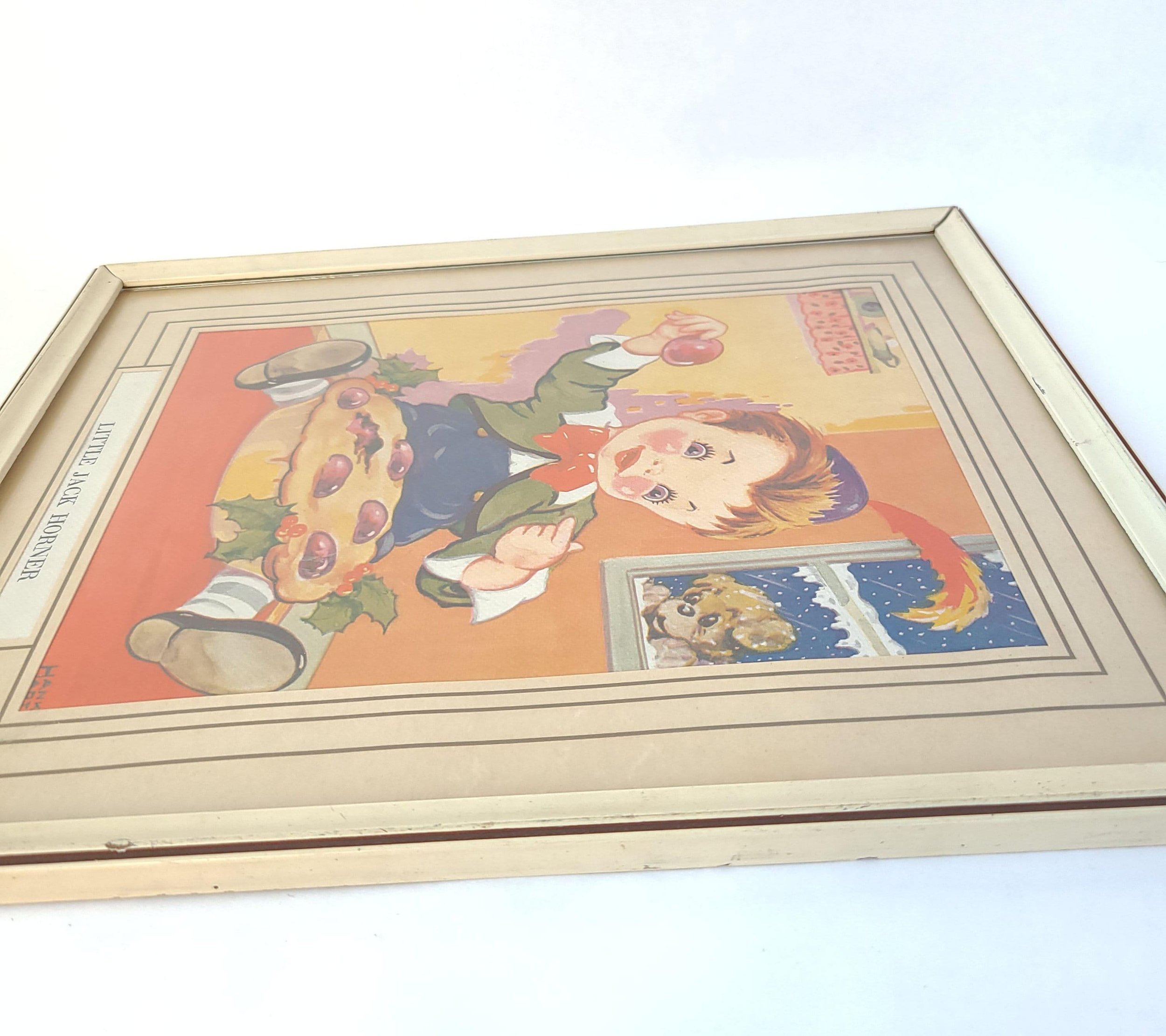 This darling vintage 1950's printed illustration by Penn Prints is matted, framed, and ready to hang on your wall for that perfect touch of vintage charm. The print itself is in good condition with no stains or tears and excellent color quality. The wood frame the piece is set in does have some paint loss, light scratches and scuffs with discoloration.