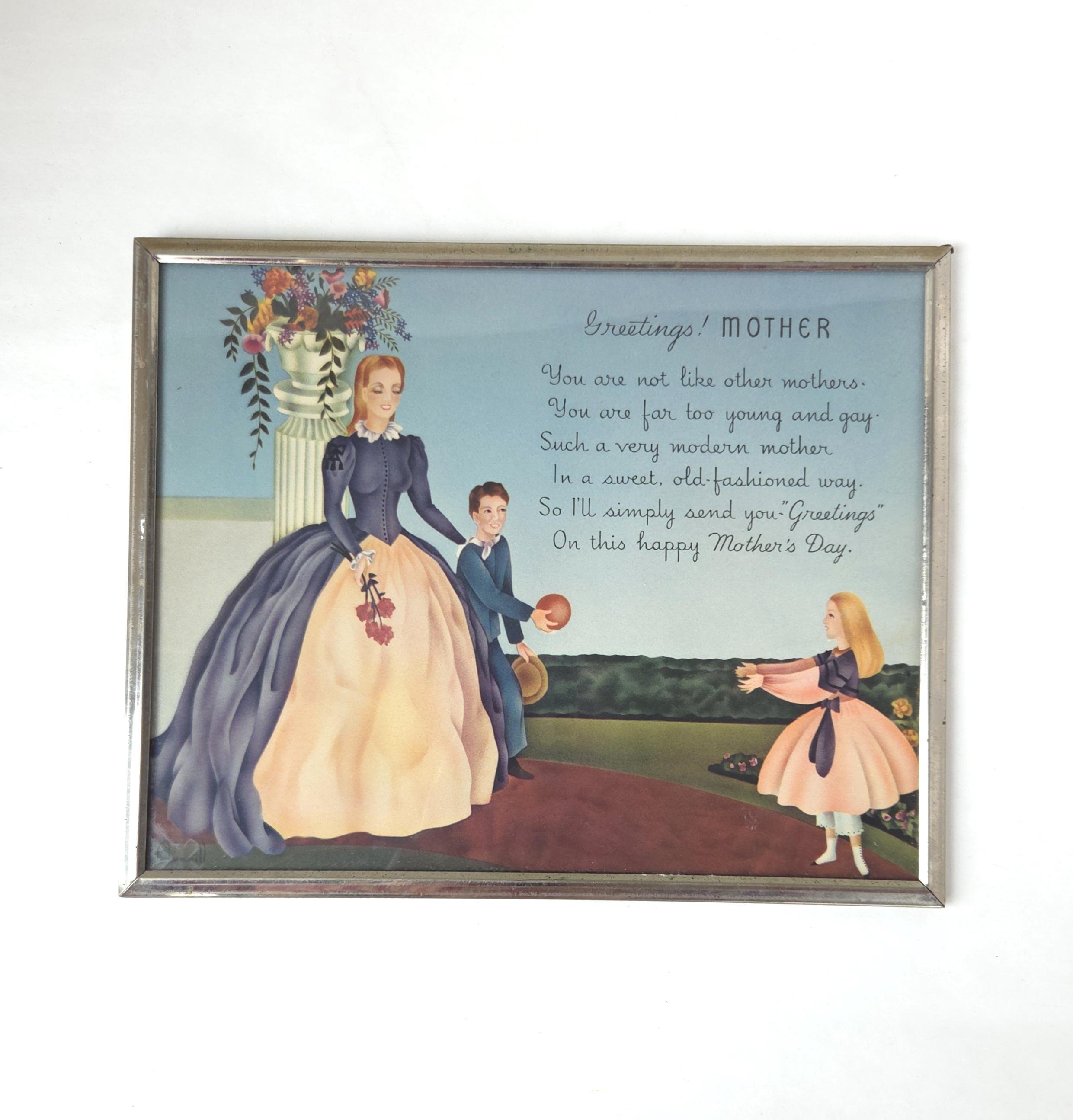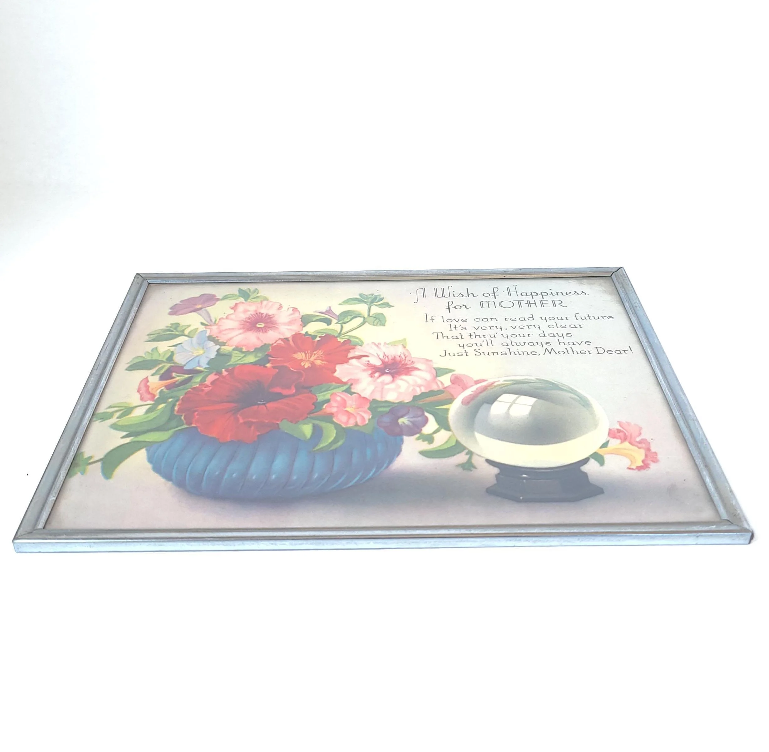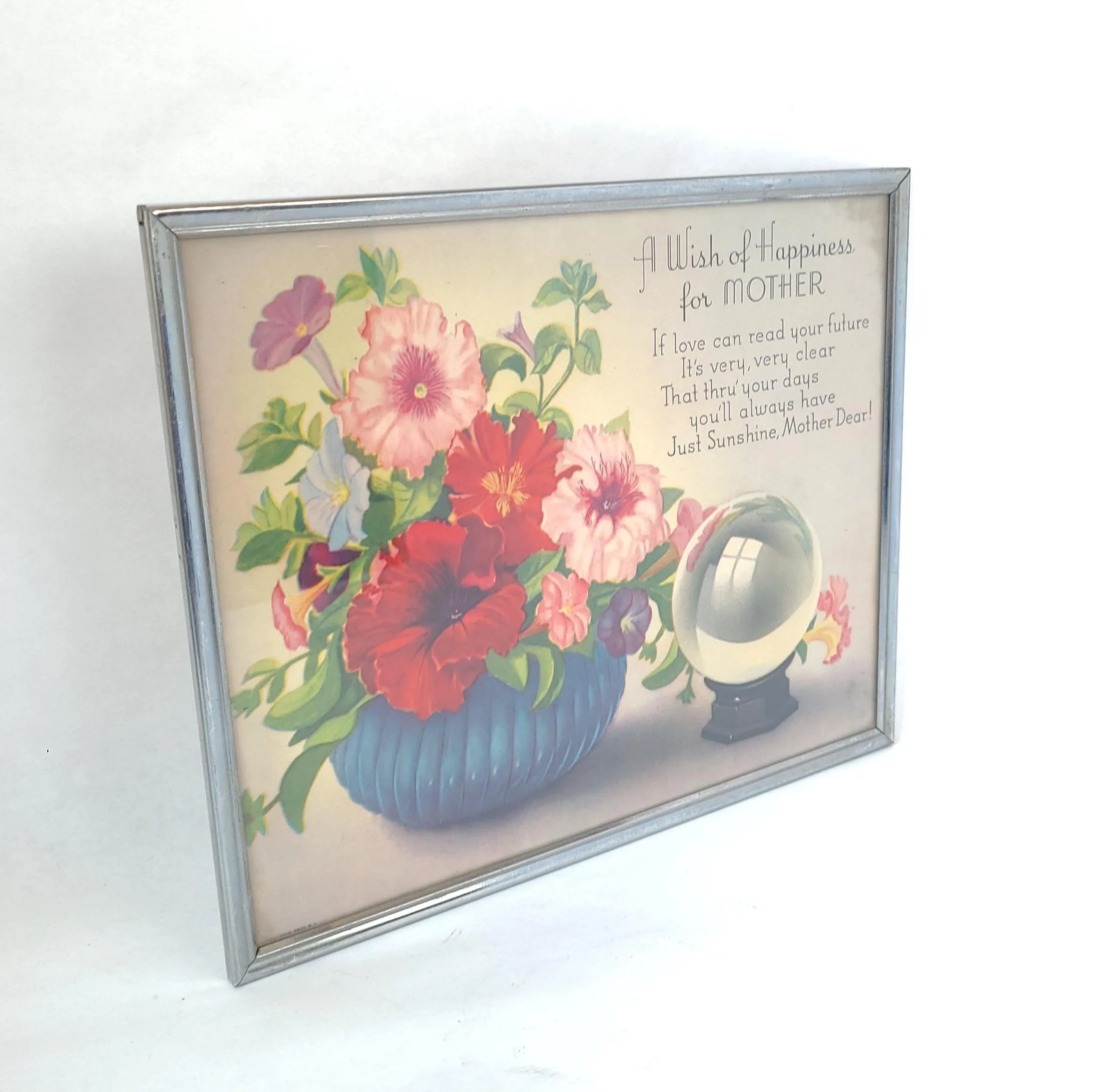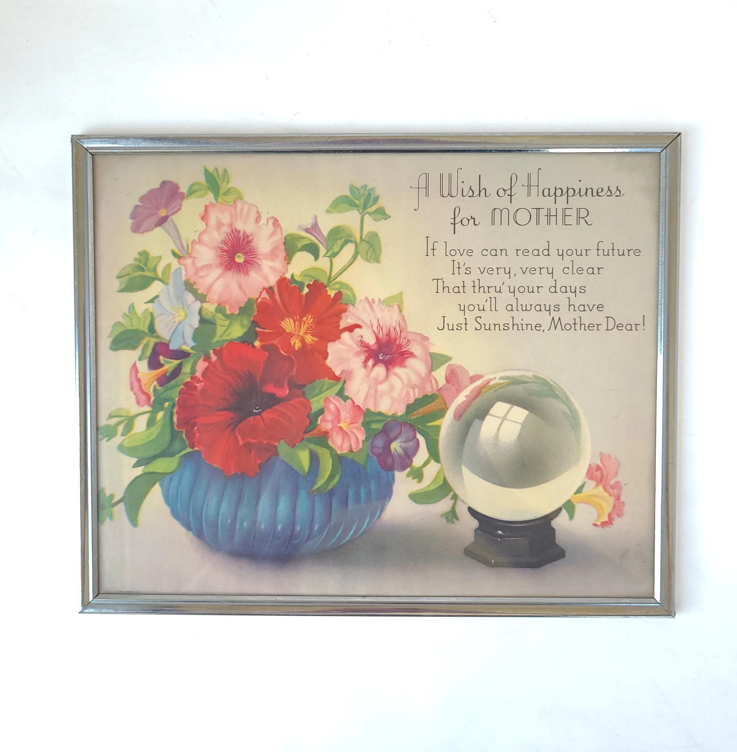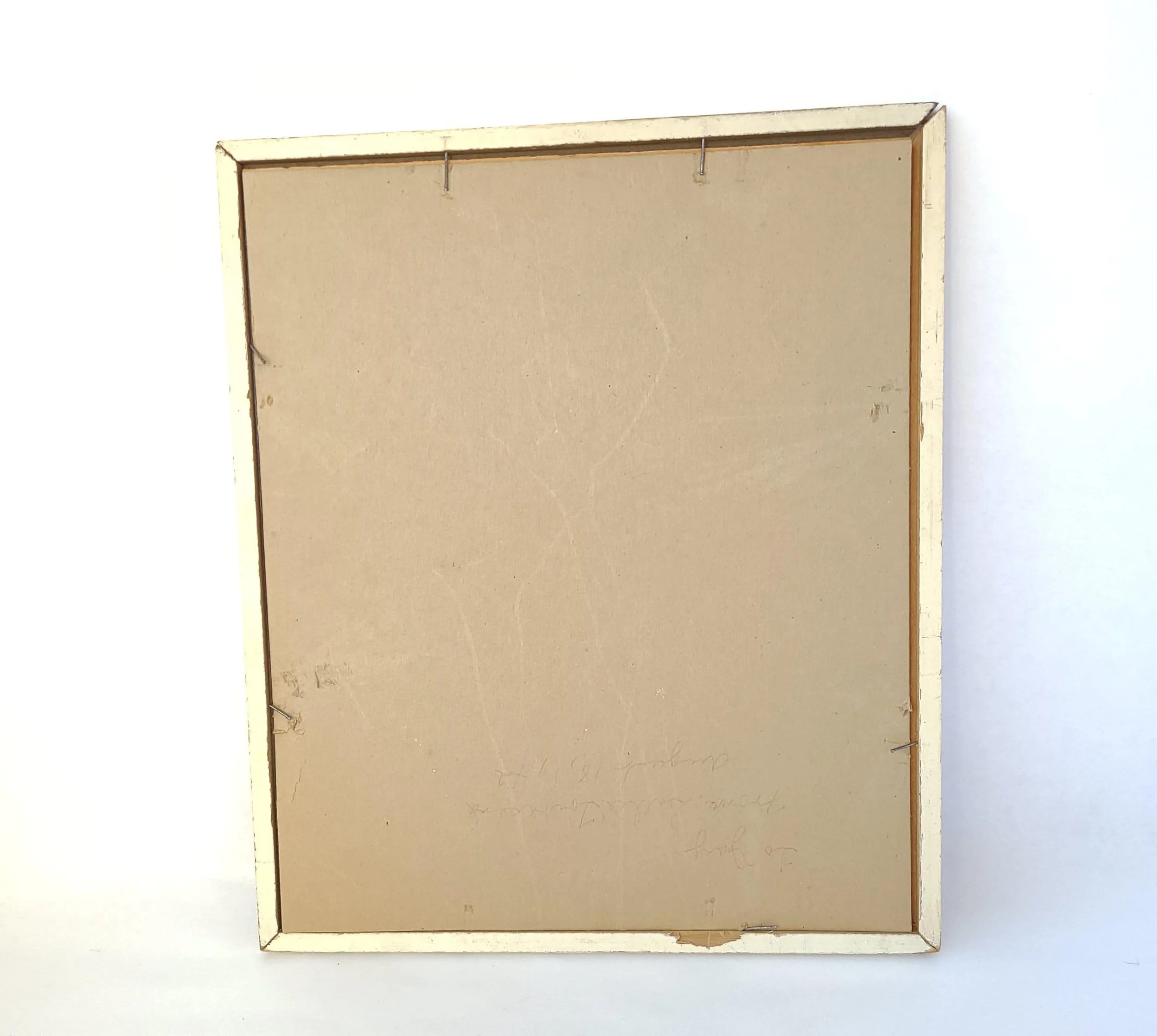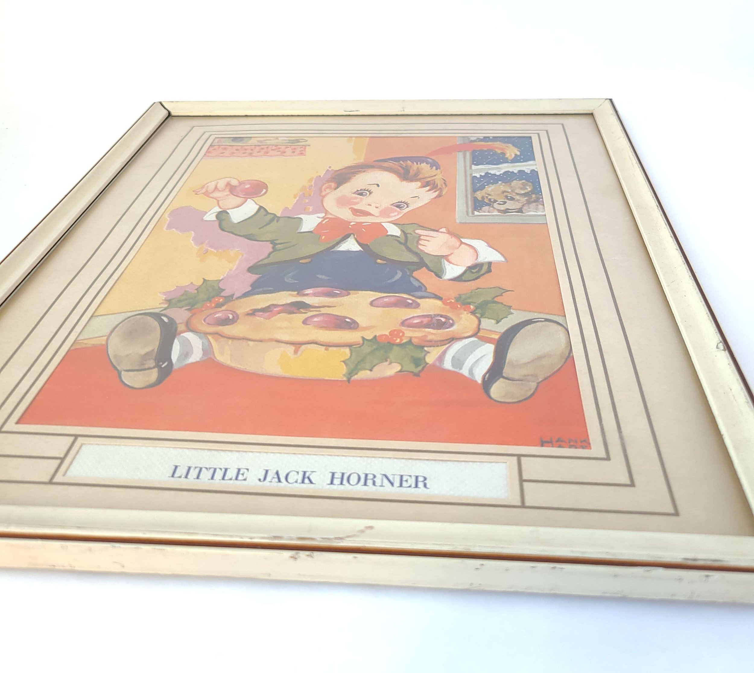 This darling vintage 1950's printed illustration by Penn Prints is matted, framed, and ready to hang on your wall for that perfect touch of vintage charm. The print itself is in good condition with no stains or tears and excellent color quality. The wood frame the piece is set in does have some paint loss, light scratches and scuffs with discoloration.