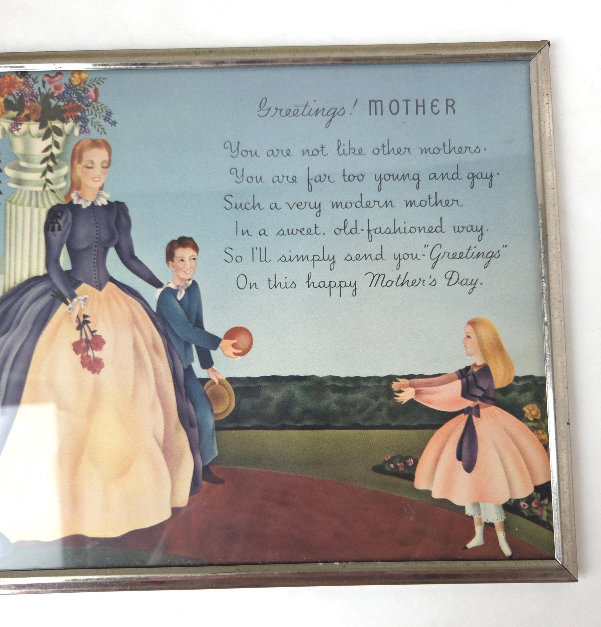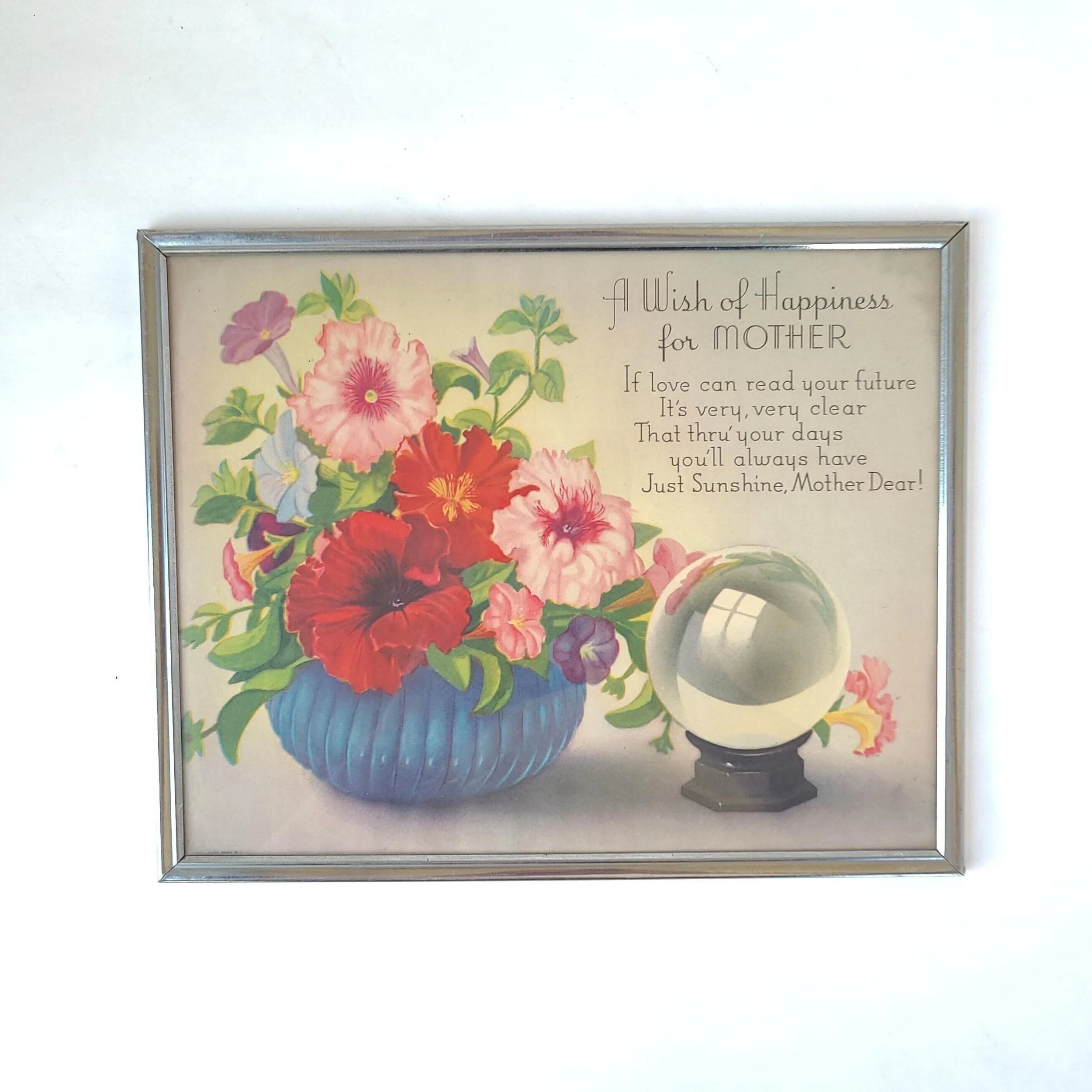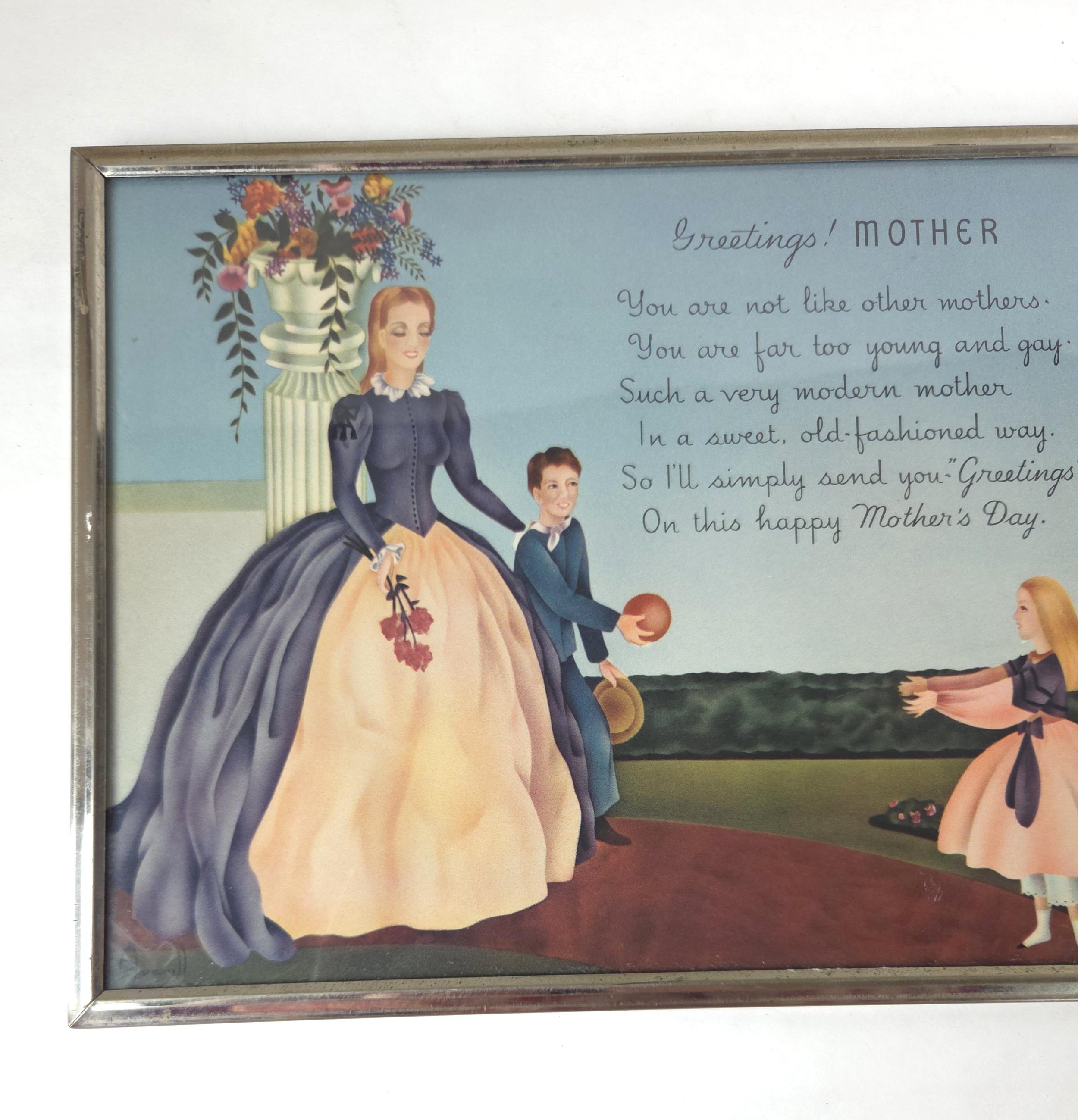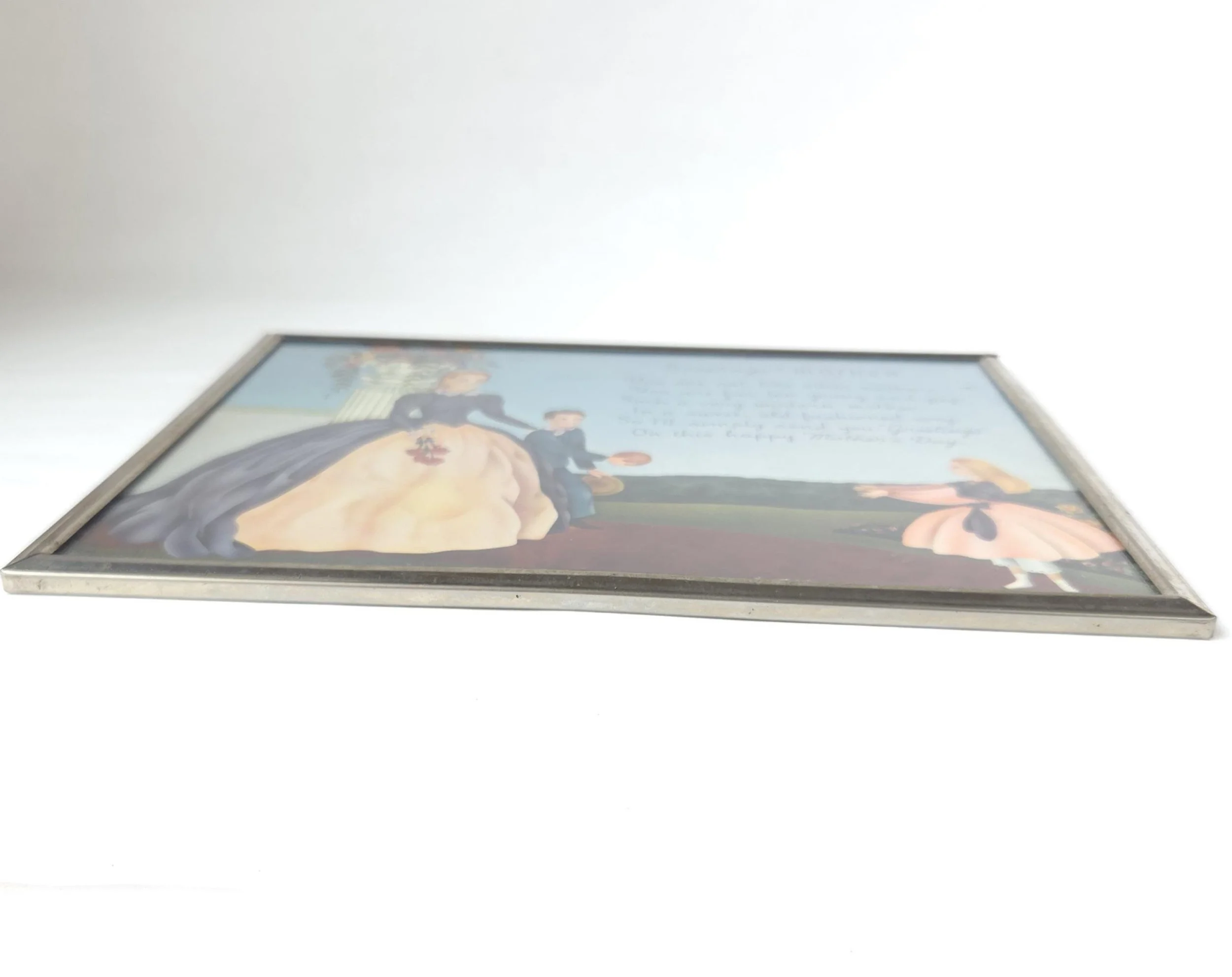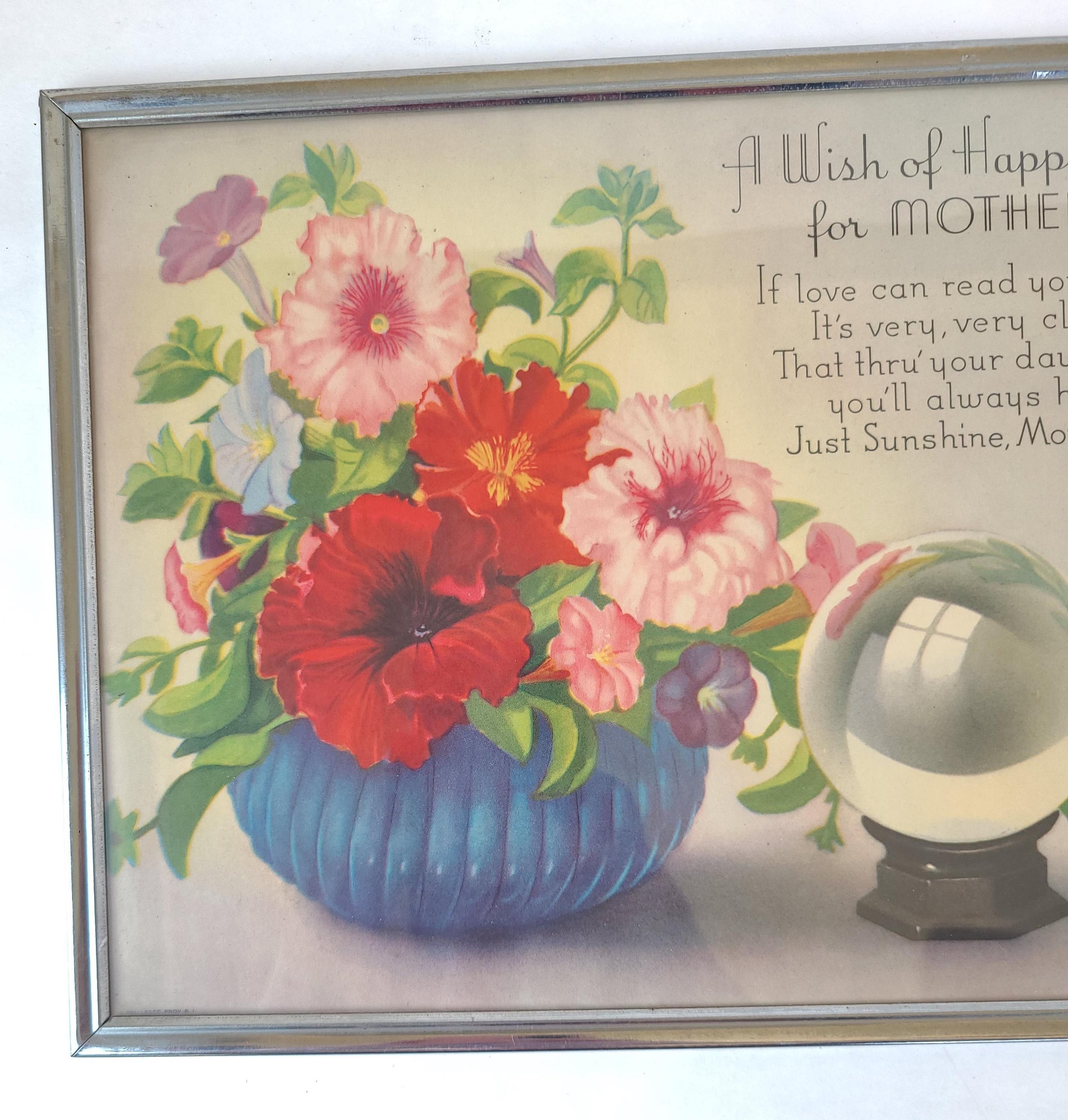 This darling vintage 1950's printed illustration by Penn Prints is matted, framed, and ready to hang on your wall for that perfect touch of vintage charm. The print itself is in good condition with no stains or tears and excellent color quality. The wood frame the piece is set in does have some paint loss, light scratches and scuffs with discoloration.