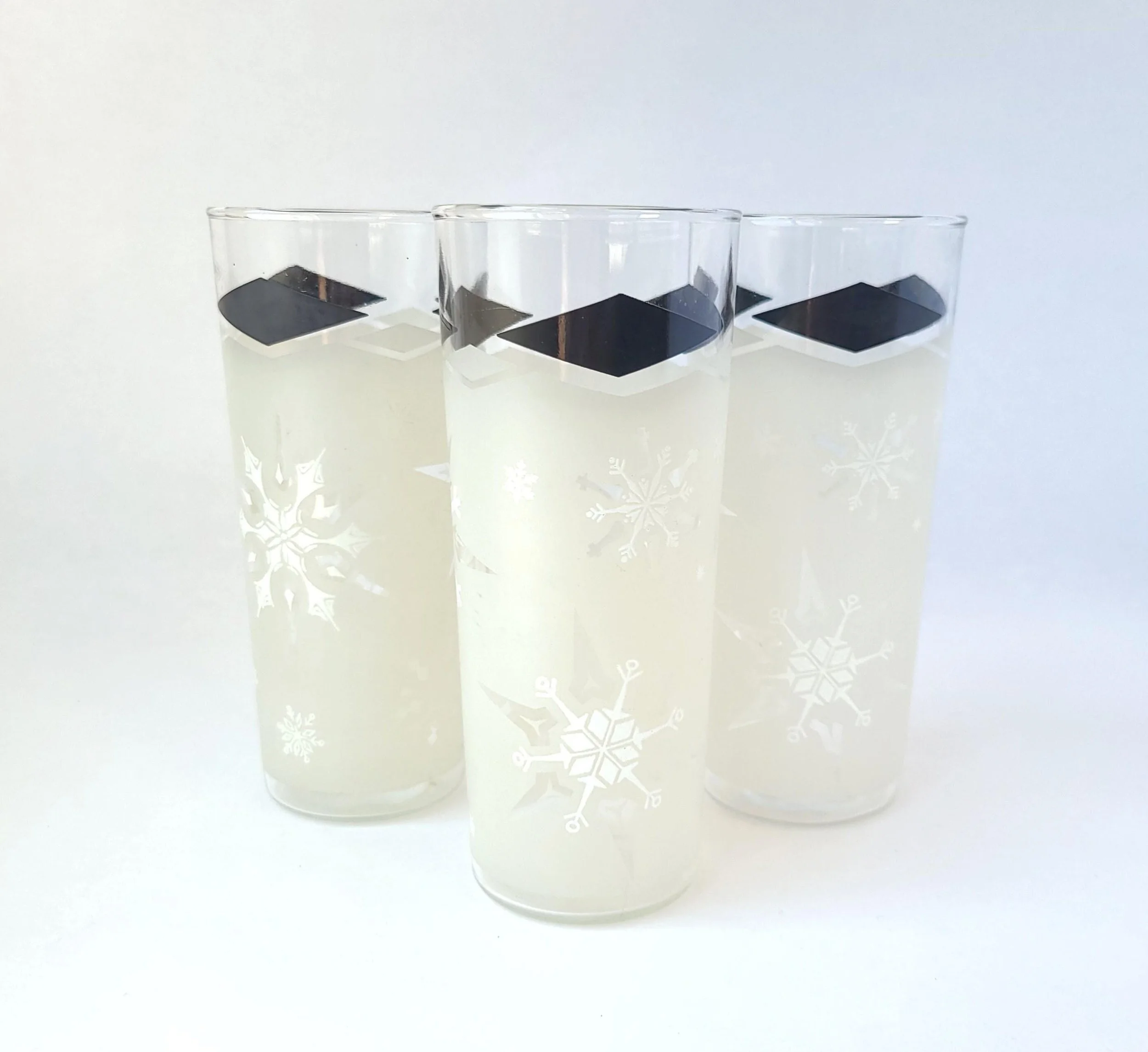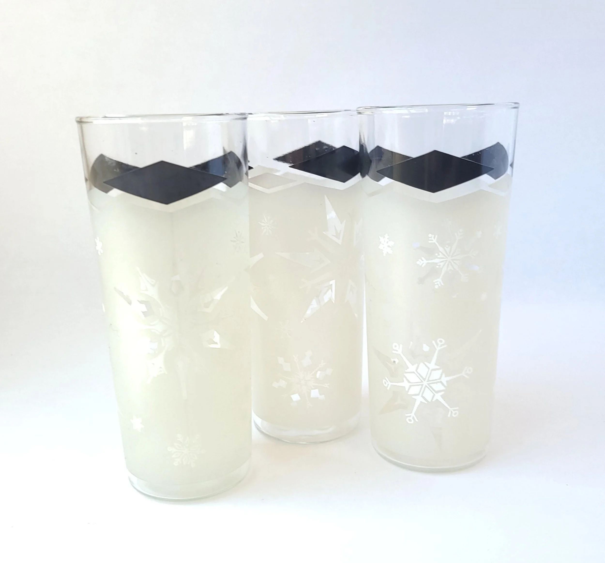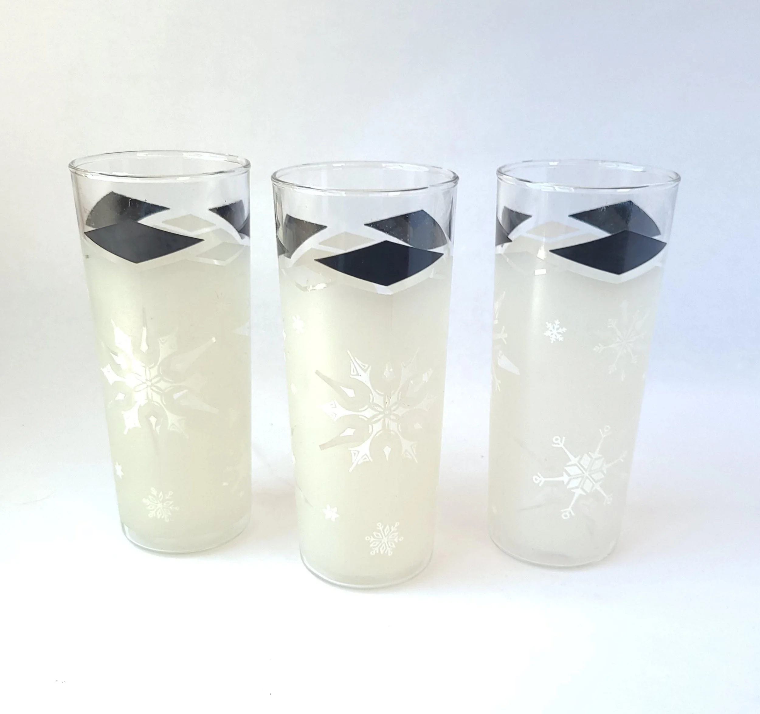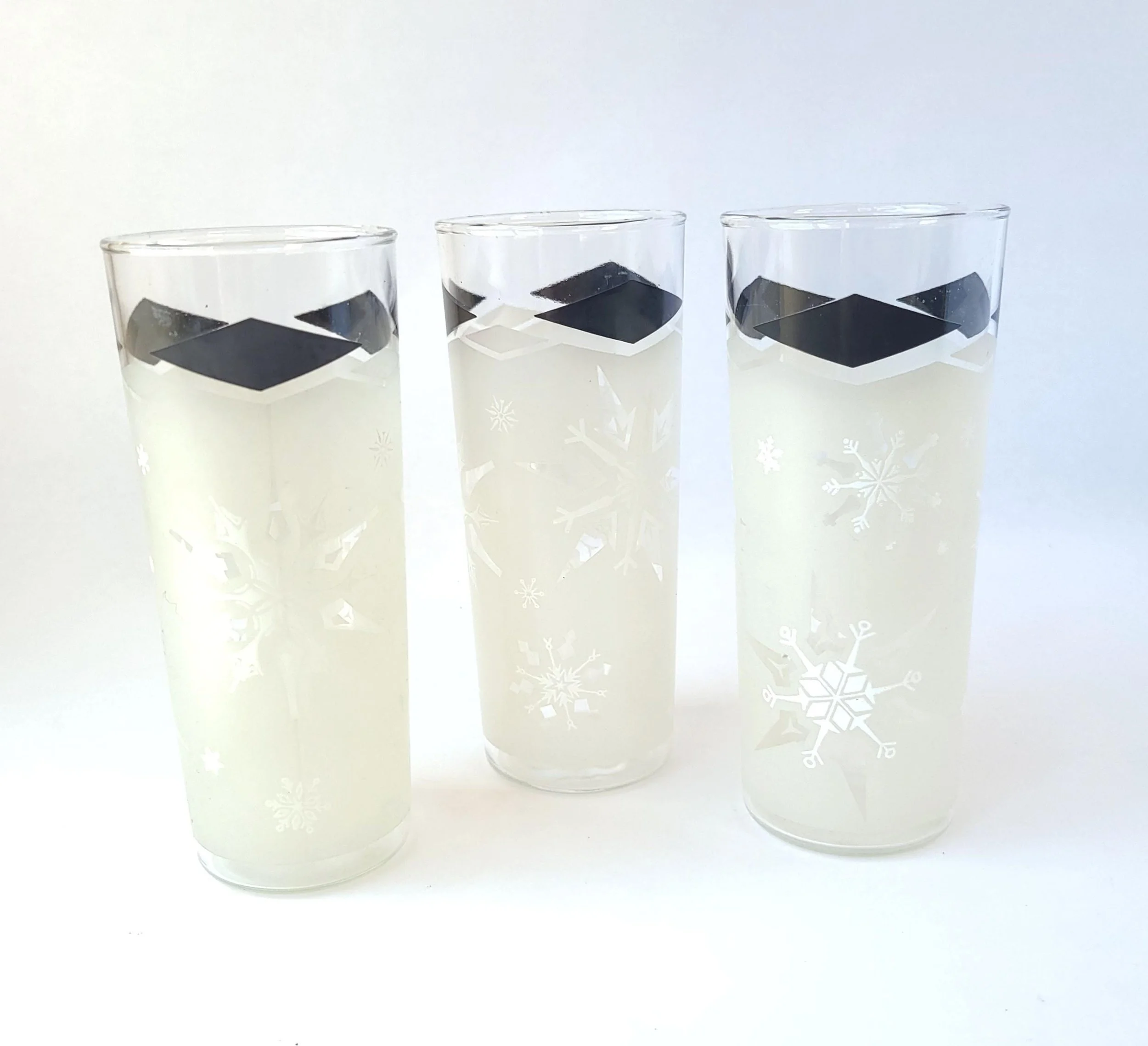 These classic vintage frosted glass tumblers were made by Anchor Hocking. They feature a snowflake design with bold black diamonds along the top. The glasses are in good used condition with some light scratching and discoloration from age, but no chips or cracks.