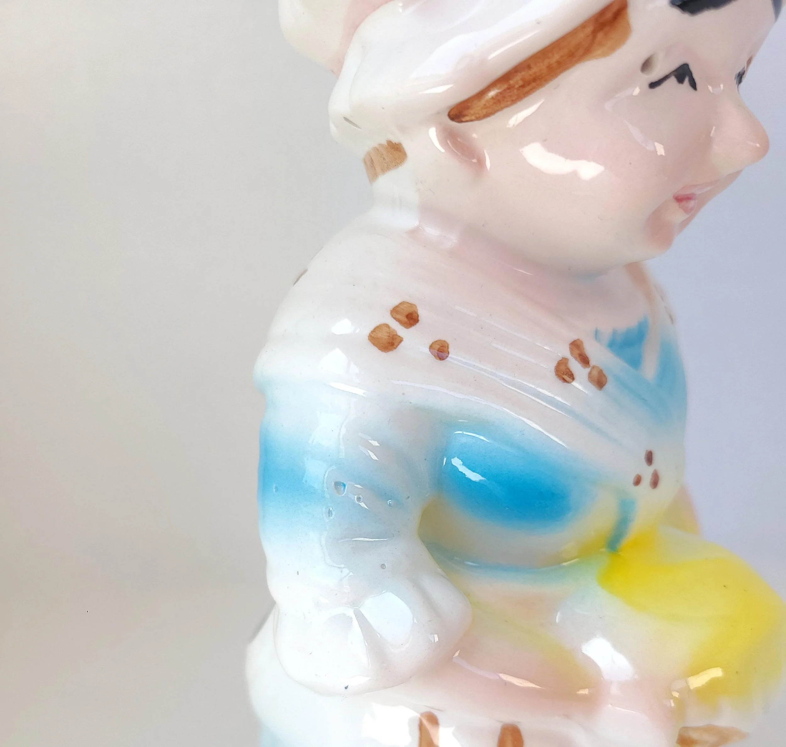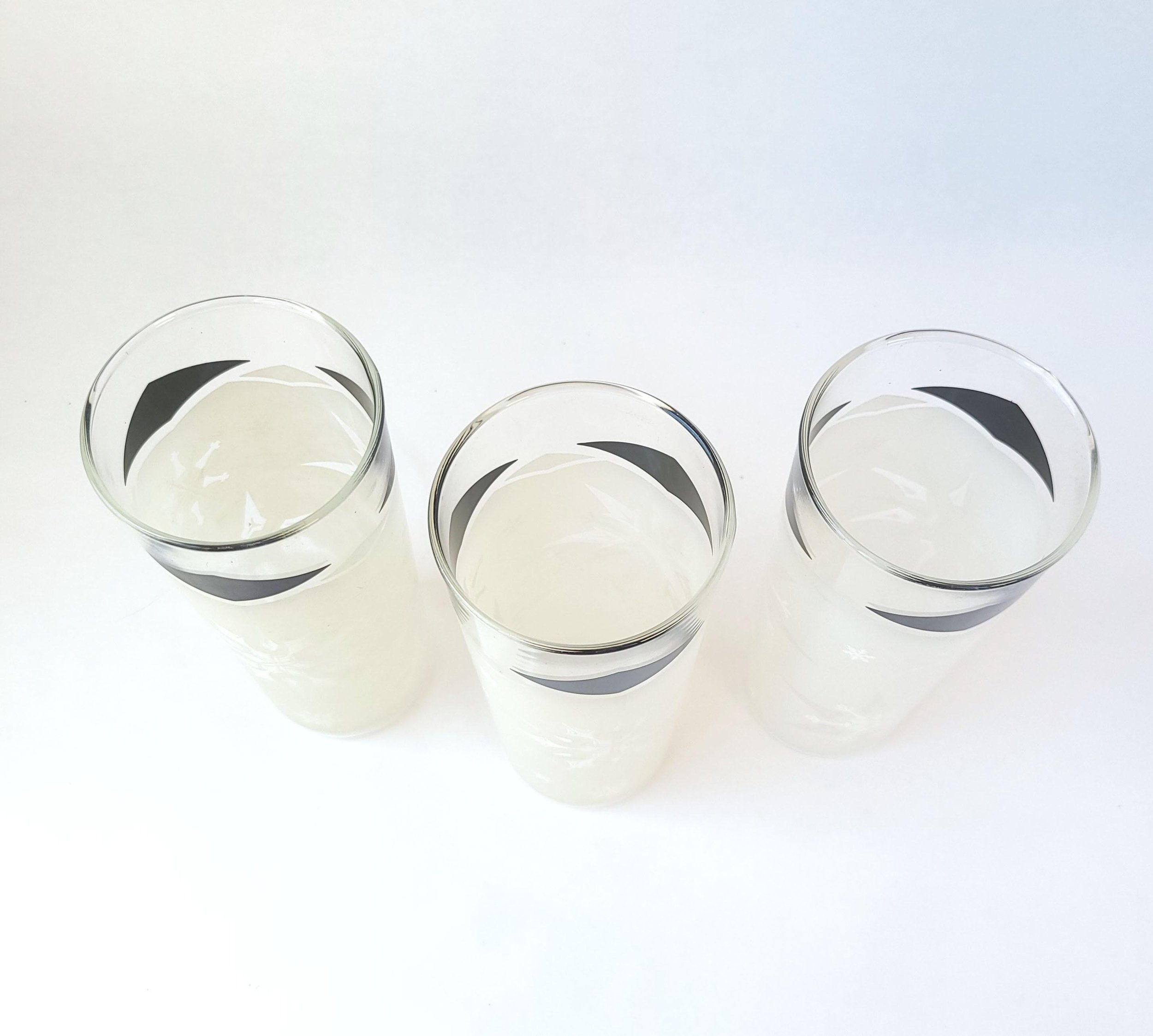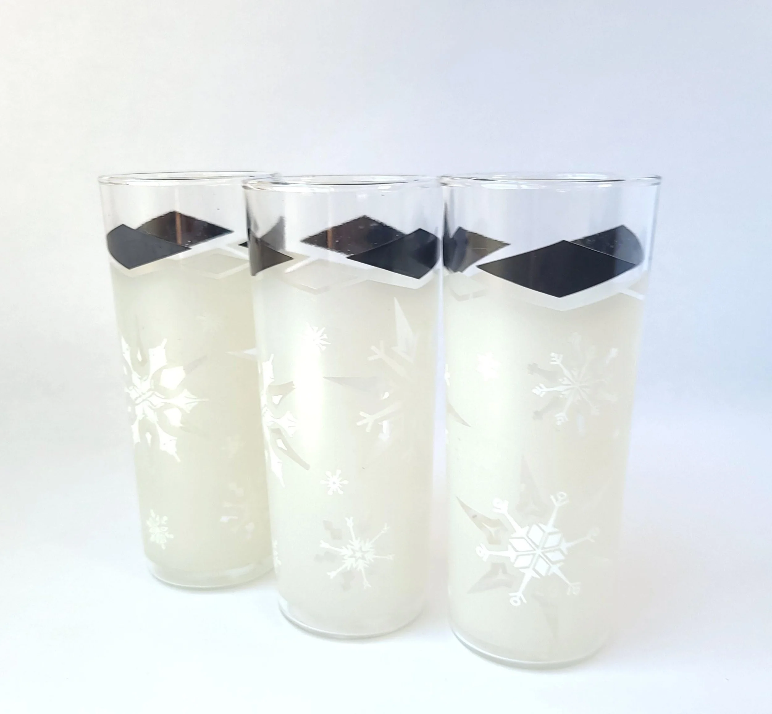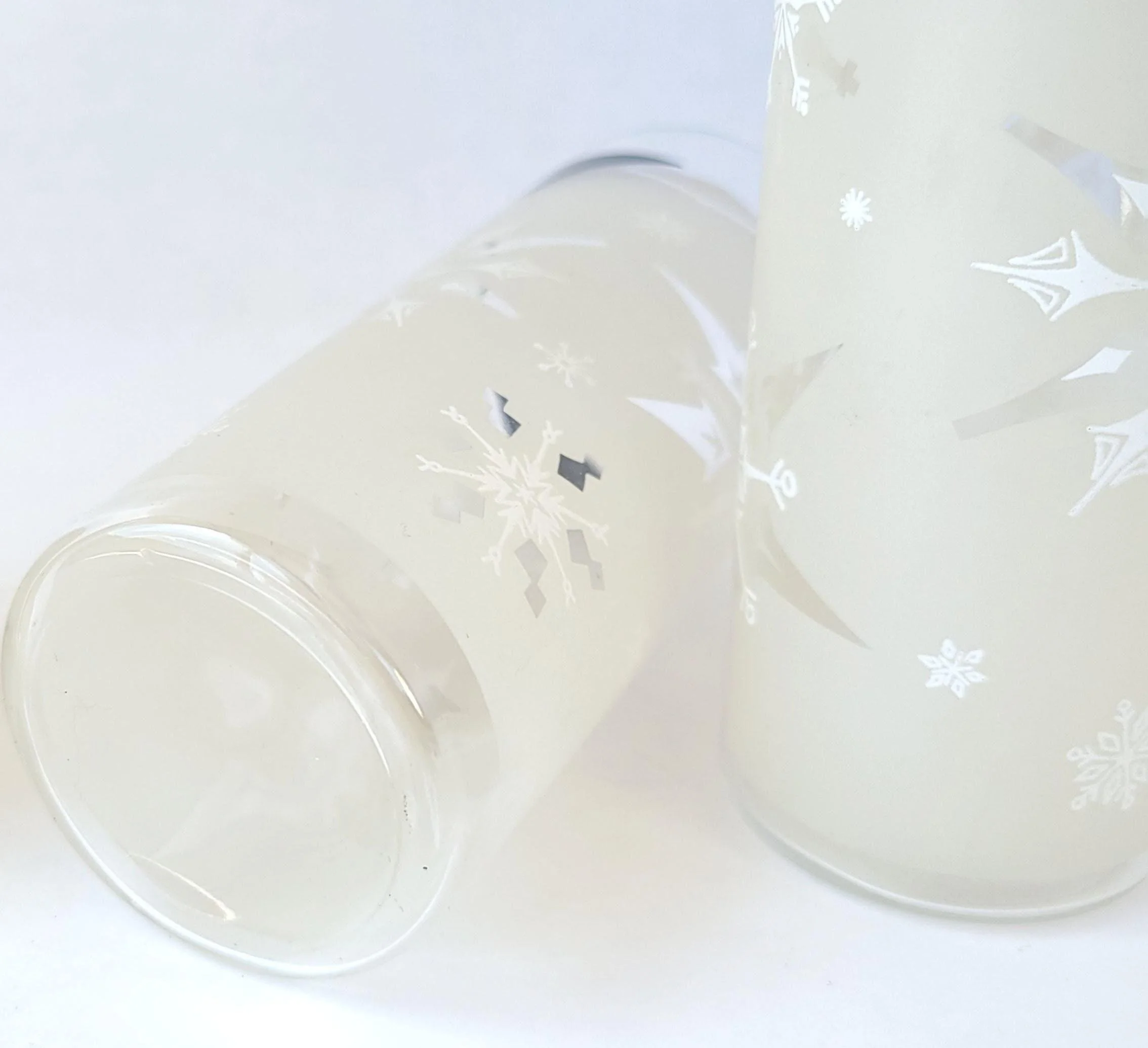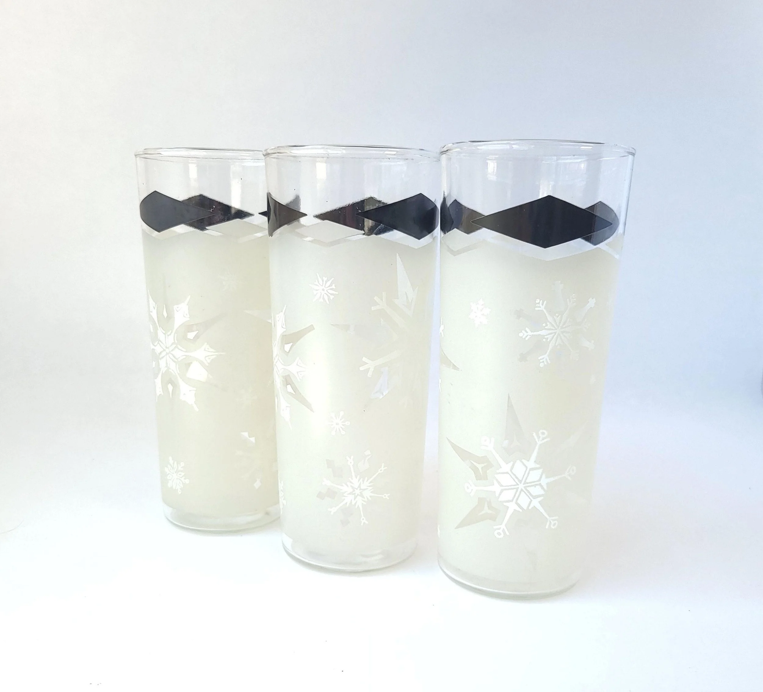 These classic vintage frosted glass tumblers were made by Anchor Hocking. They feature a snowflake design with bold black diamonds along the top. The glasses are in good used condition with some light scratching and discoloration from age, but no chips or cracks.
