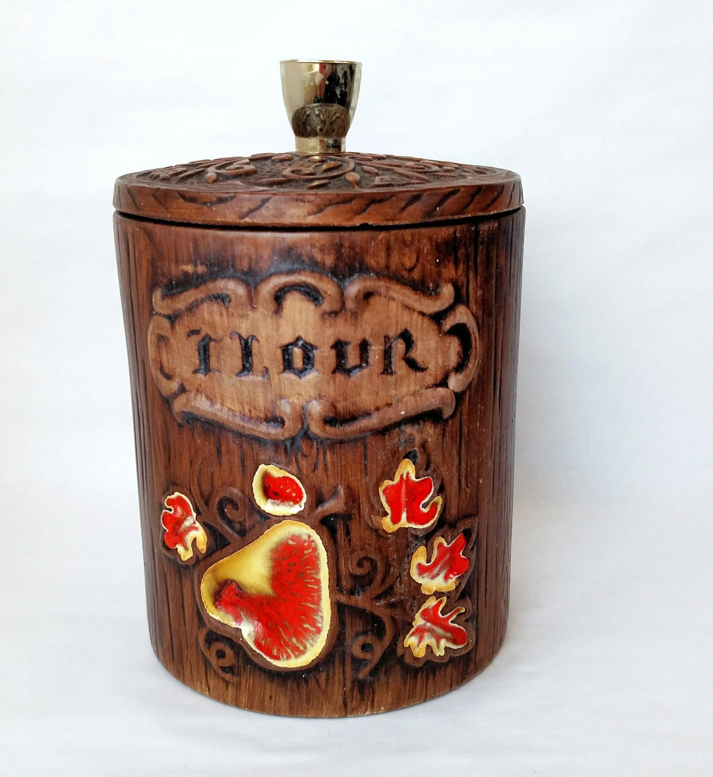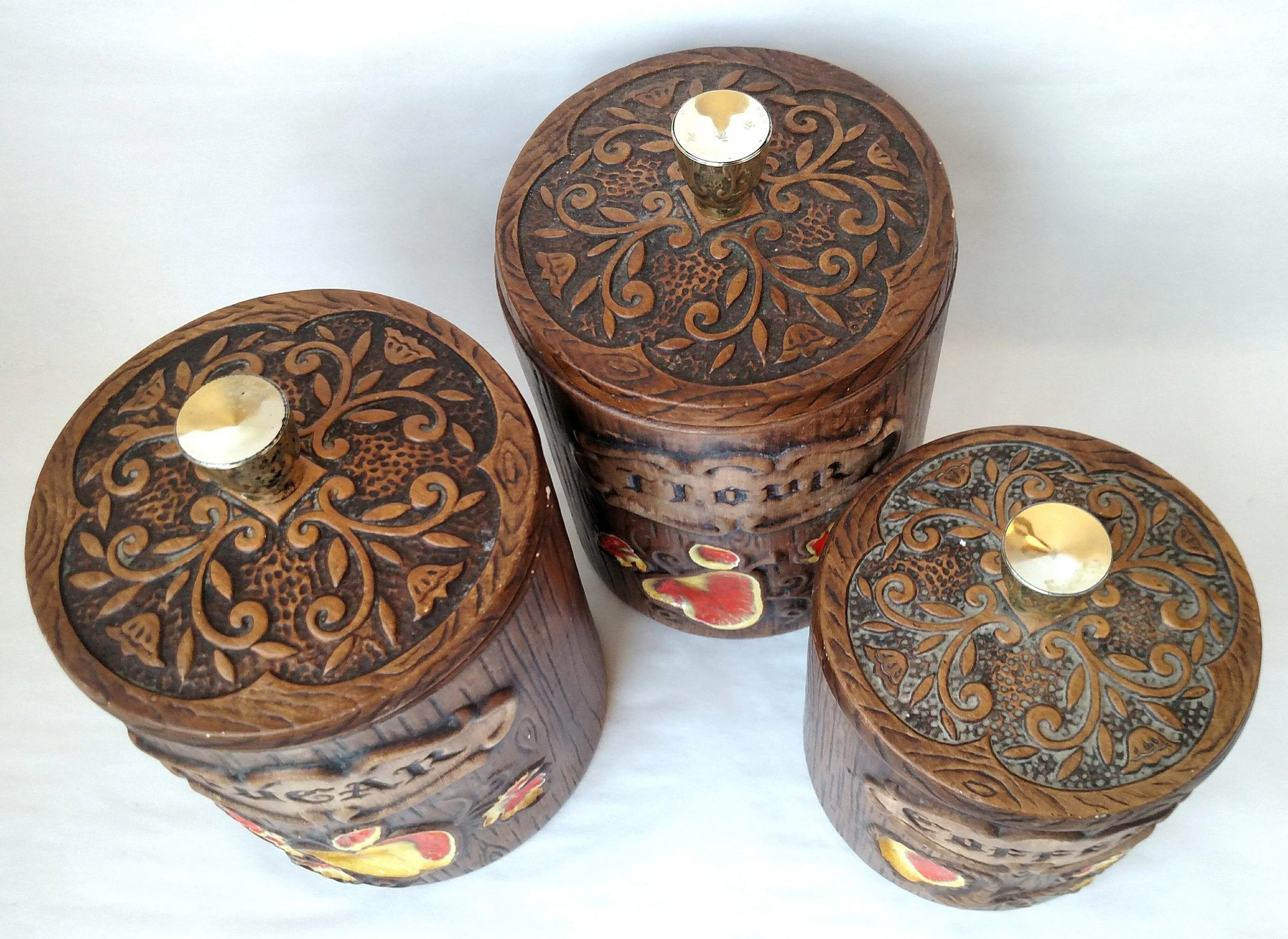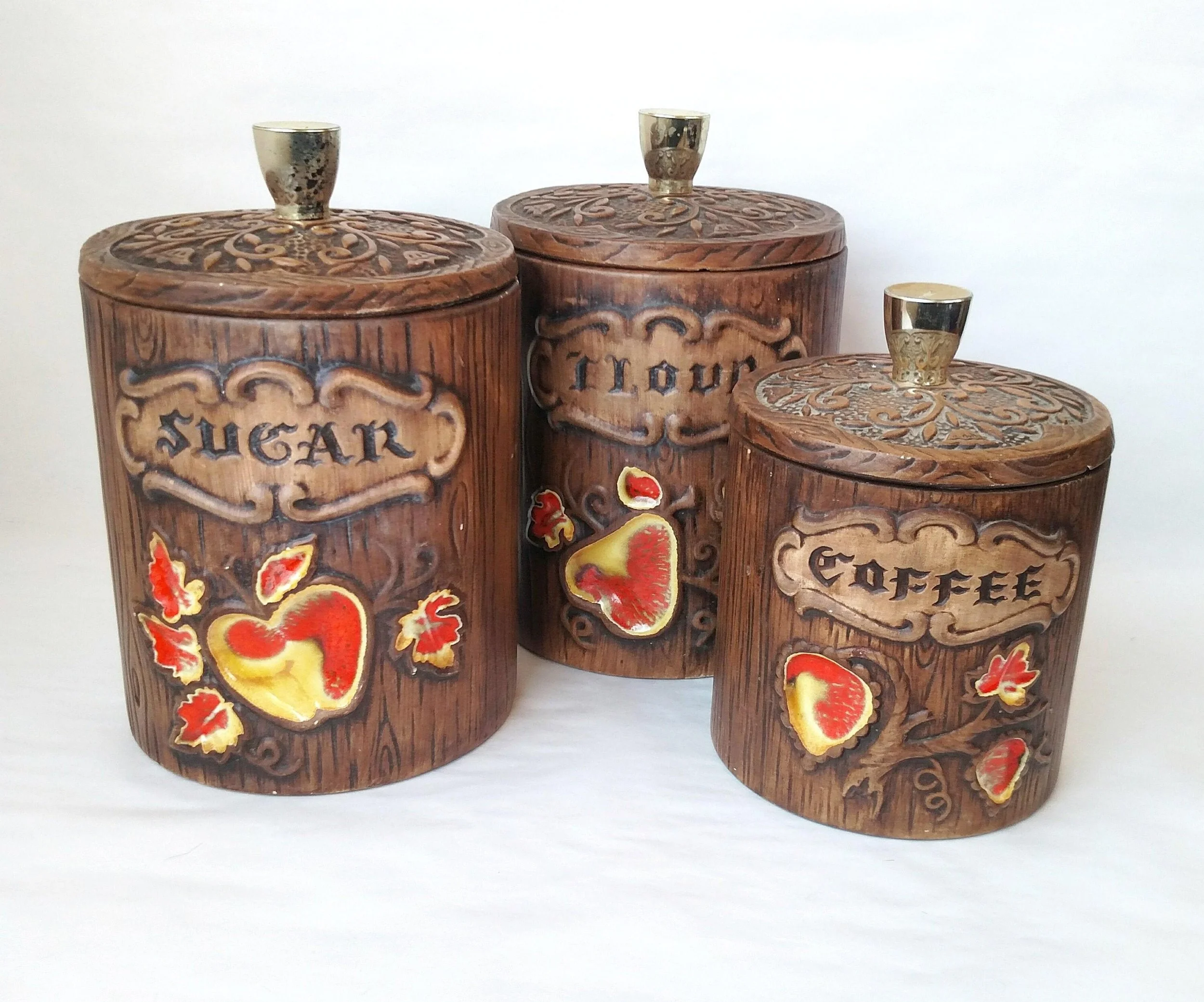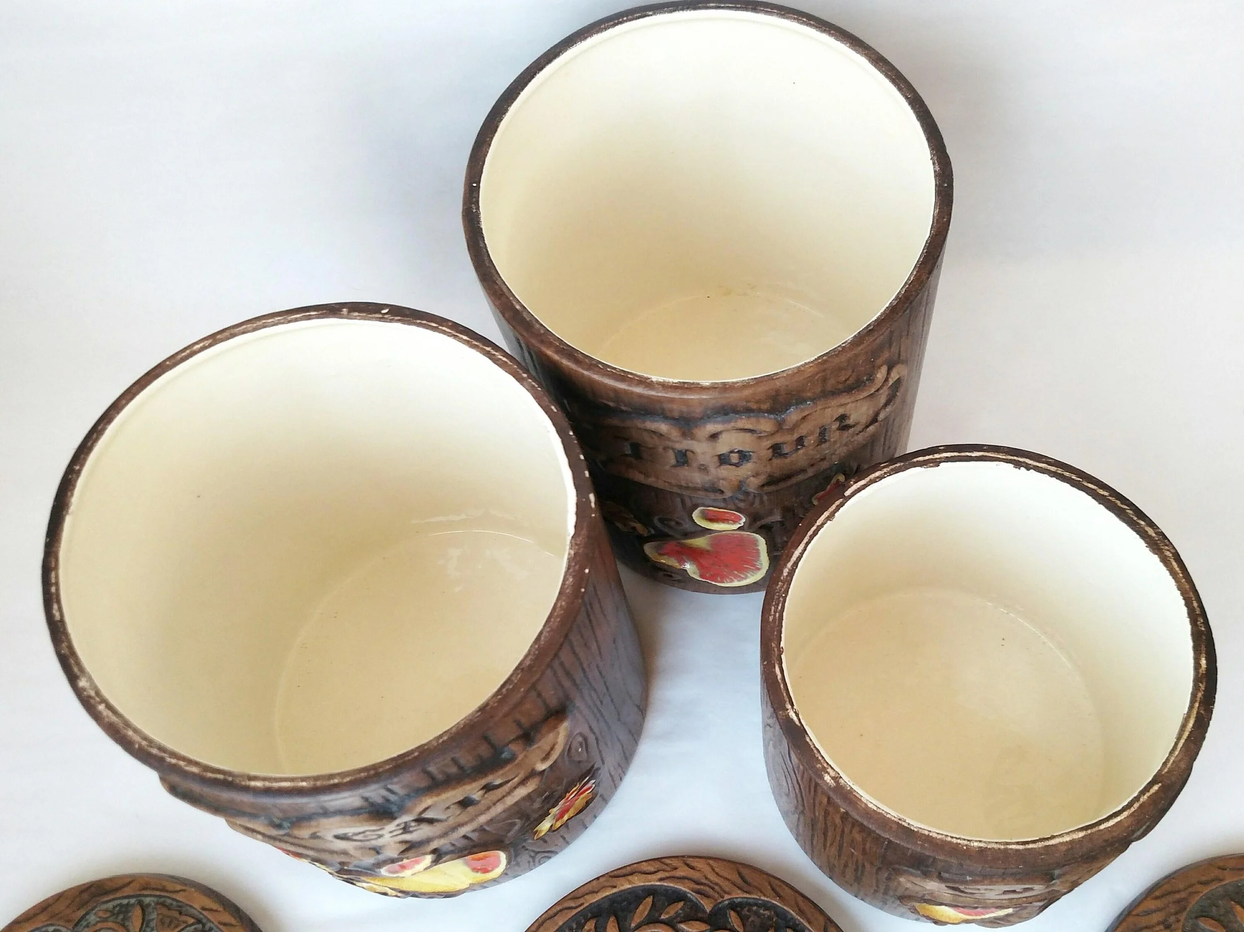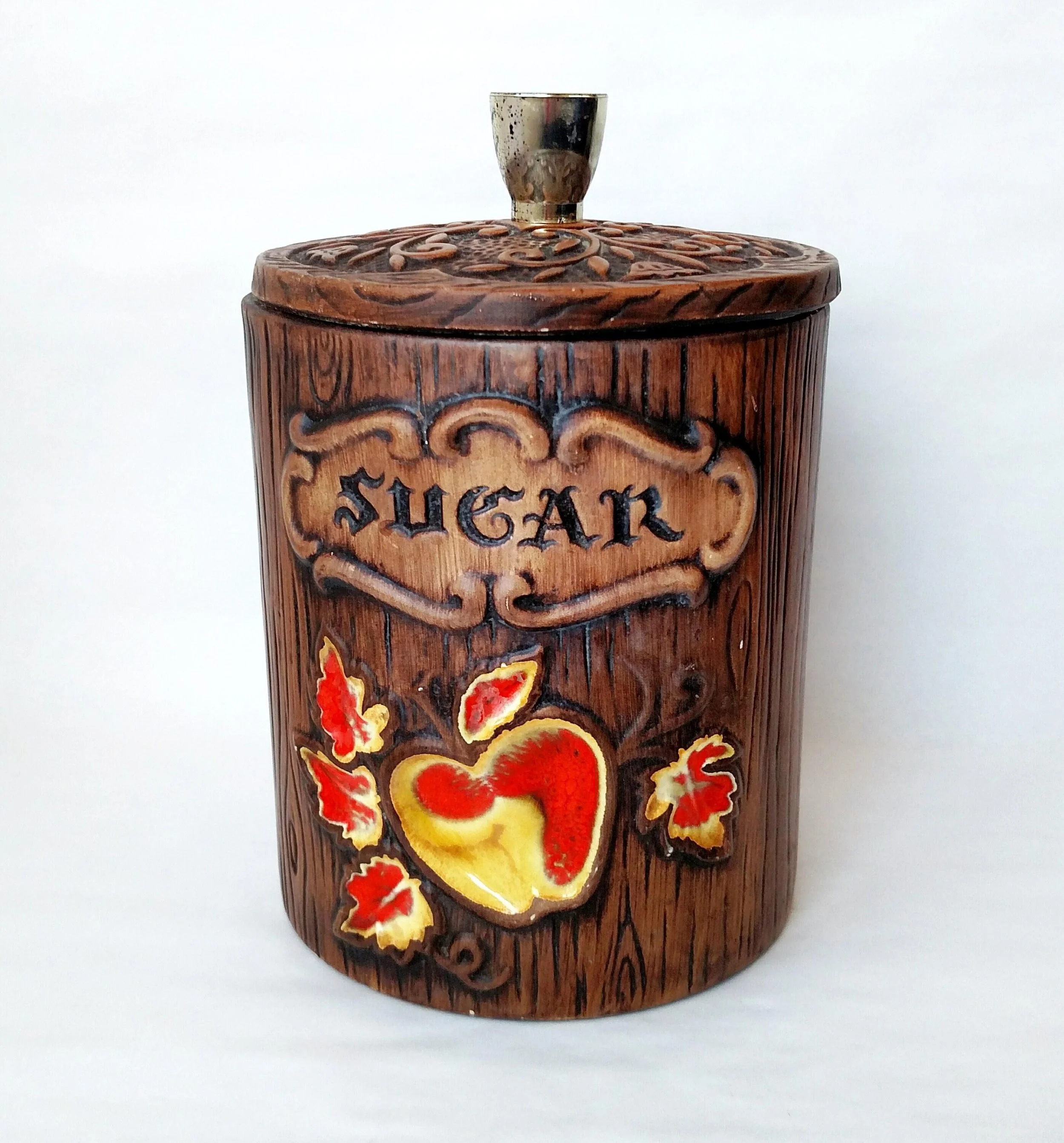 These charming vintage ceramic canisters feature a wood grain texture with a orange and yellow glazed fruit and leaf pattern. They have a rustic yet kitschy appeal that makes them a great addition to vintage inspired kitchens. The canisters are in used condition with some chips to the inside of the lids, some wear and discoloration to the knobs, and one piece (the sugar canister) does have a crack on its side that can probably be stabilized with some glue.