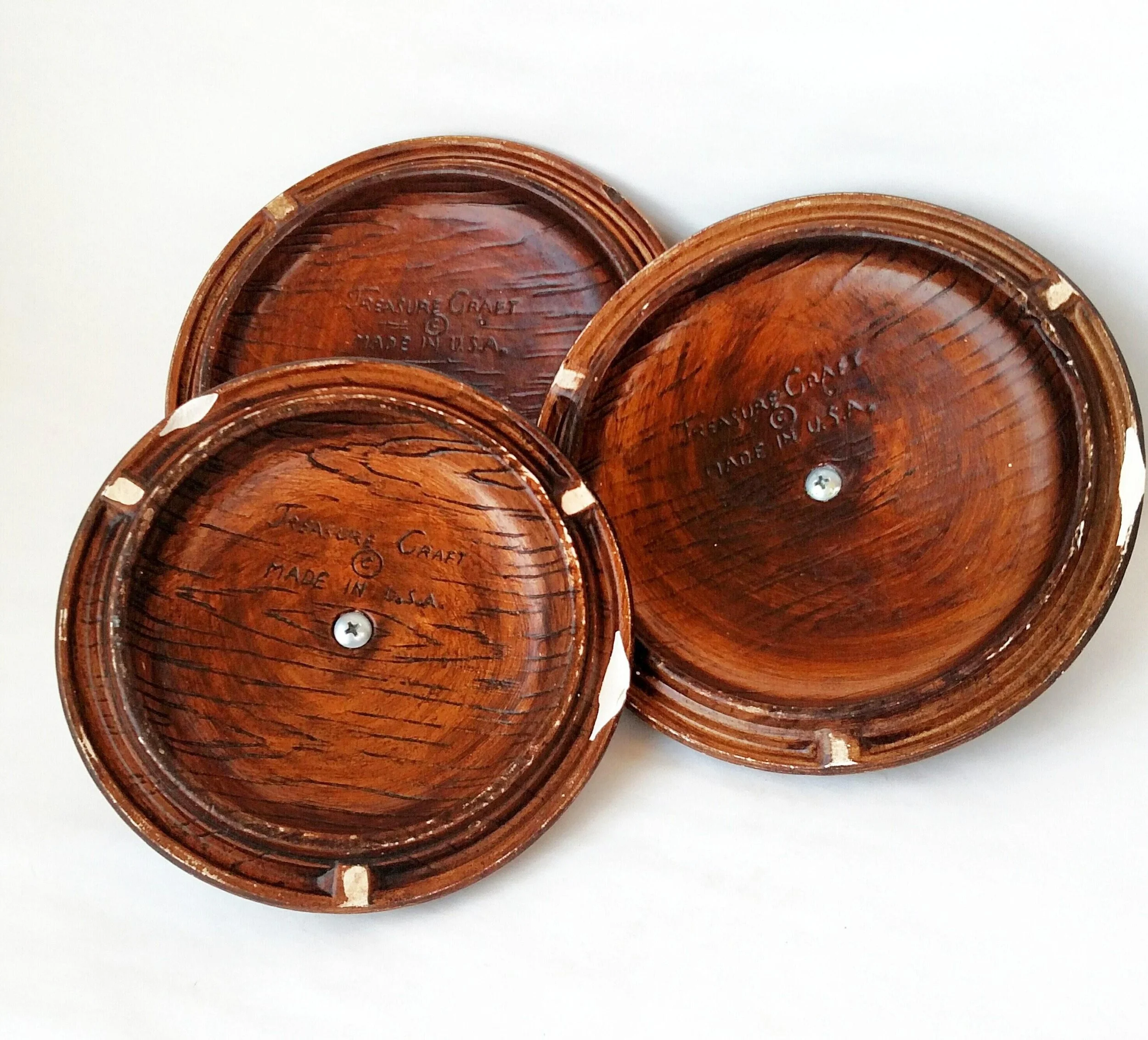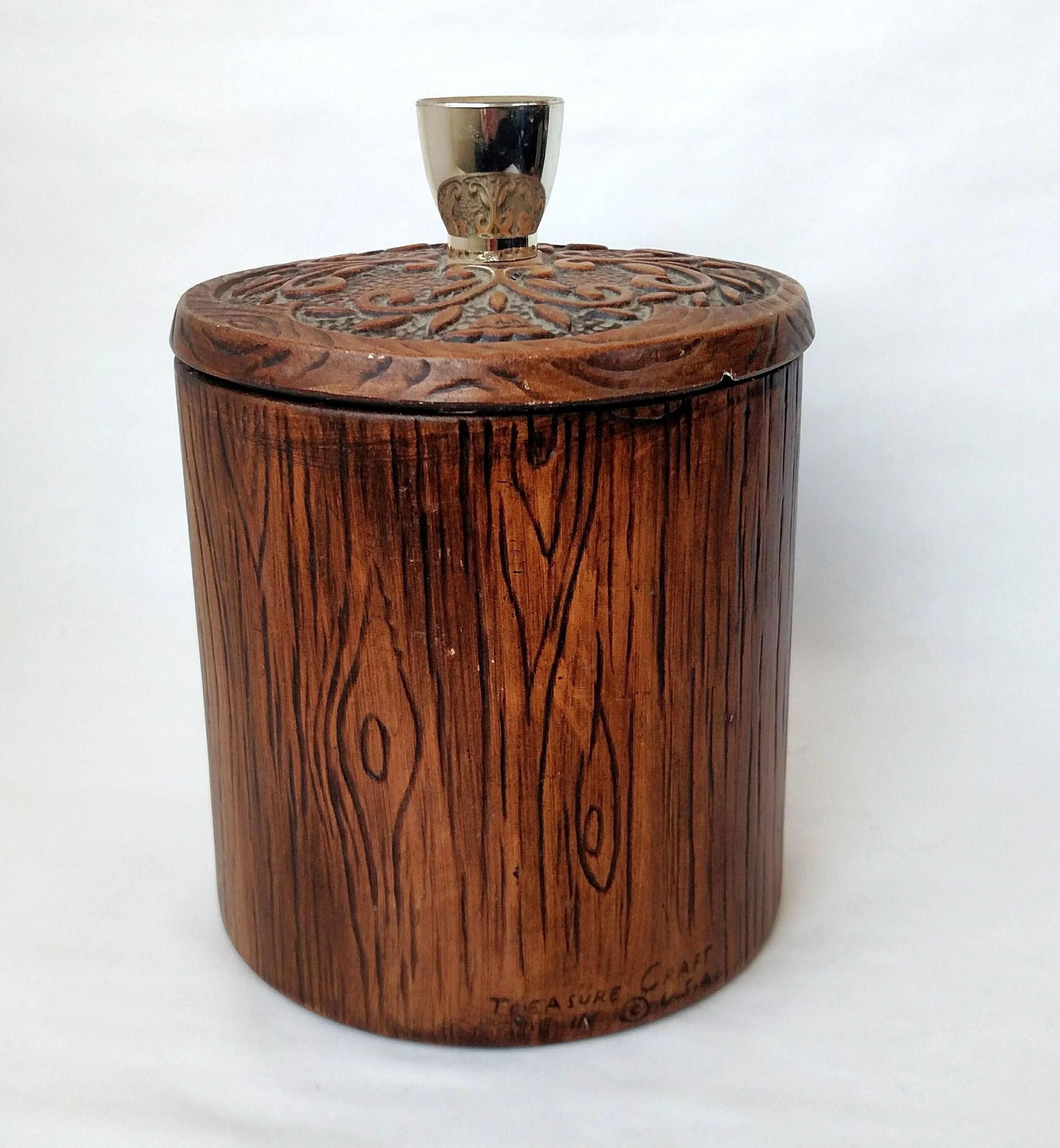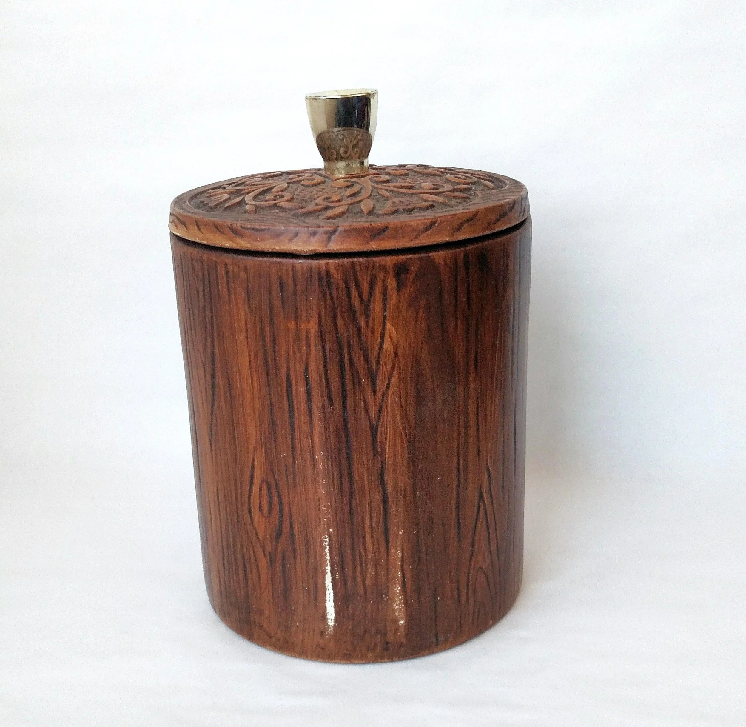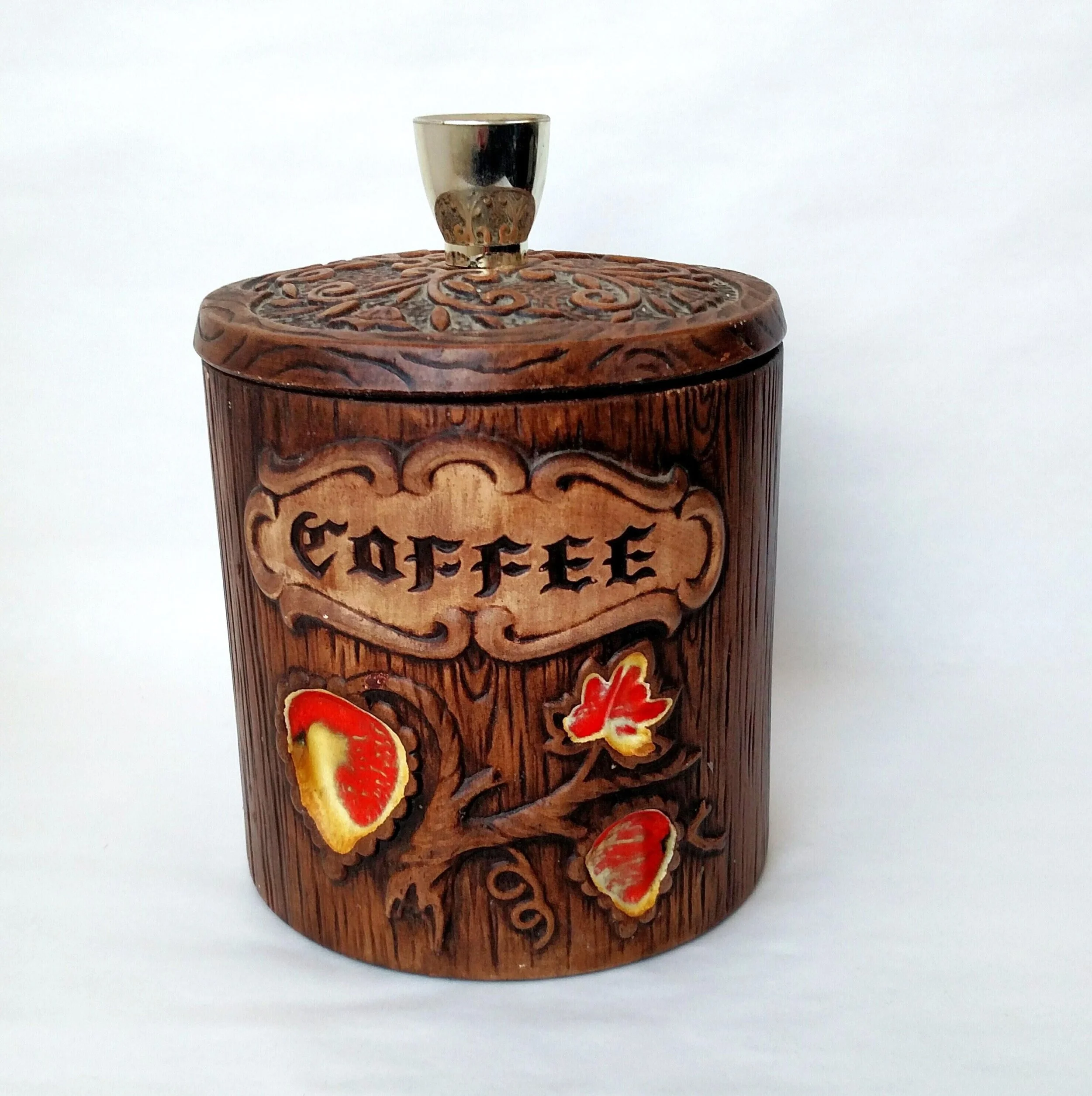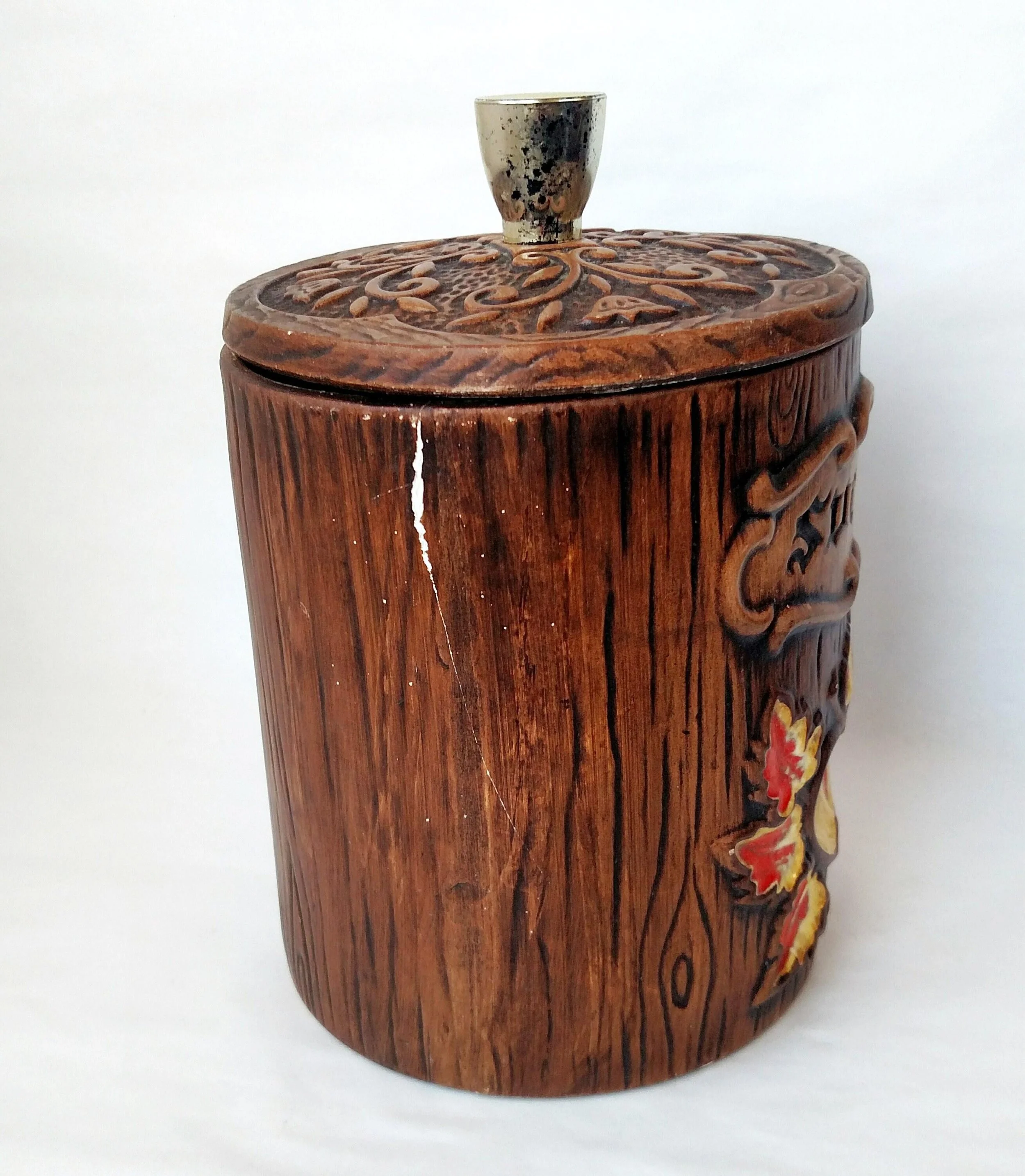 These charming vintage ceramic canisters feature a wood grain texture with a orange and yellow glazed fruit and leaf pattern. They have a rustic yet kitschy appeal that makes them a great addition to vintage inspired kitchens. The canisters are in used condition with some chips to the inside of the lids, some wear and discoloration to the knobs, and one piece (the sugar canister) does have a crack on its side that can probably be stabilized with some glue.