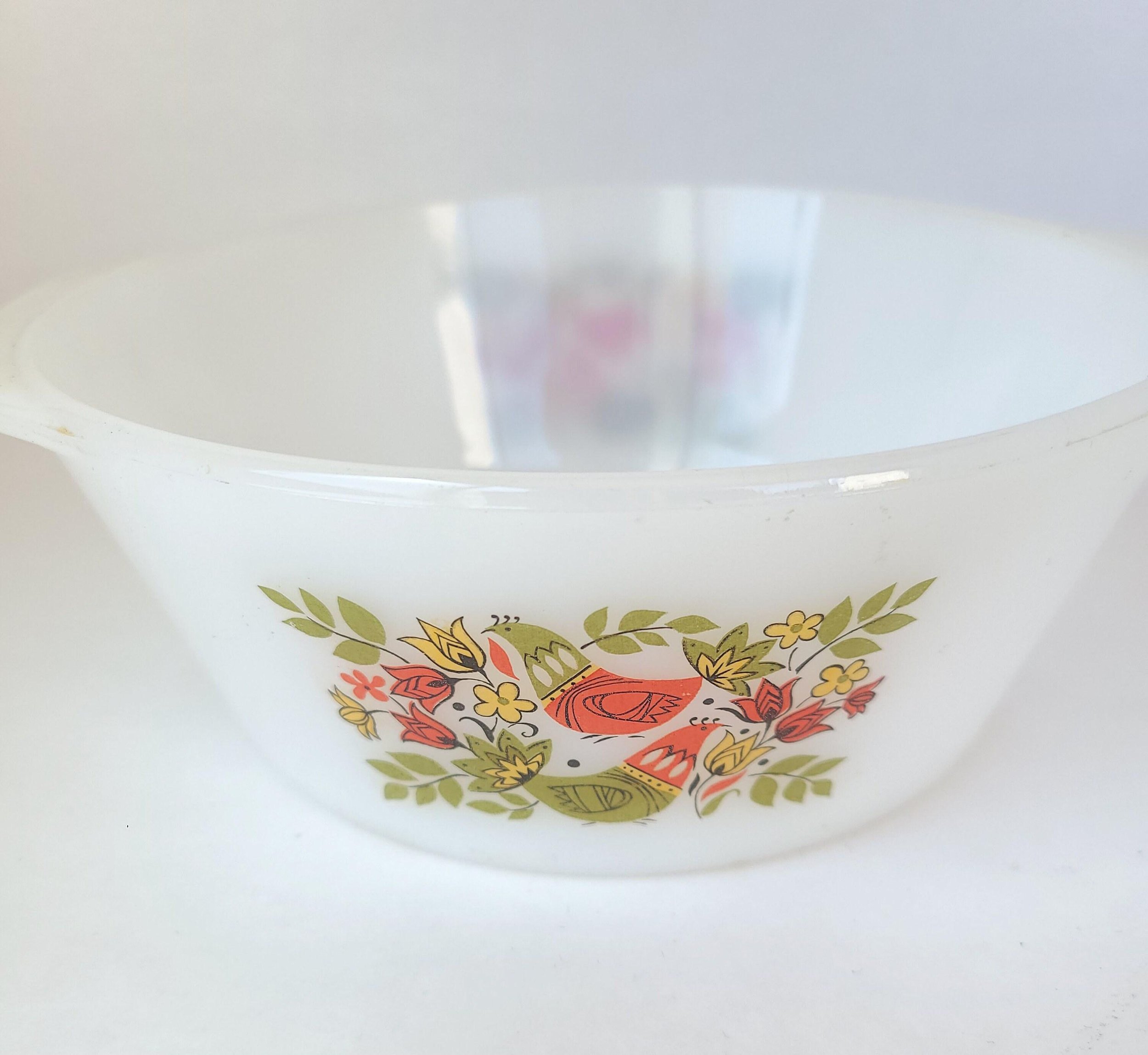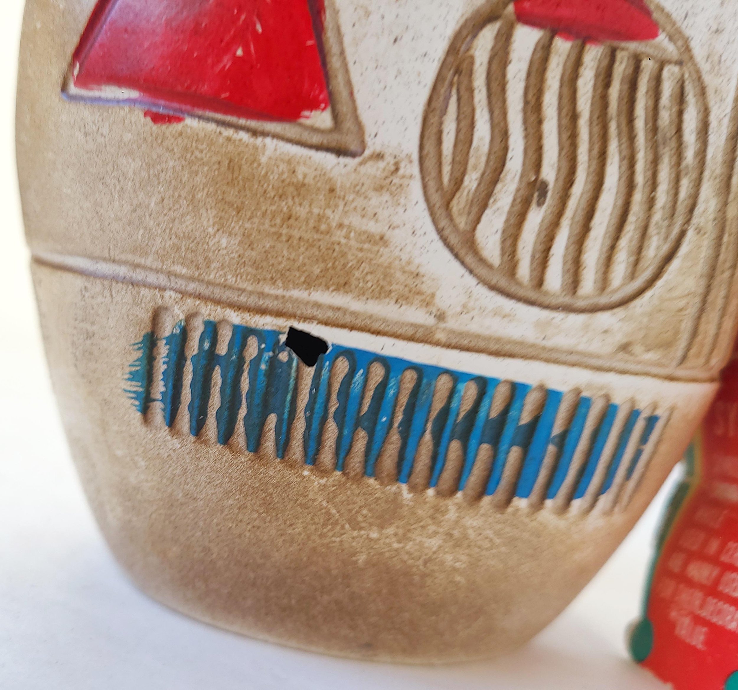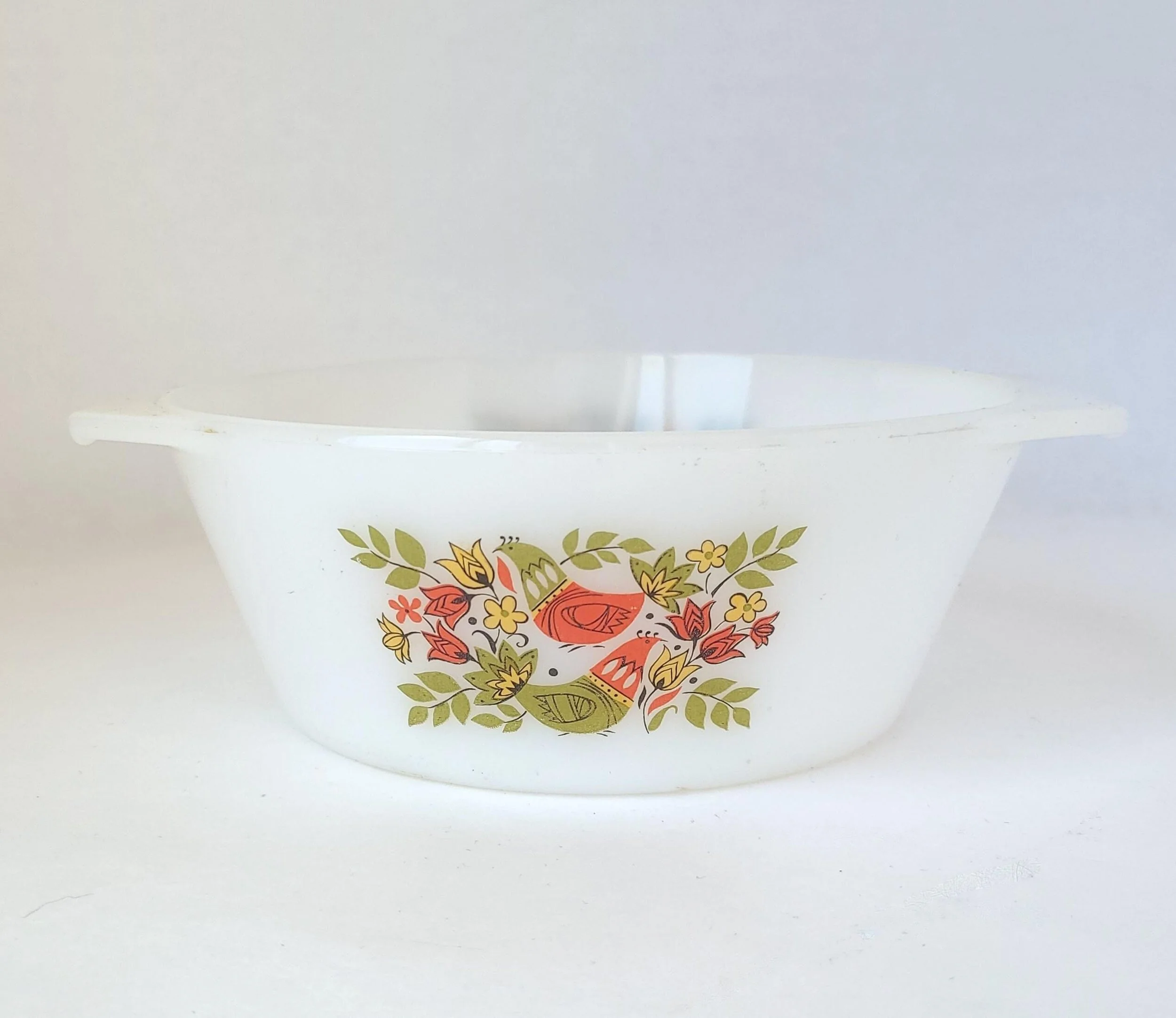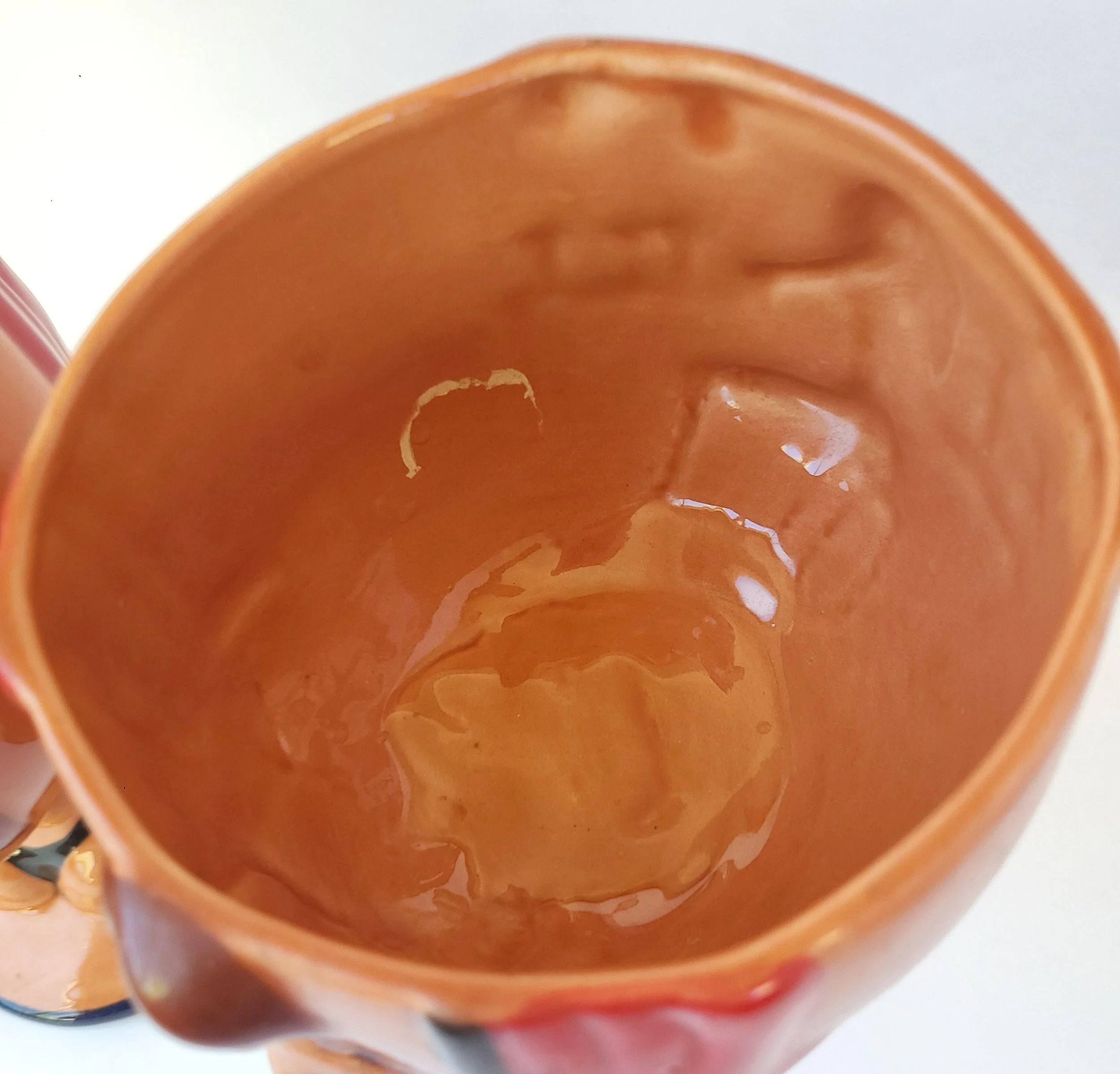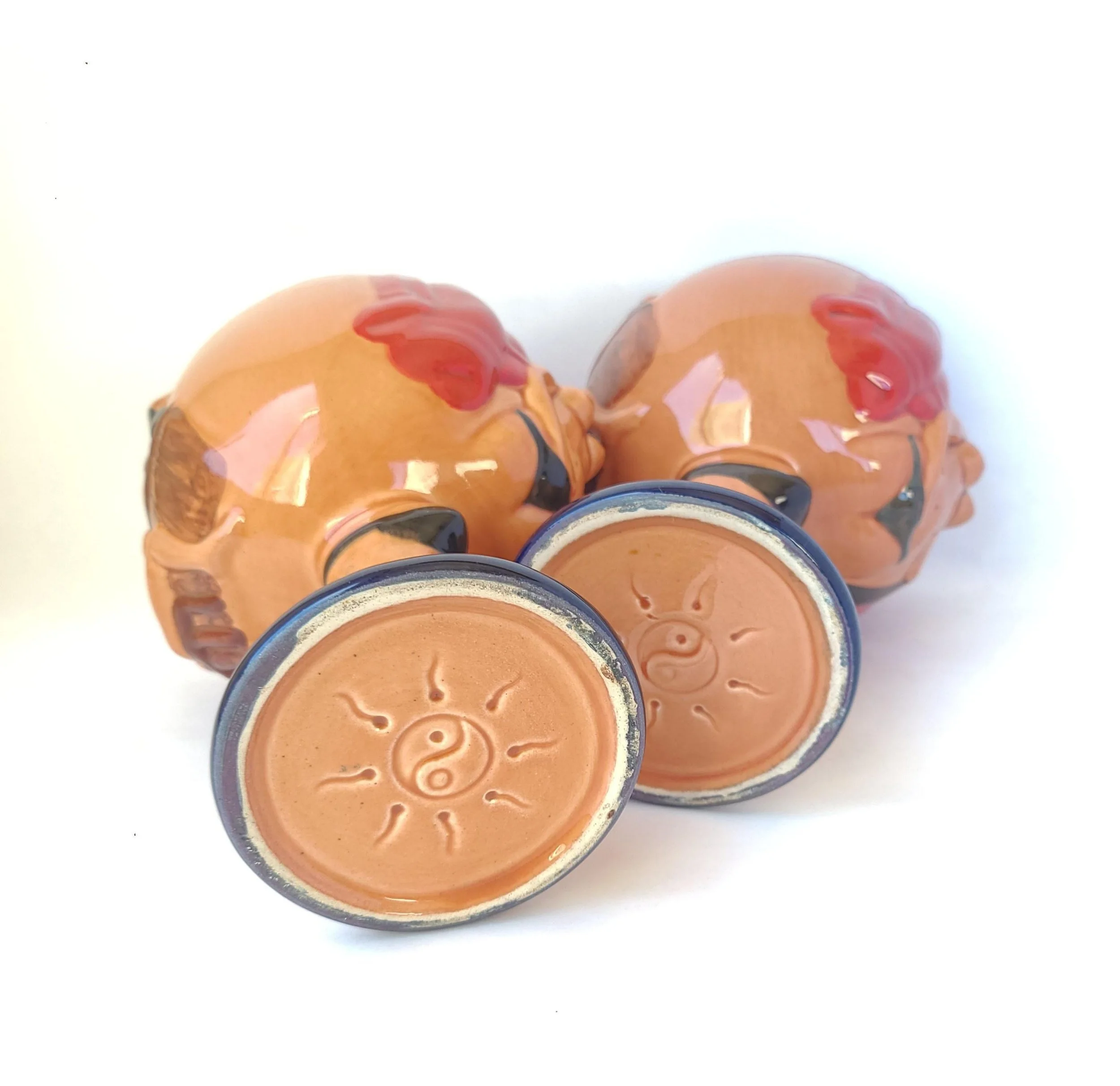 These charming vintage ceramic canisters feature a wood grain texture with a orange and yellow glazed fruit and leaf pattern. They have a rustic yet kitschy appeal that makes them a great addition to vintage inspired kitchens. The canisters are in used condition with some chips to the inside of the lids, some wear and discoloration to the knobs, and one piece (the sugar canister) does have a crack on its side that can probably be stabilized with some glue.
