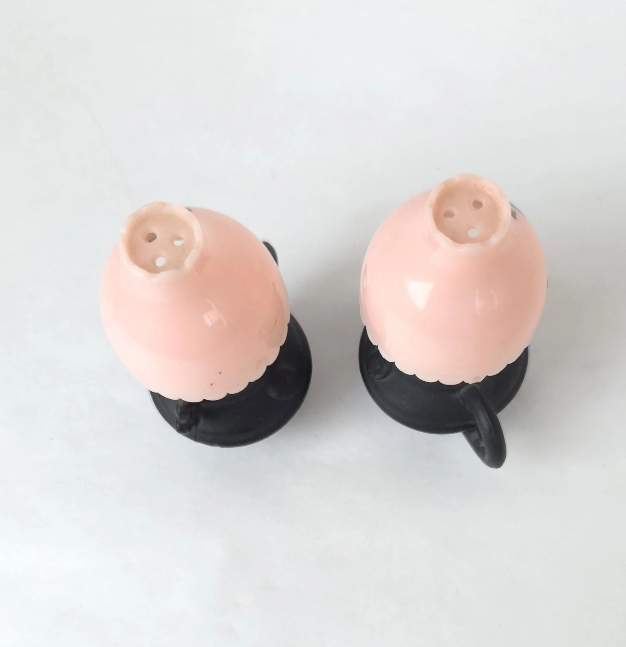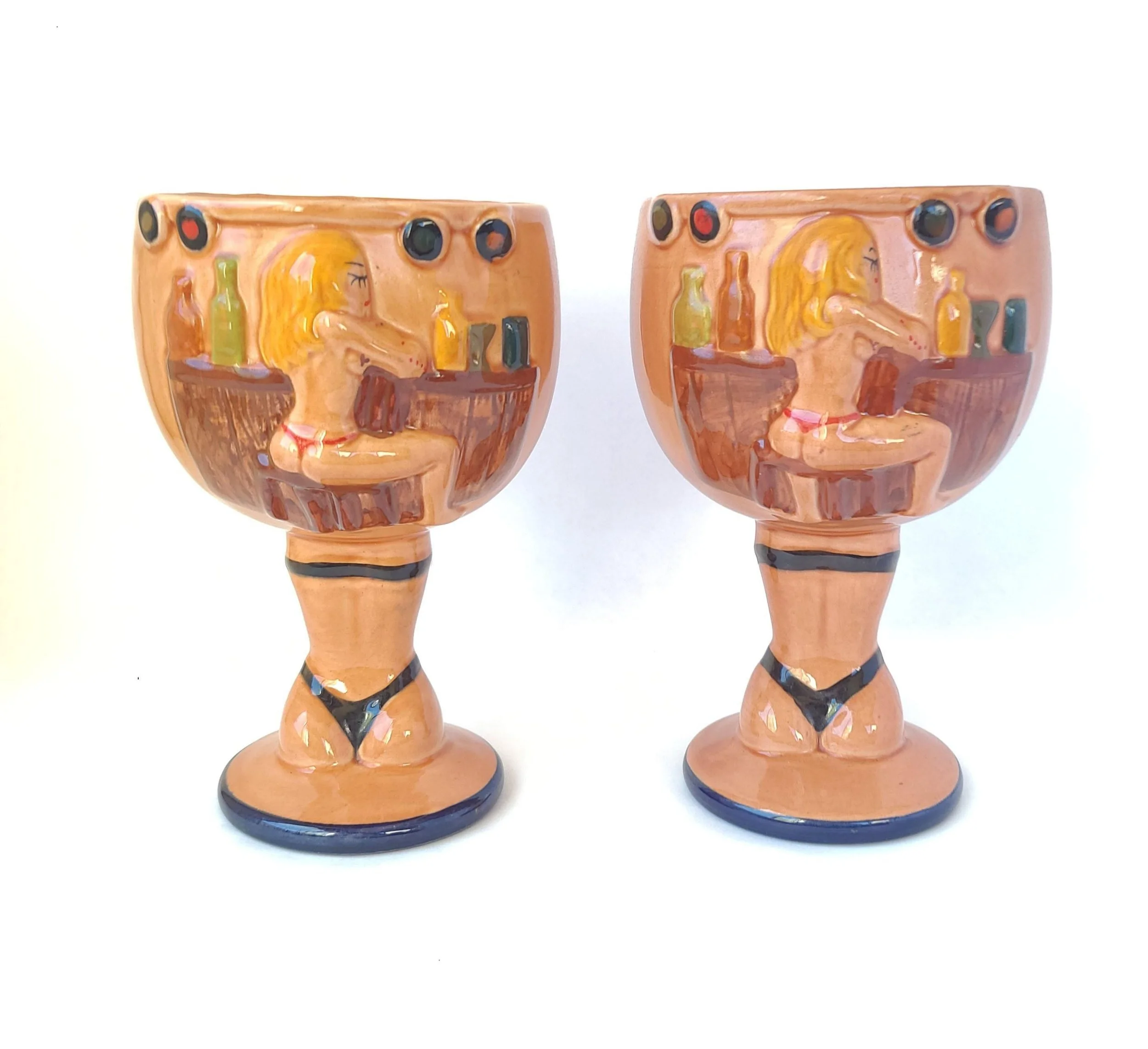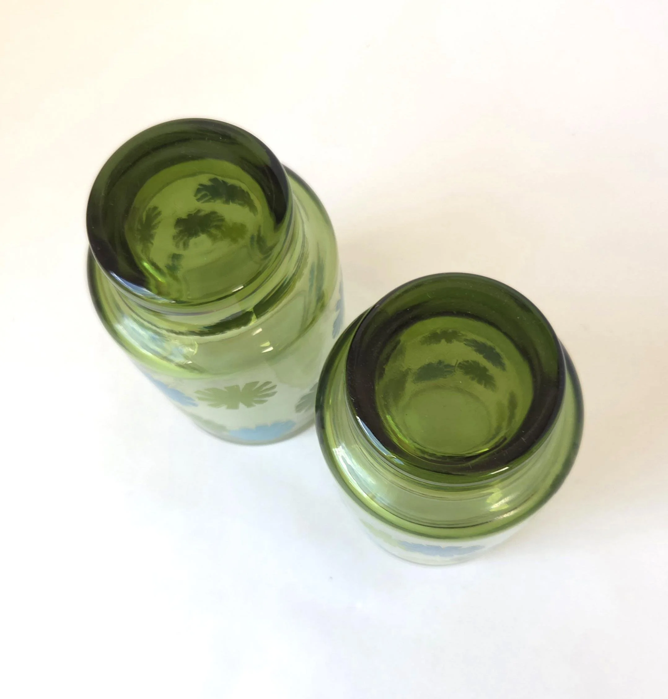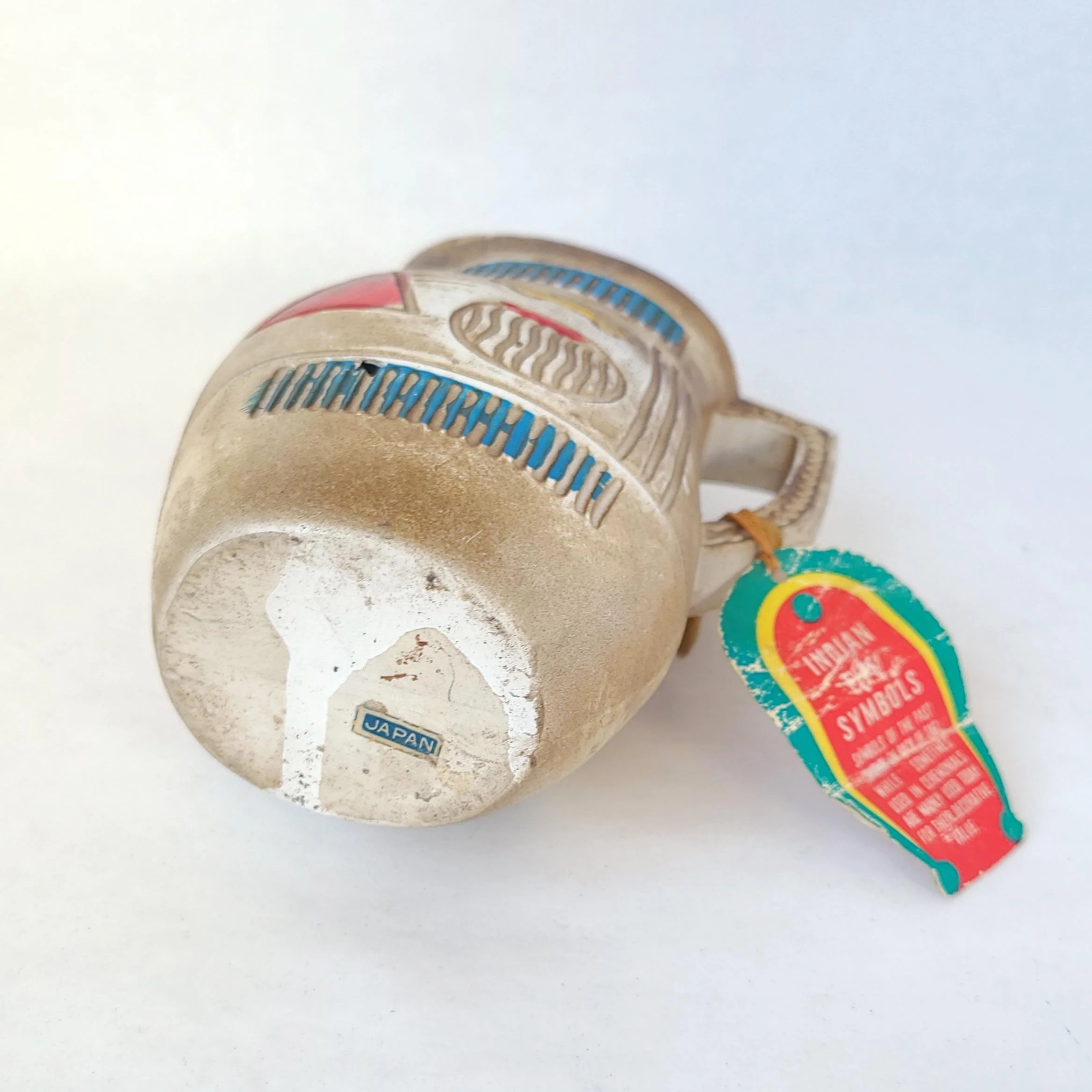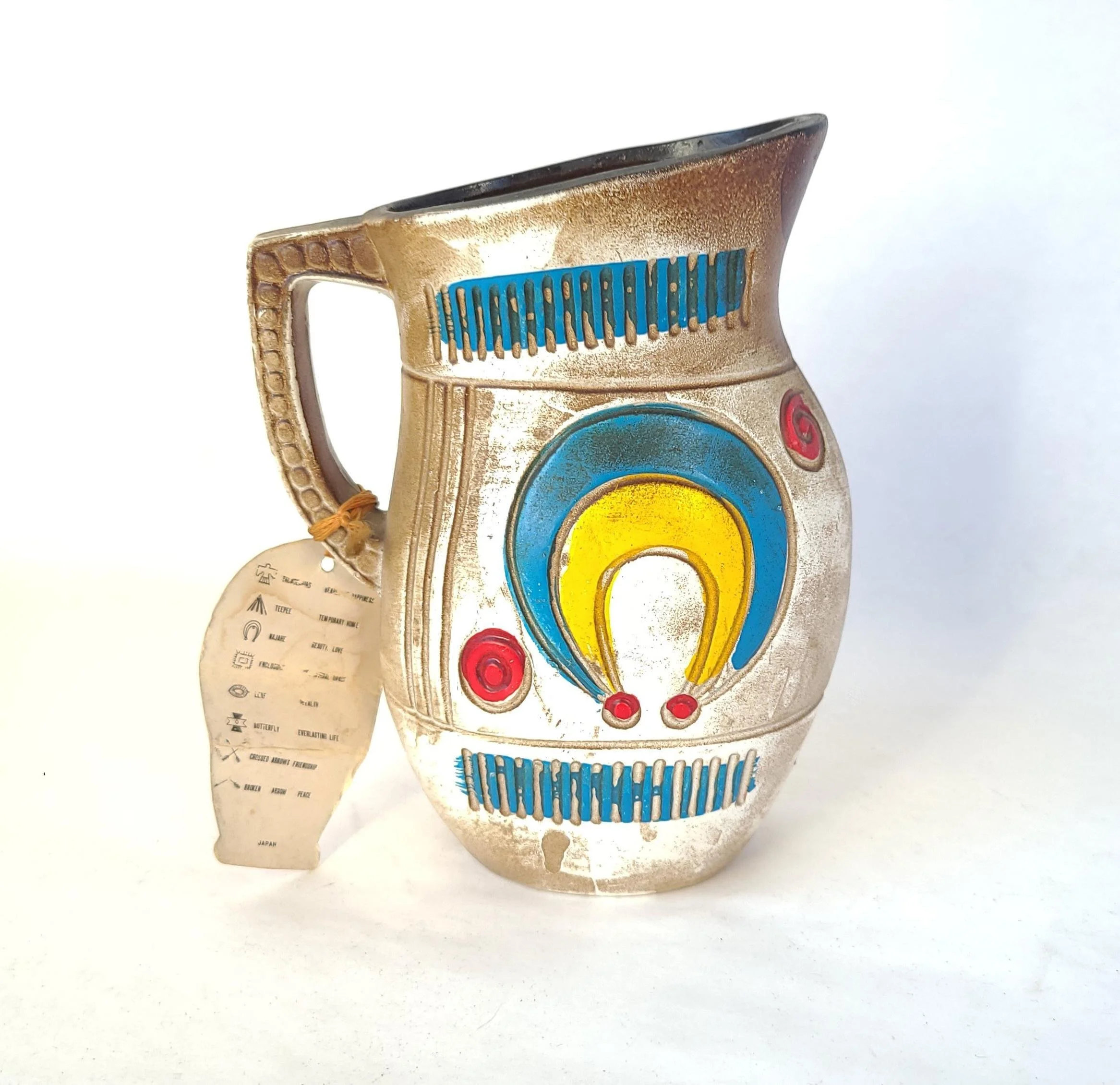 These charming vintage ceramic canisters feature a wood grain texture with a orange and yellow glazed fruit and leaf pattern. They have a rustic yet kitschy appeal that makes them a great addition to vintage inspired kitchens. The canisters are in used condition with some chips to the inside of the lids, some wear and discoloration to the knobs, and one piece (the sugar canister) does have a crack on its side that can probably be stabilized with some glue.