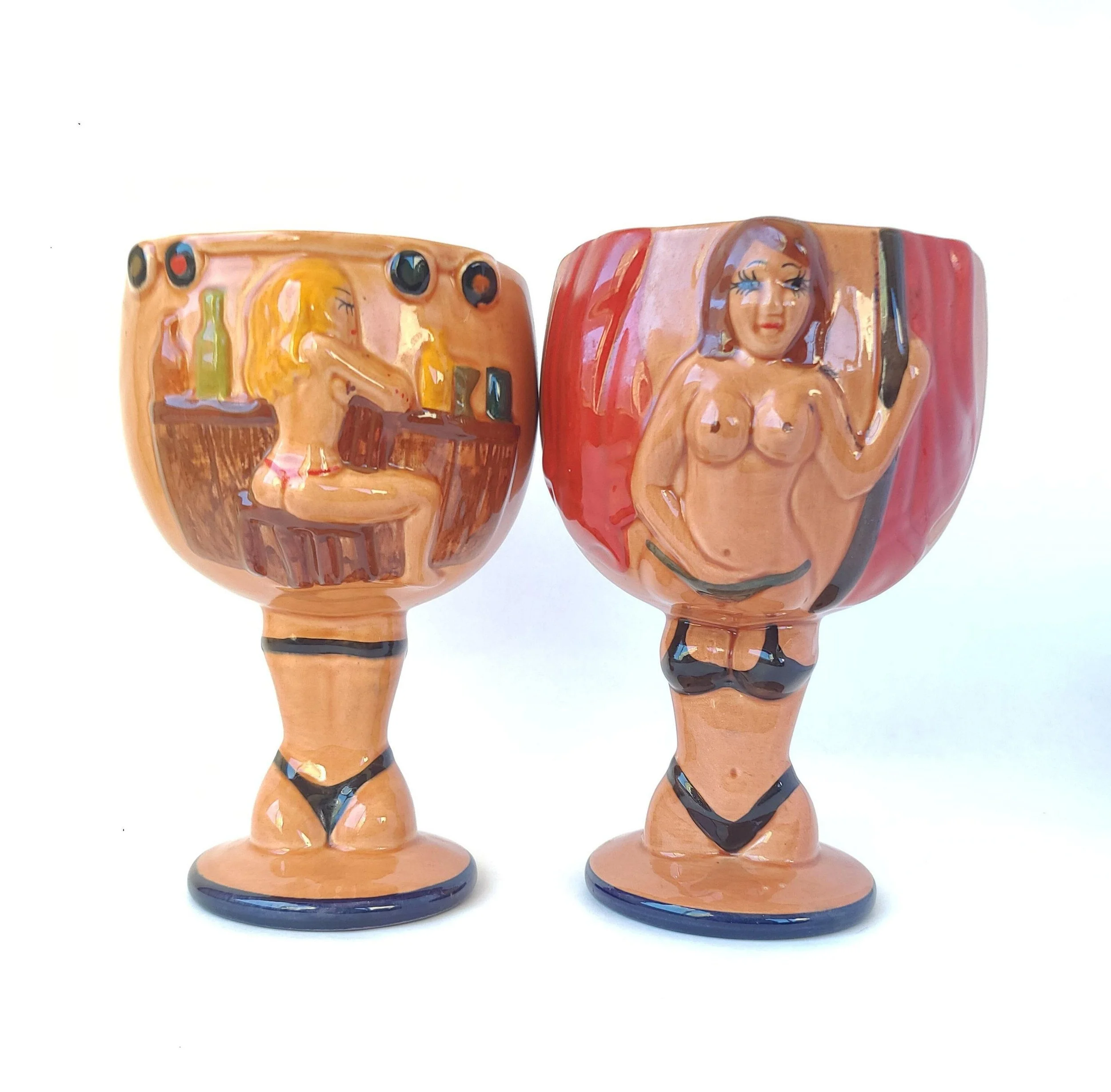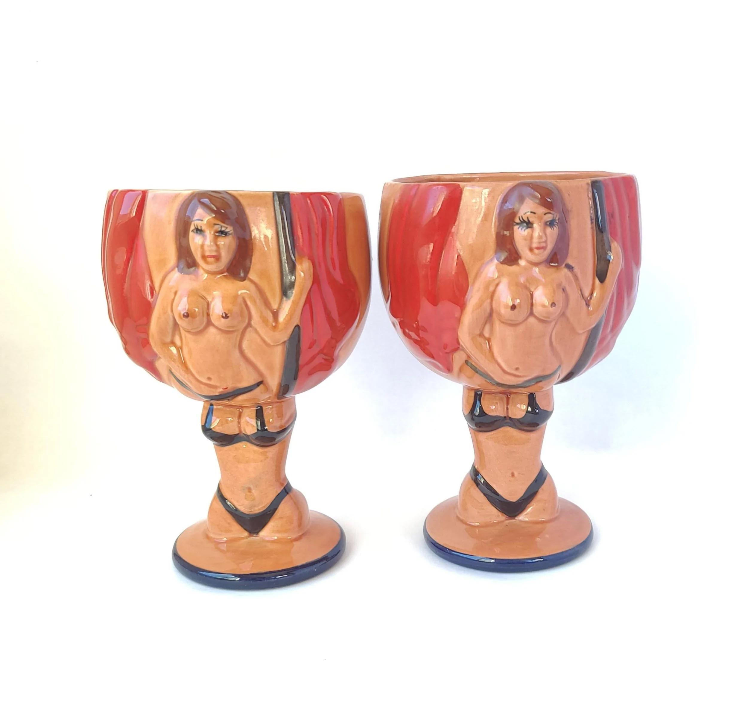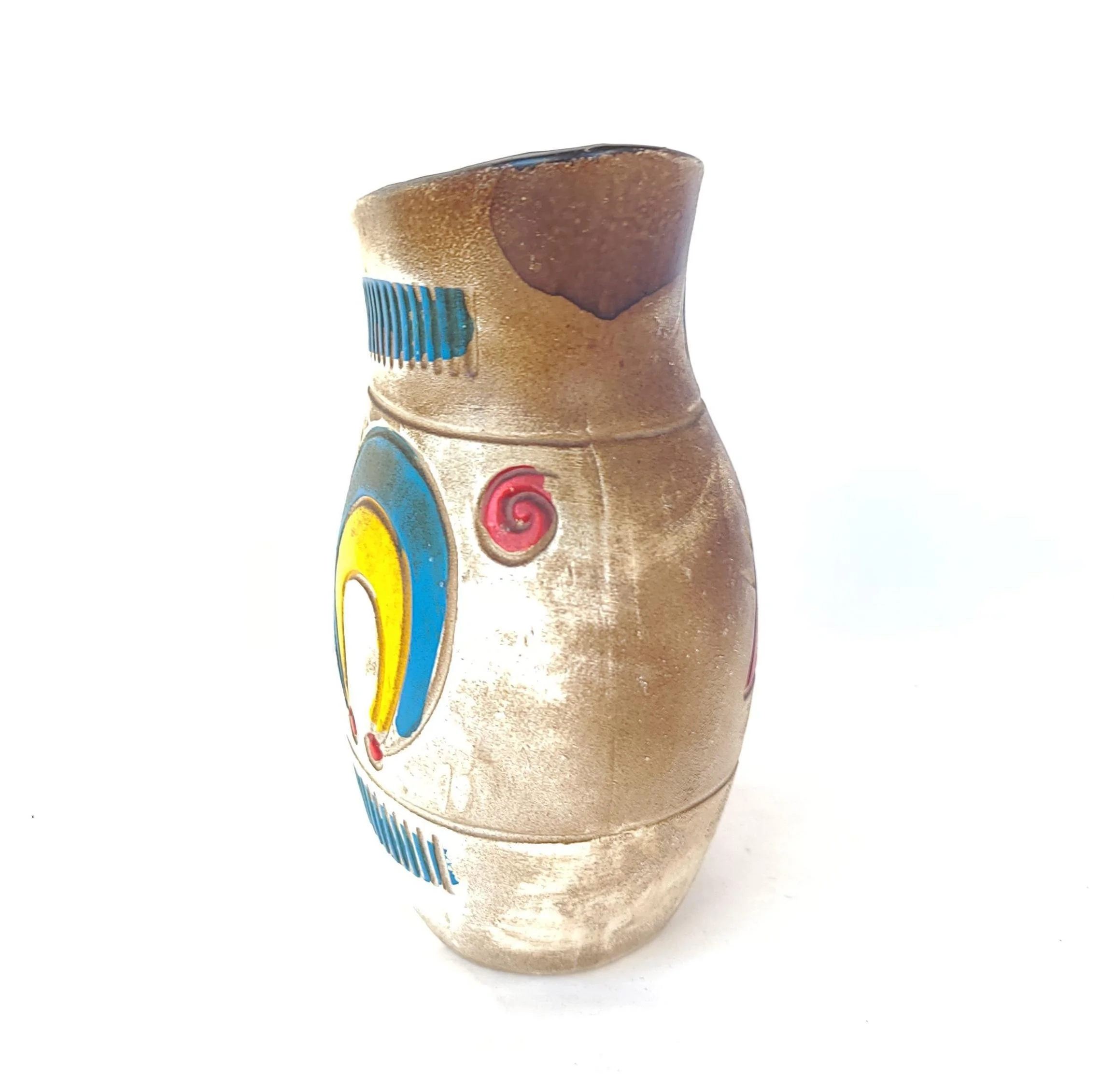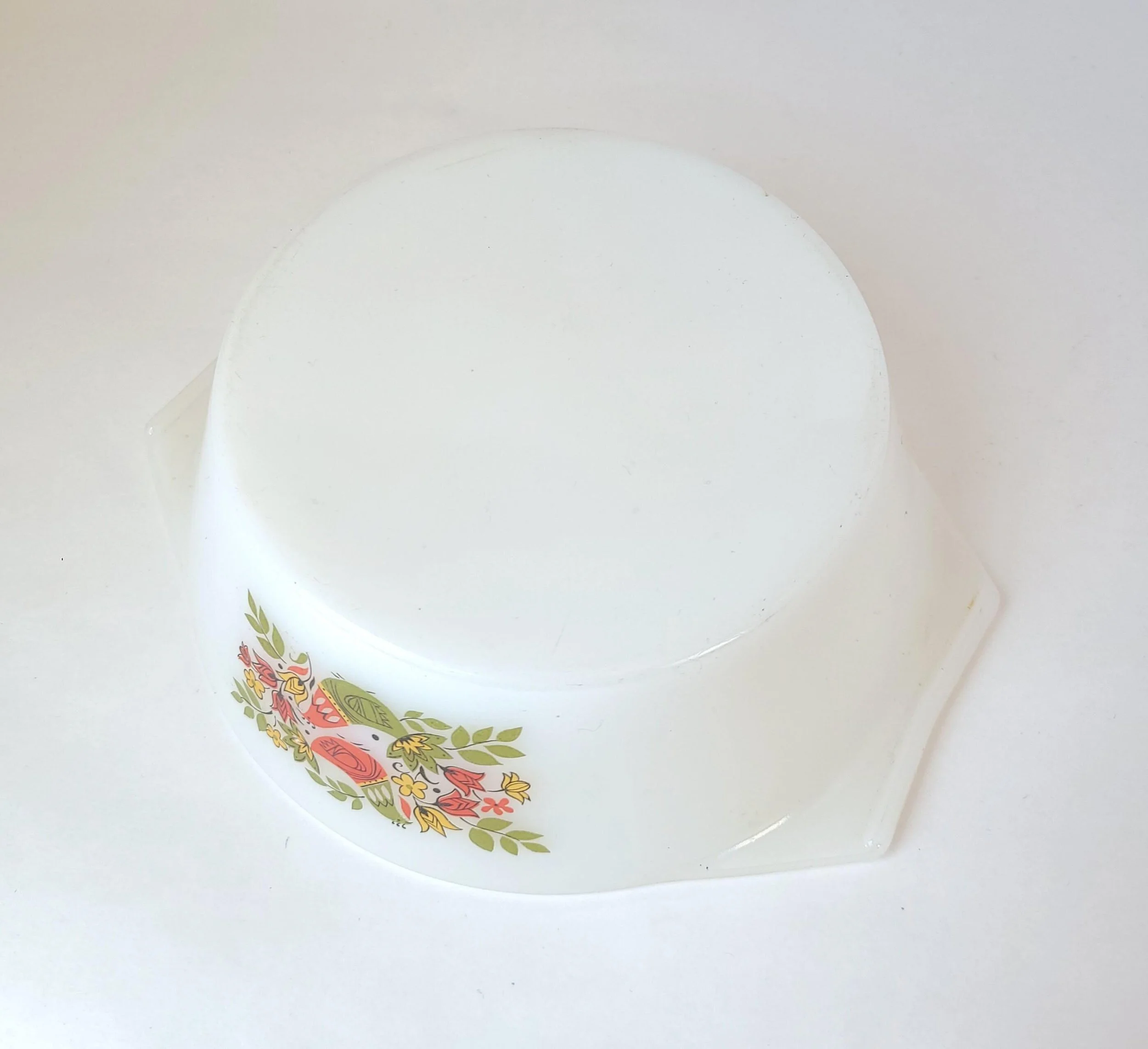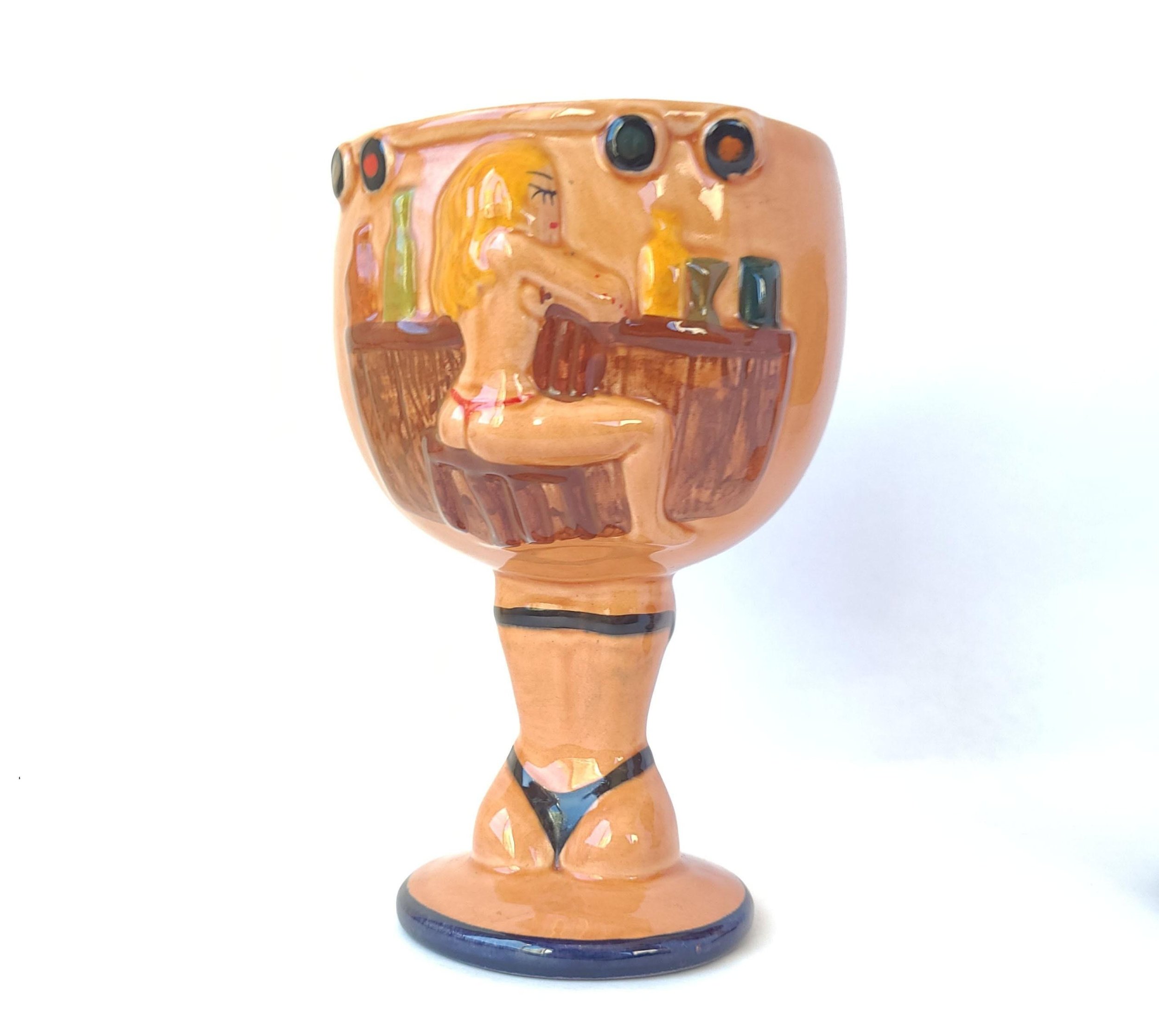 These charming vintage ceramic canisters feature a wood grain texture with a orange and yellow glazed fruit and leaf pattern. They have a rustic yet kitschy appeal that makes them a great addition to vintage inspired kitchens. The canisters are in used condition with some chips to the inside of the lids, some wear and discoloration to the knobs, and one piece (the sugar canister) does have a crack on its side that can probably be stabilized with some glue.