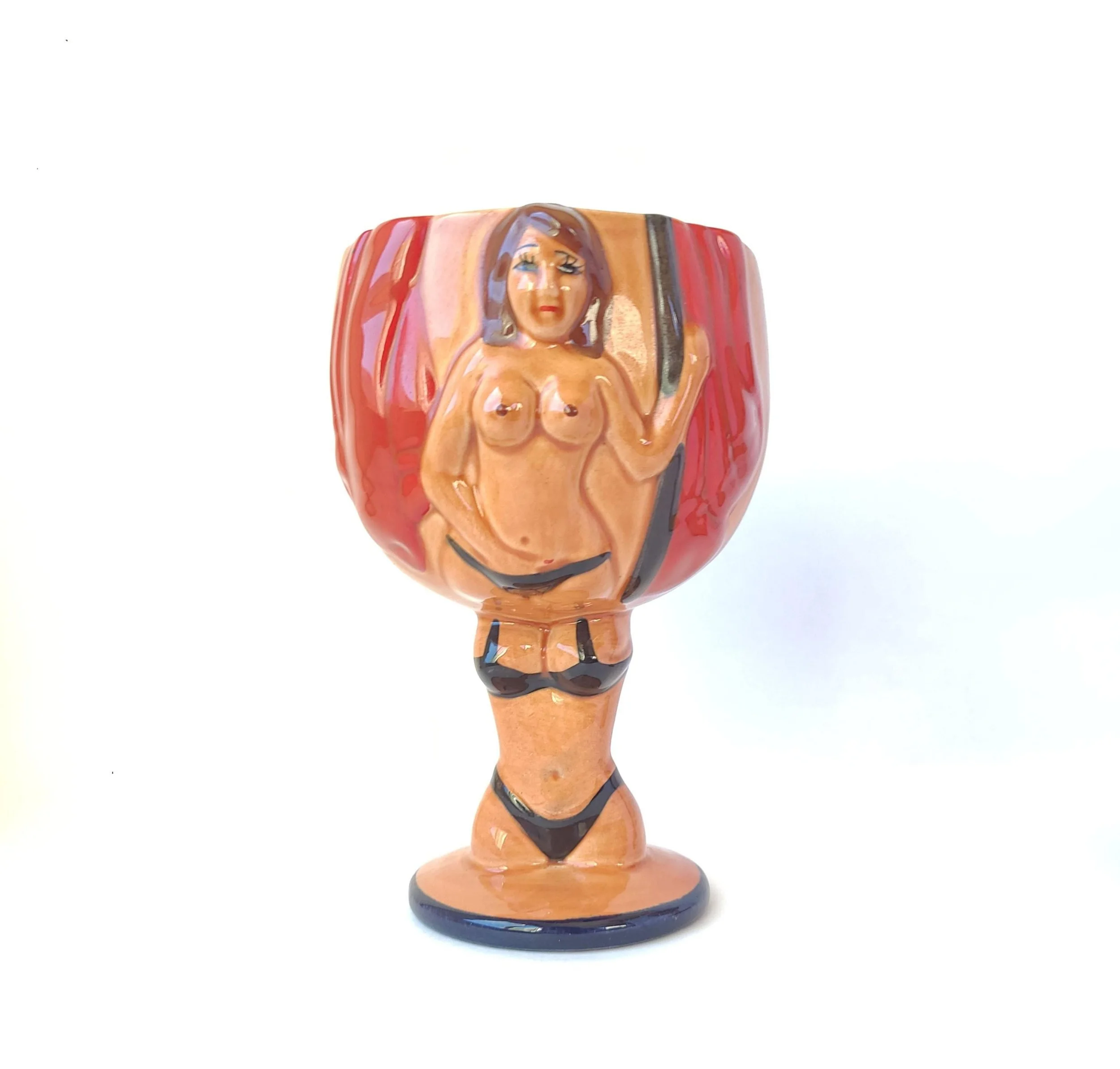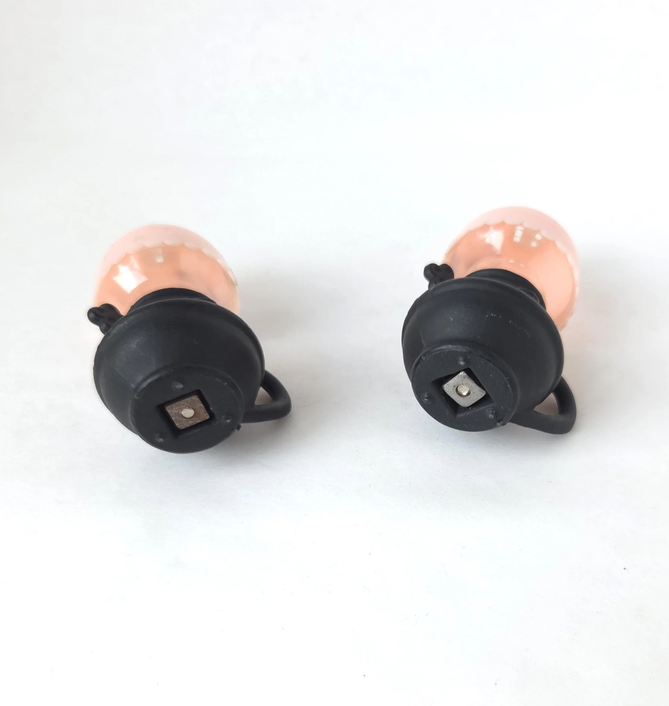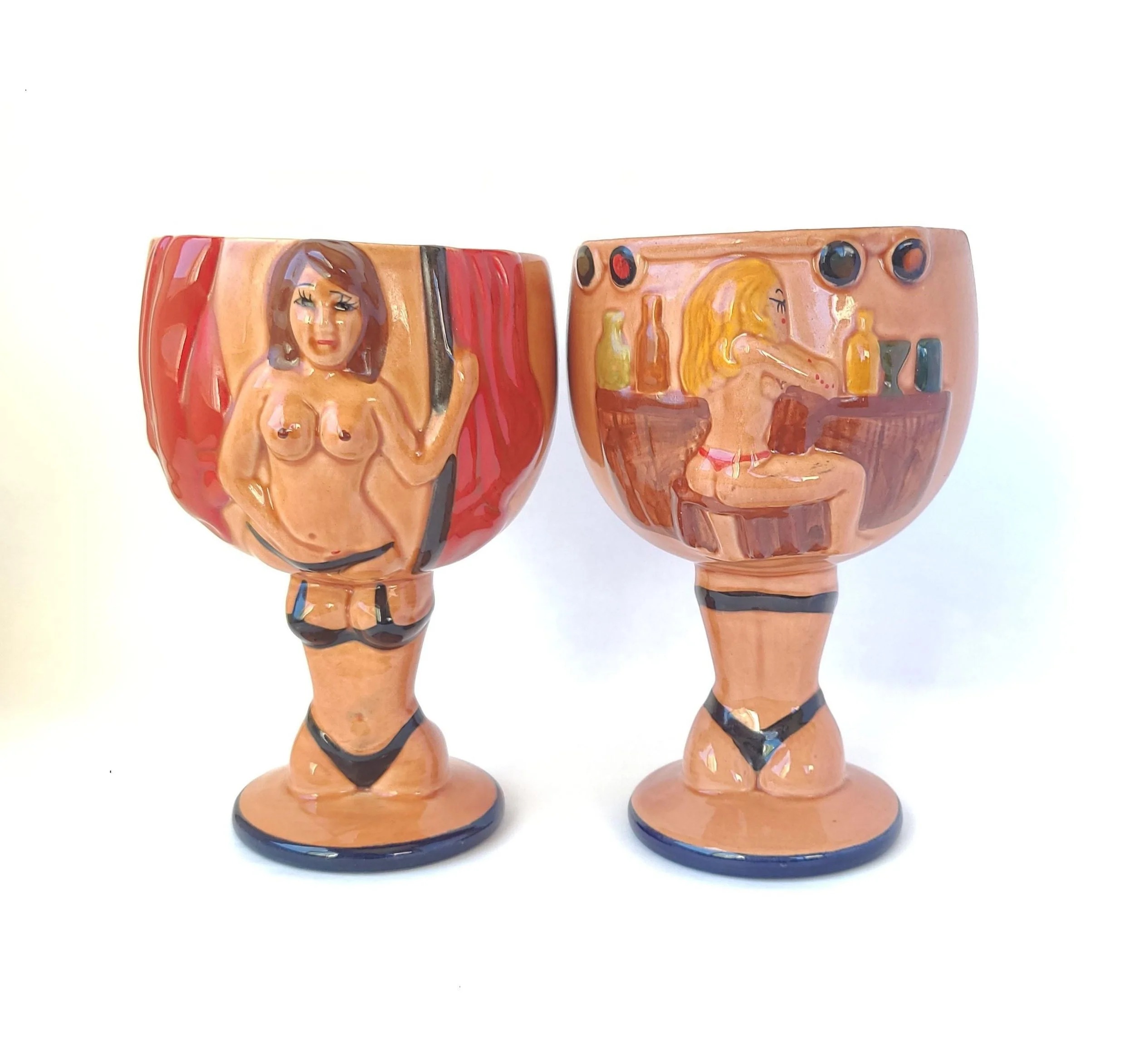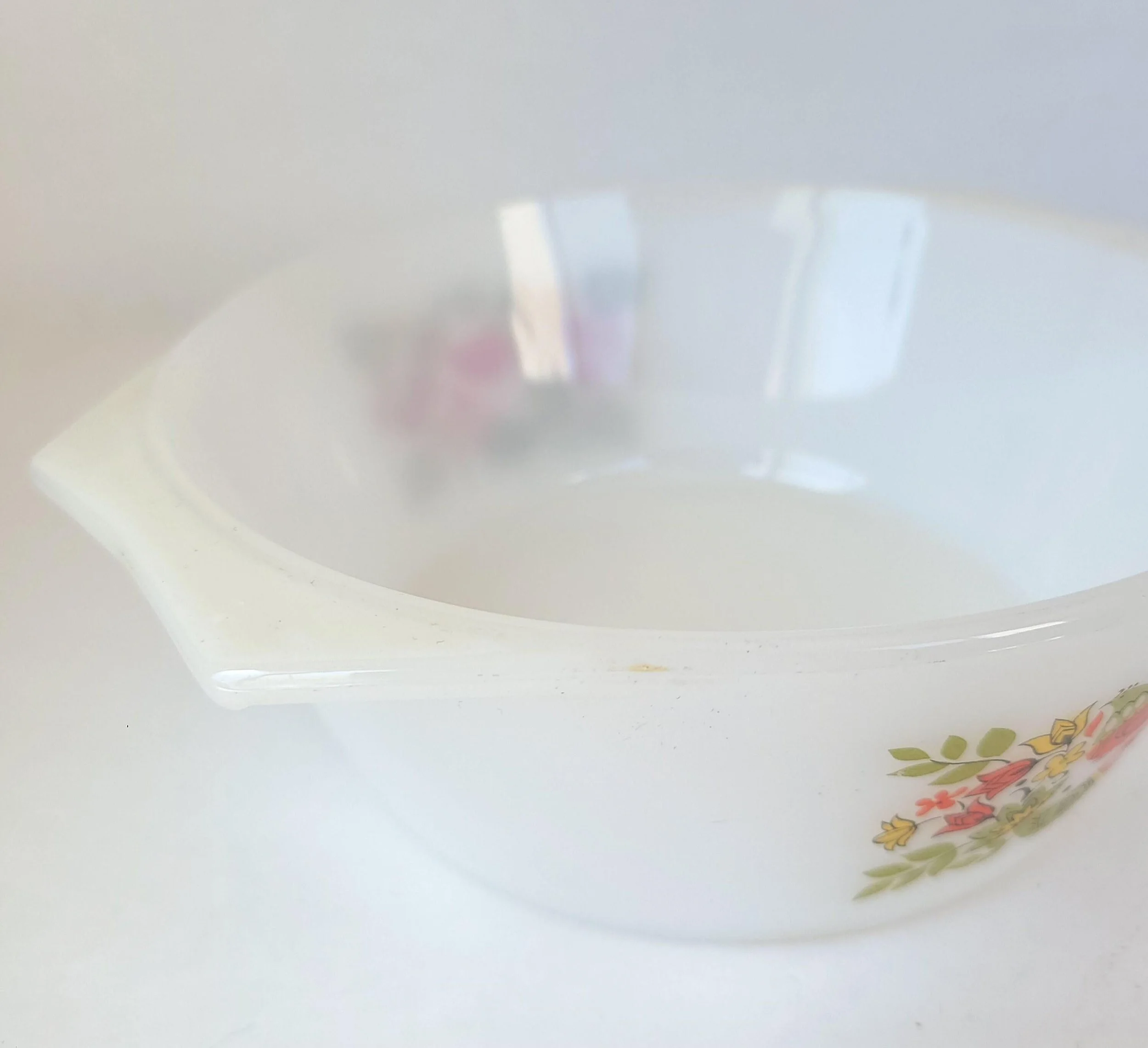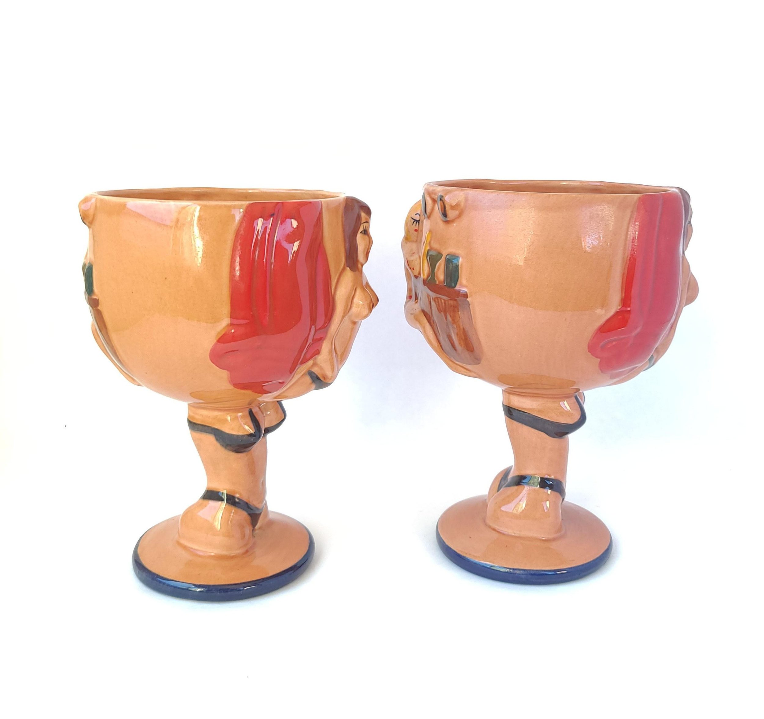 These charming vintage ceramic canisters feature a wood grain texture with a orange and yellow glazed fruit and leaf pattern. They have a rustic yet kitschy appeal that makes them a great addition to vintage inspired kitchens. The canisters are in used condition with some chips to the inside of the lids, some wear and discoloration to the knobs, and one piece (the sugar canister) does have a crack on its side that can probably be stabilized with some glue.