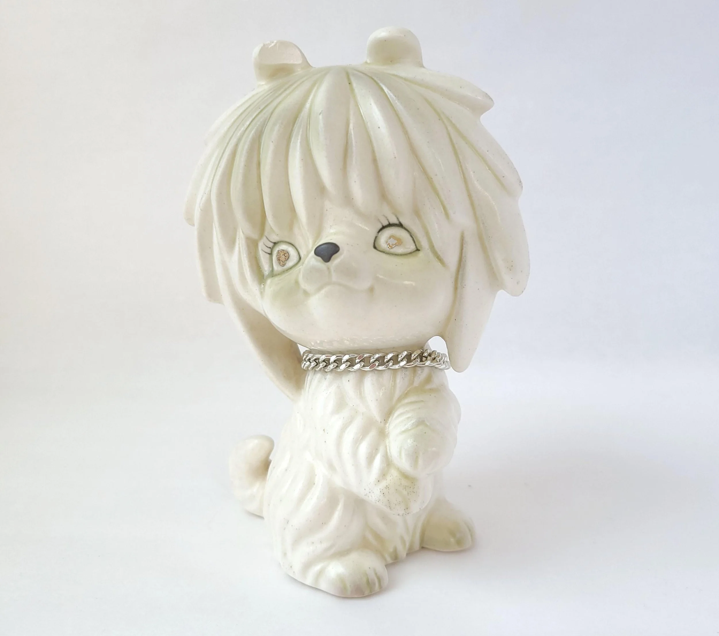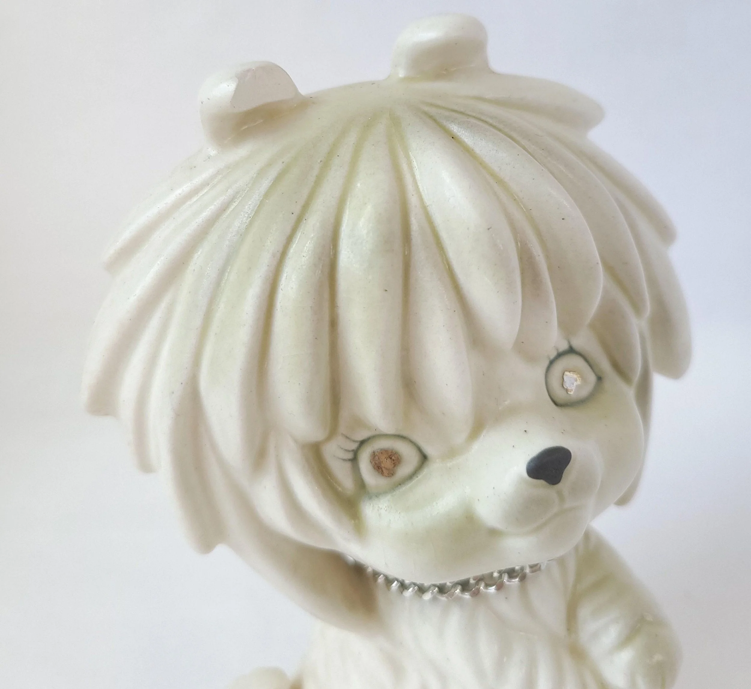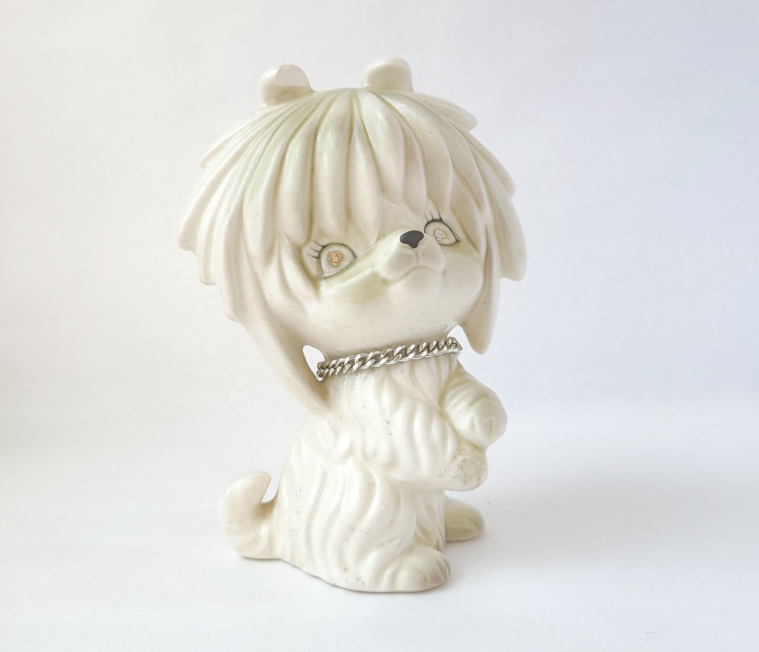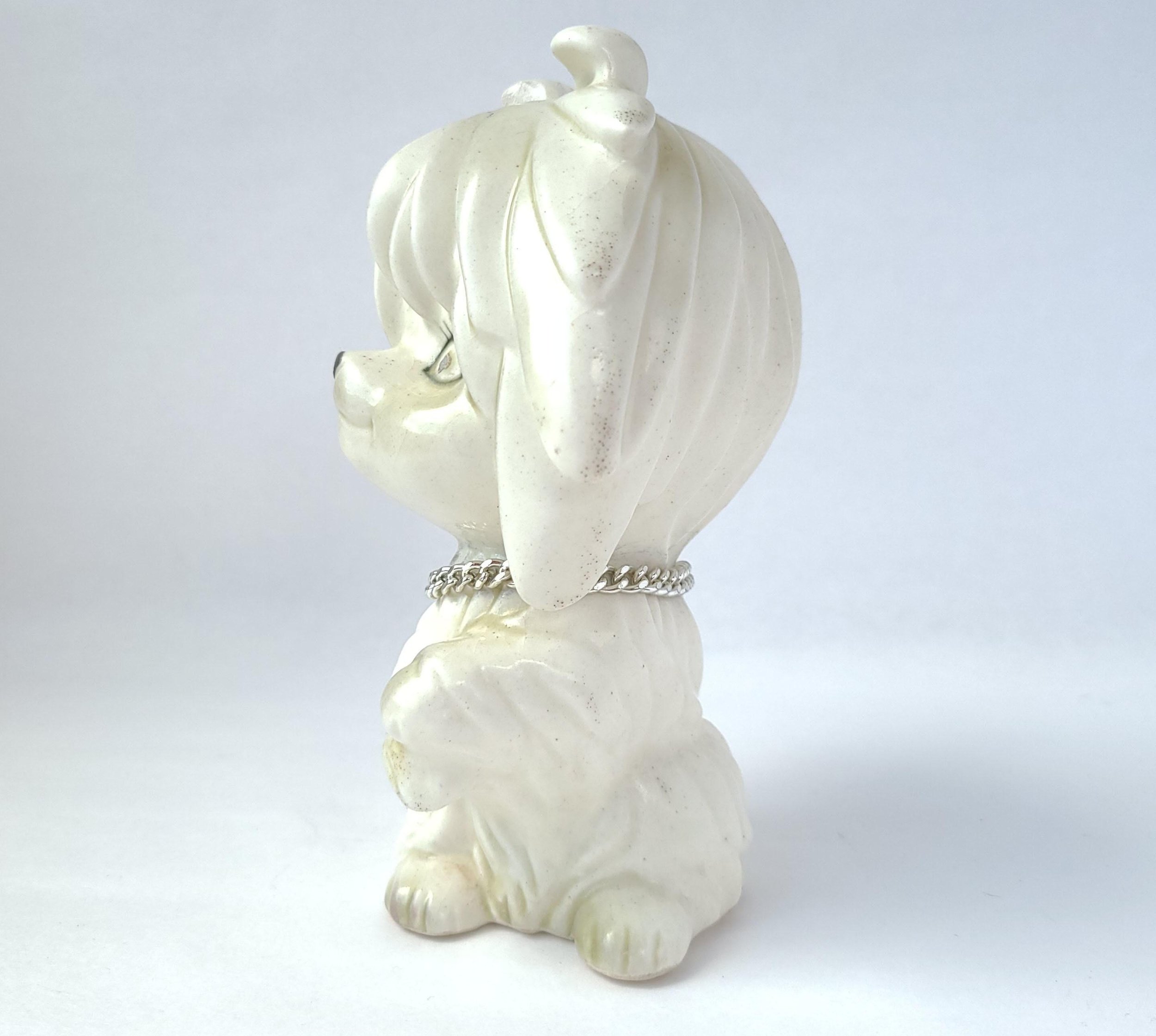 This adorable vintage ceramic dog figurine was made in Japan by Lego. The piece is in used condition and could use some love - so it's a great piece for restorers and crafty types. The piece has discoloration from age along with crazing to the glaze. There is a chip to both sides of one ear, the rhinestone eyes are missing, and there are some small chips along the coin slot.