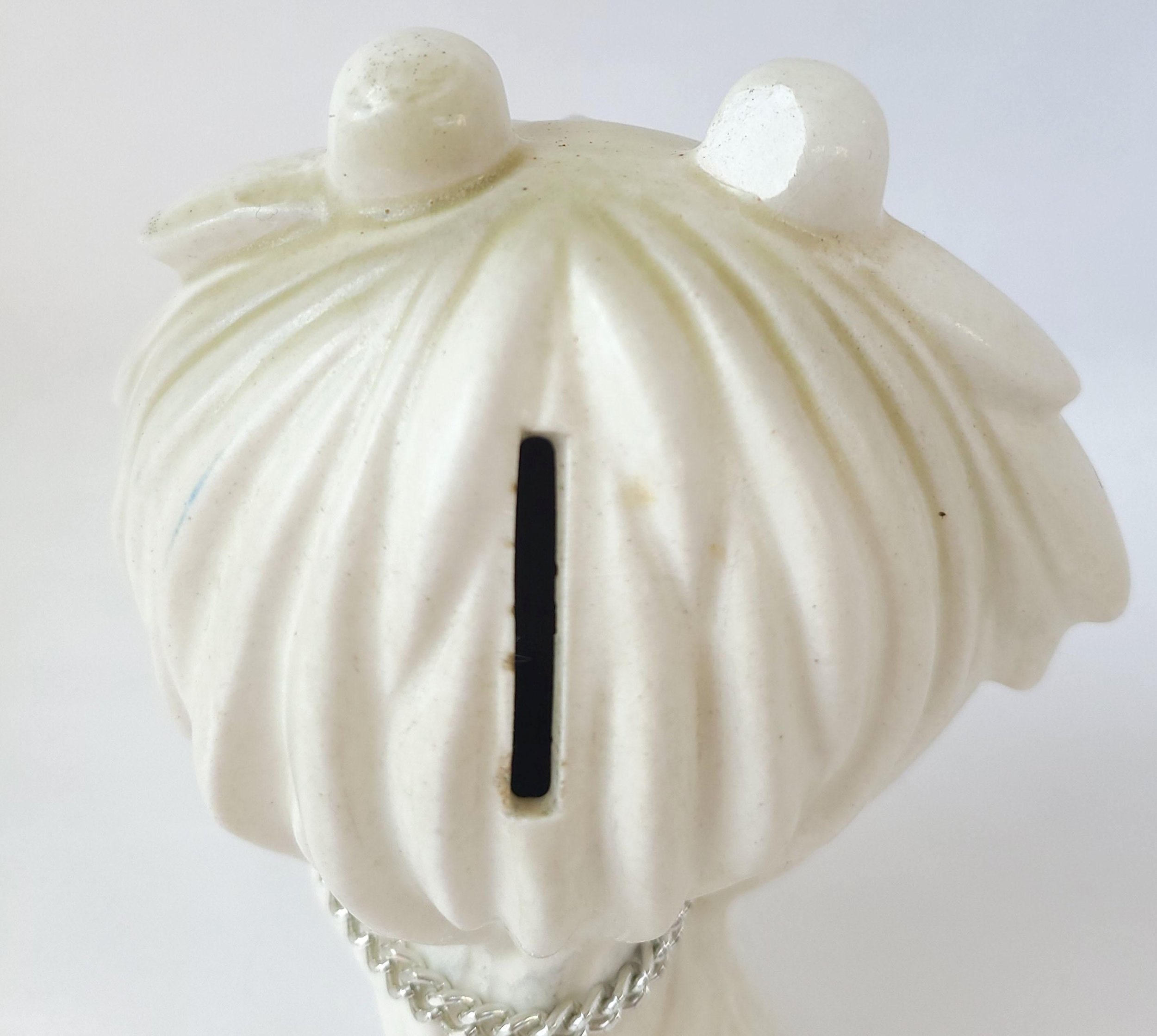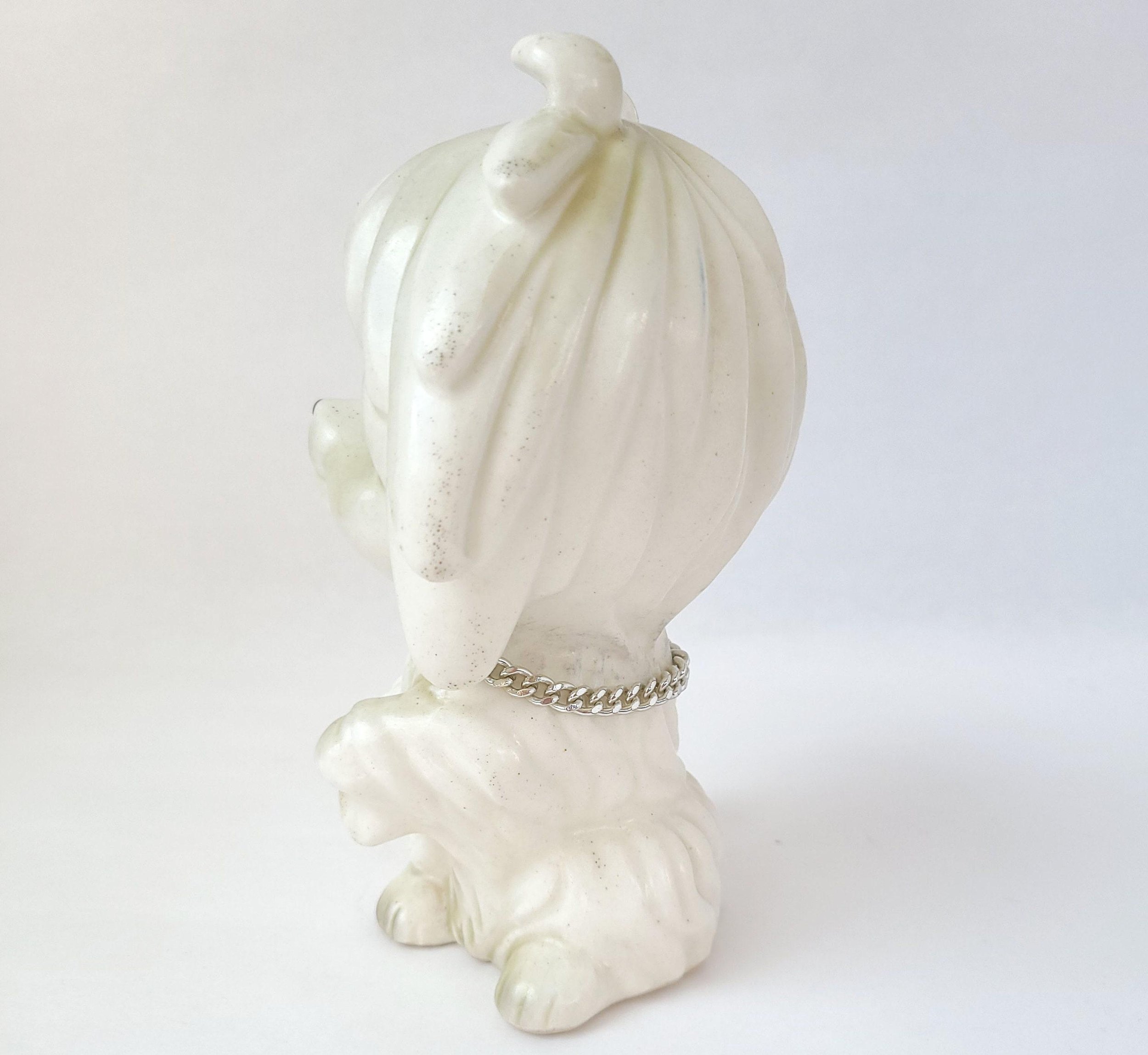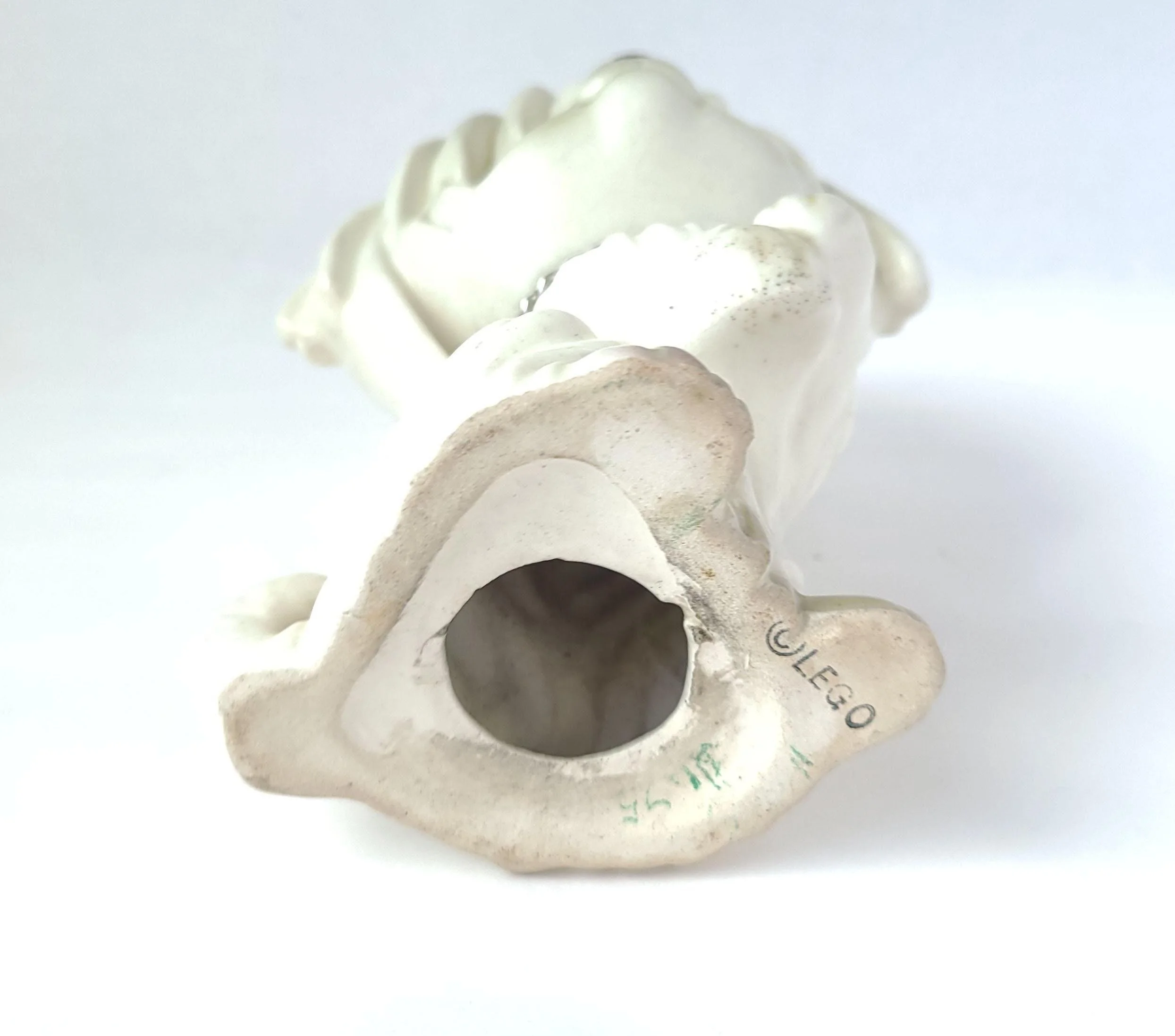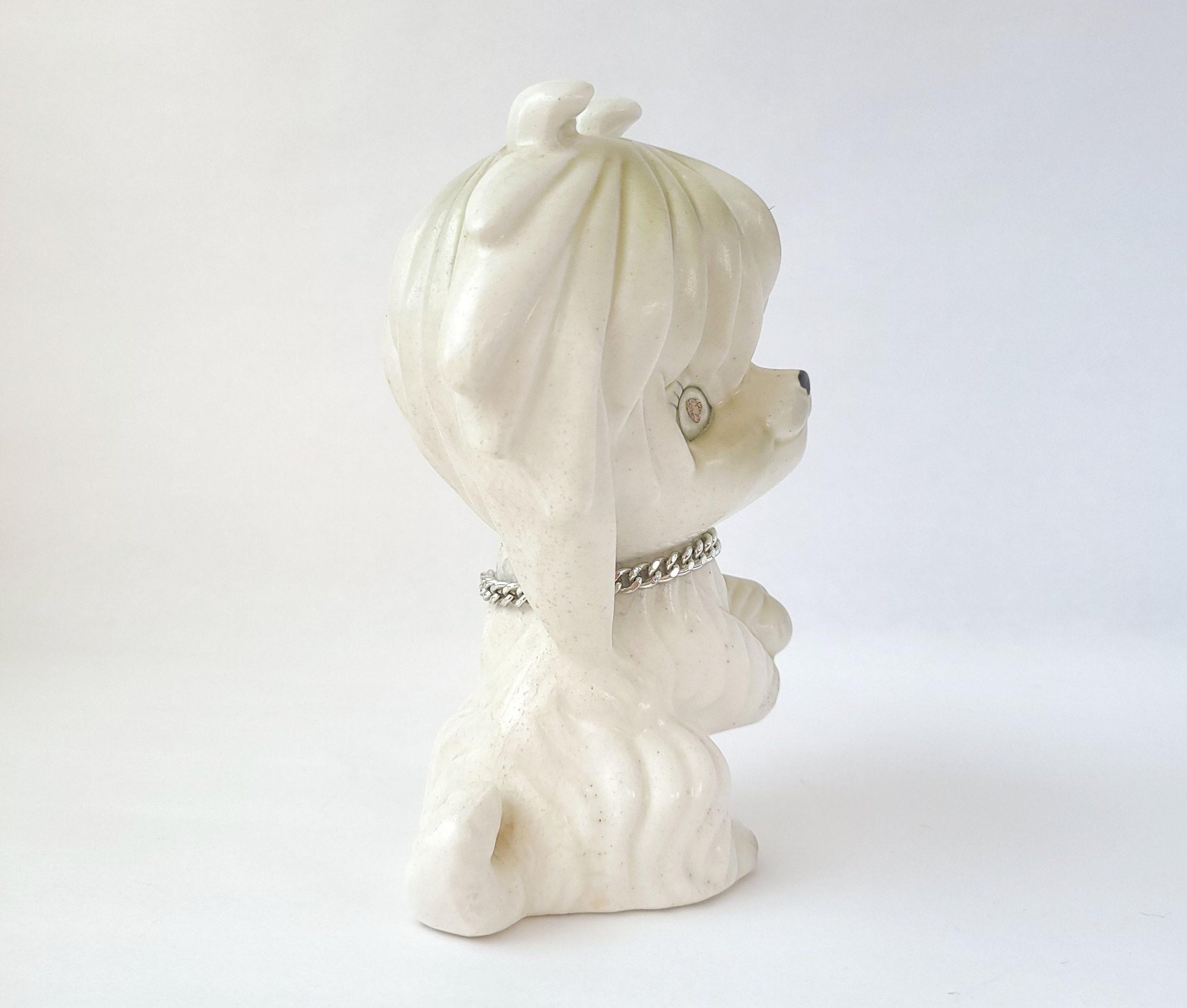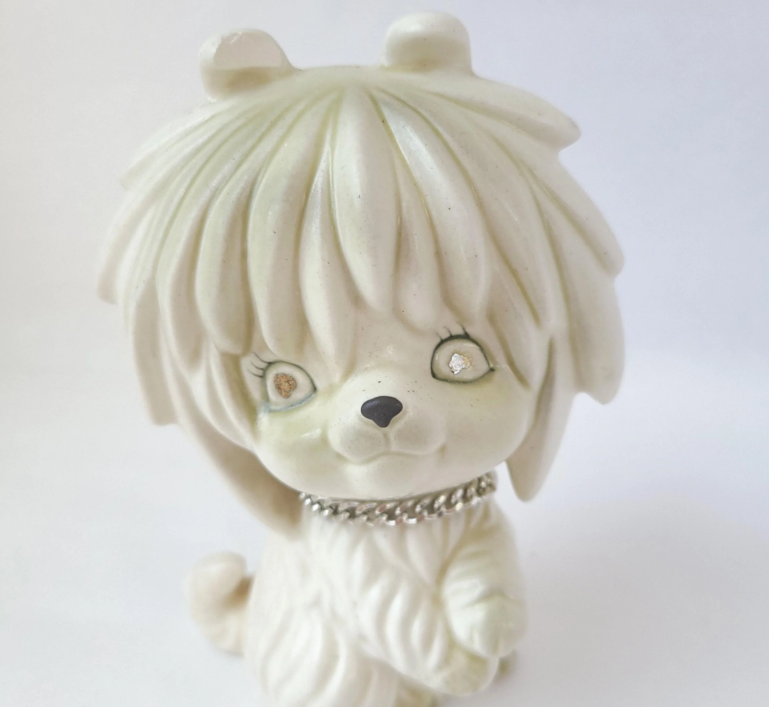 This adorable vintage ceramic dog figurine was made in Japan by Lego. The piece is in used condition and could use some love - so it's a great piece for restorers and crafty types. The piece has discoloration from age along with crazing to the glaze. There is a chip to both sides of one ear, the rhinestone eyes are missing, and there are some small chips along the coin slot.